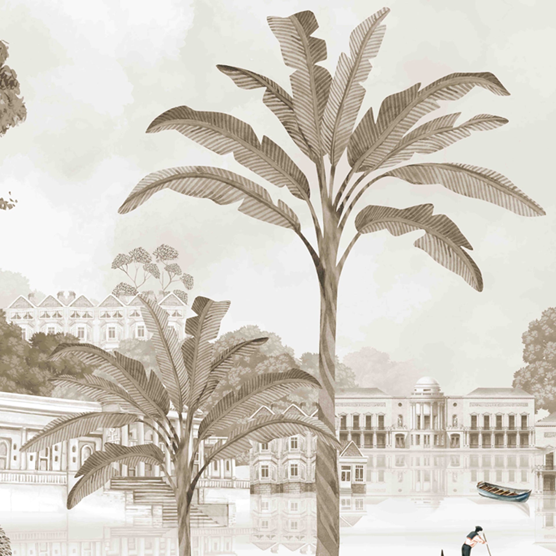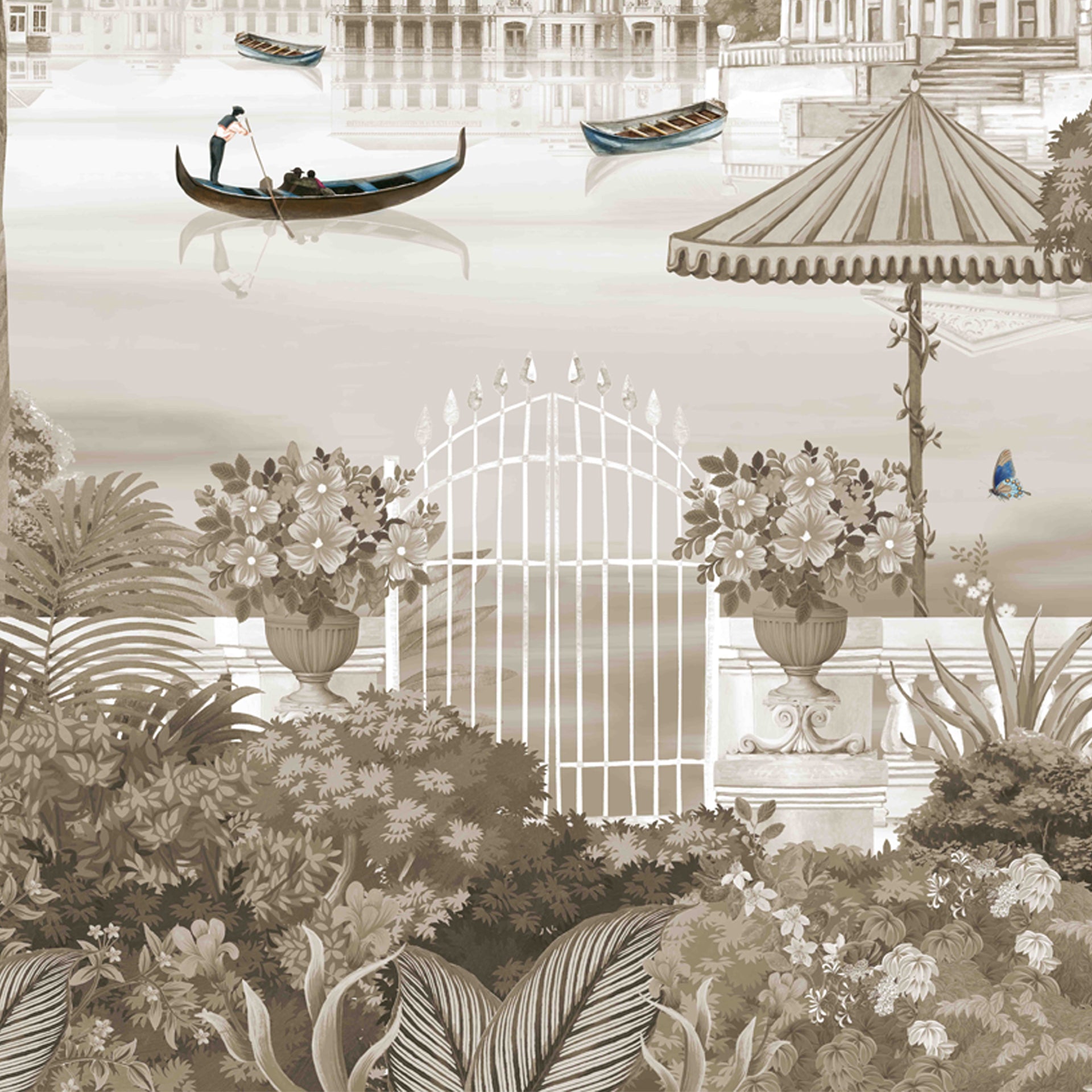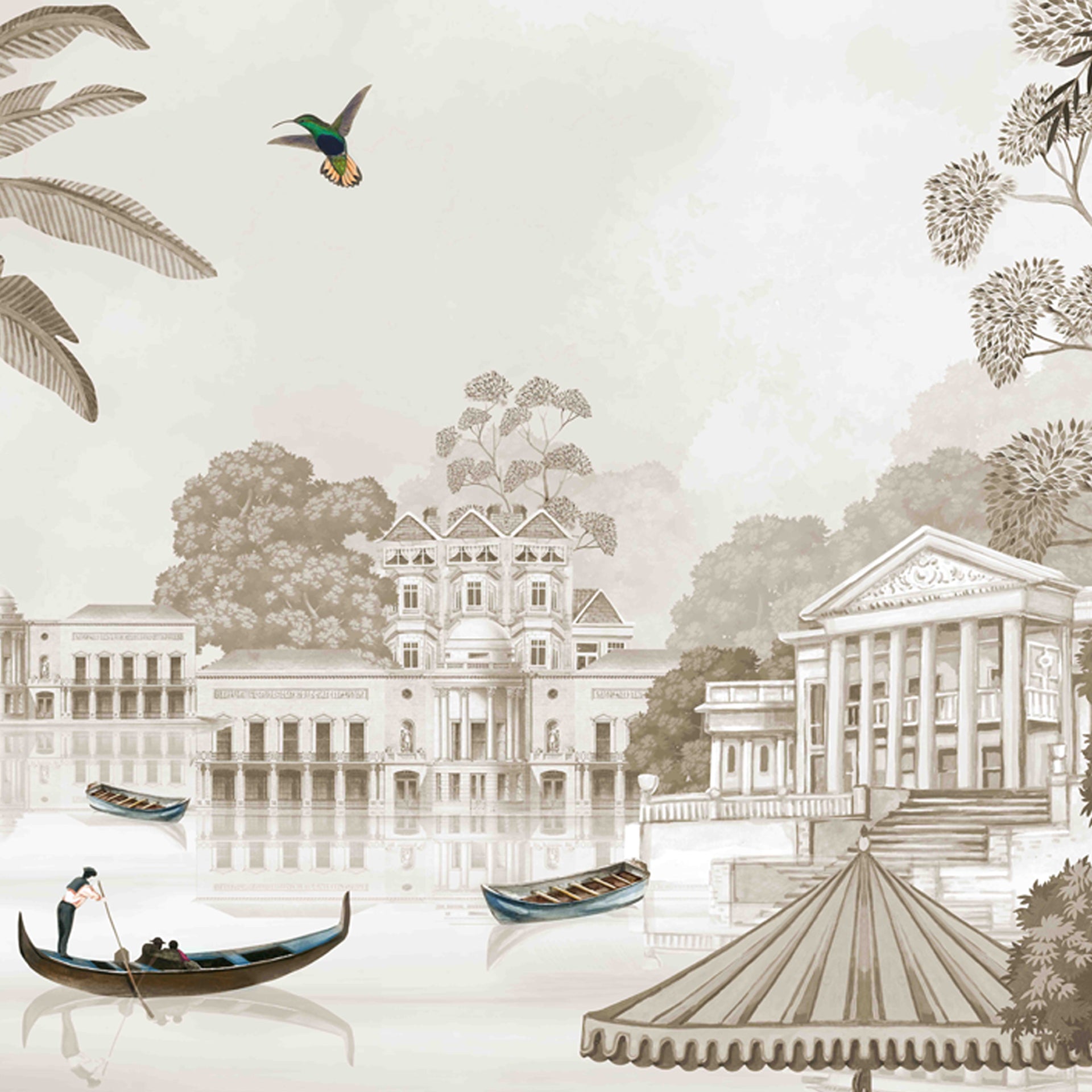 A tranquil scene featuring a lush riverside setting, elegant colonial-style architecture, a gondola gliding on a calm river, tropical vegetation, and vibrant birds against a soft atmospheric backdrop.