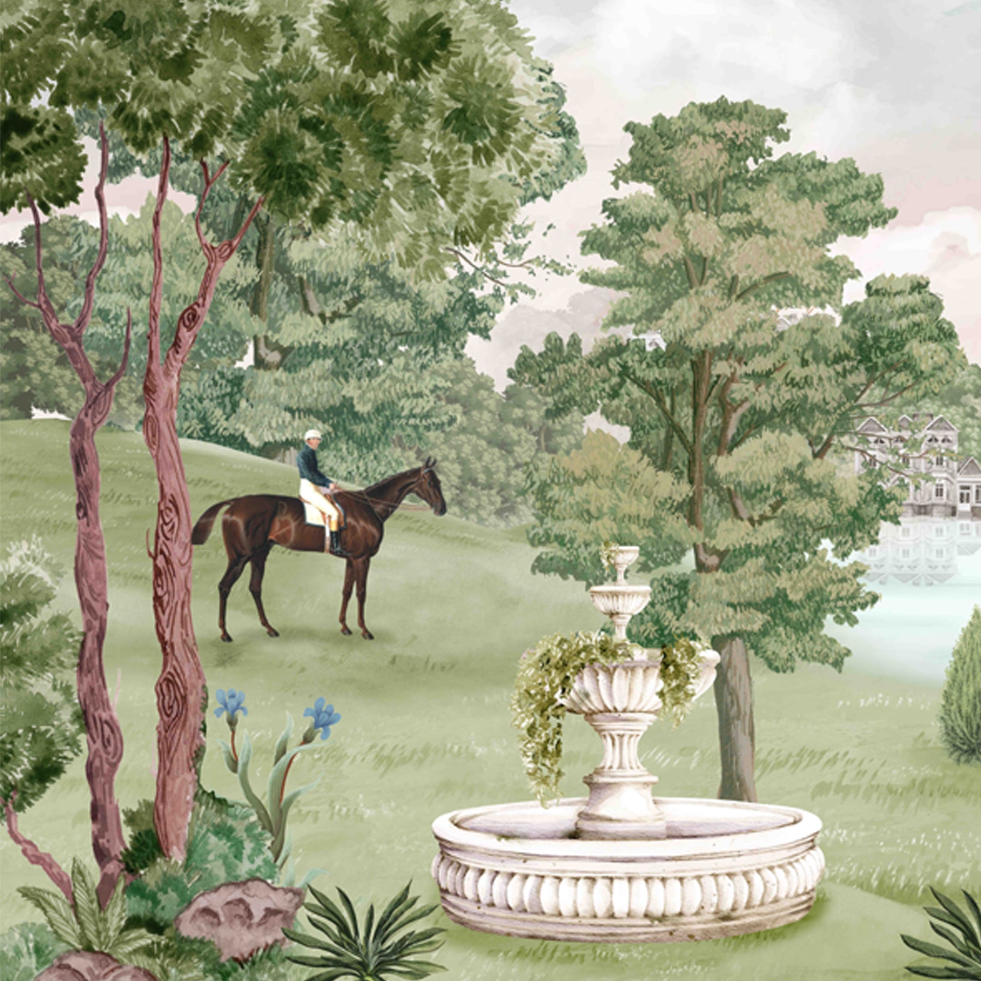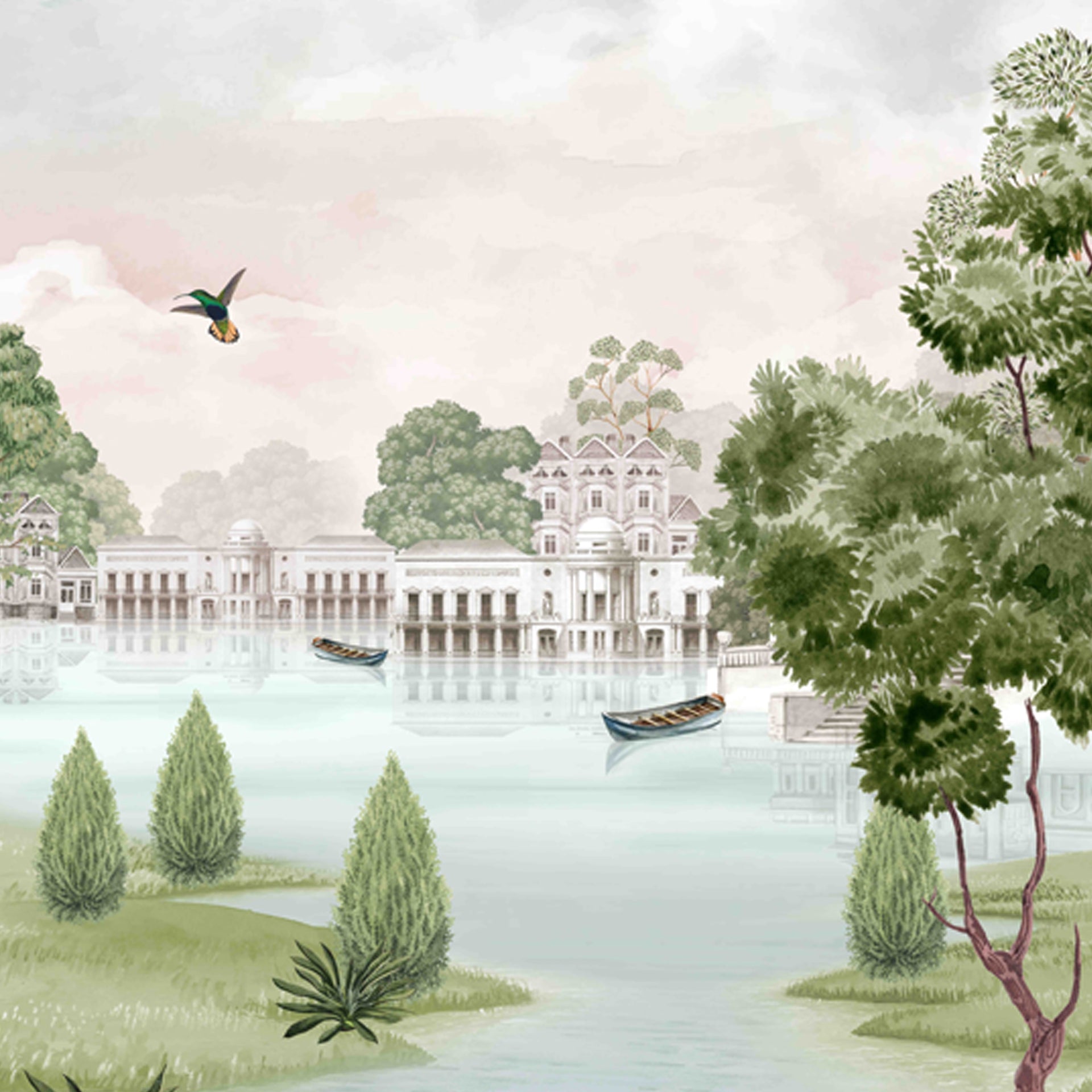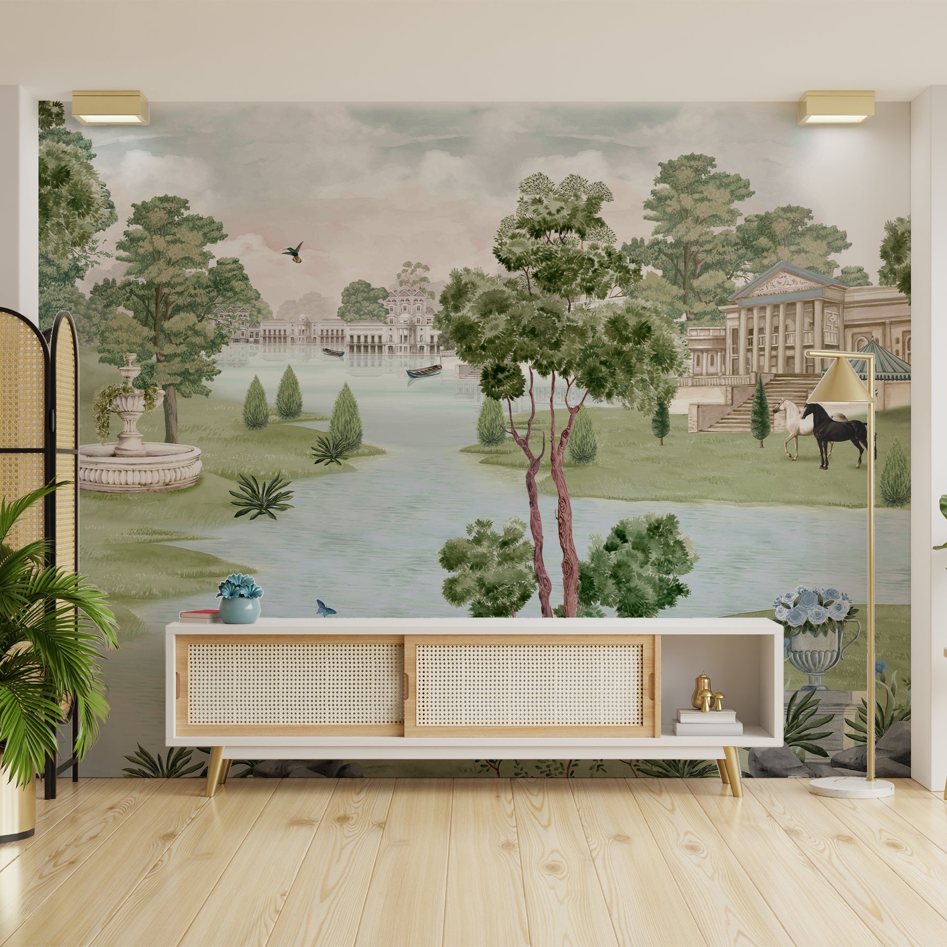 An artistic waterscape displaying lush greenery, a classical fountain, and sophisticated buildings set along serene water, exuding elegance and tranquility in a royal landscape setting.