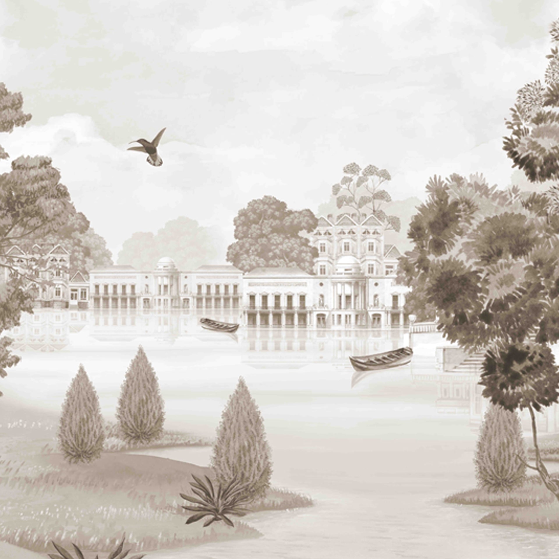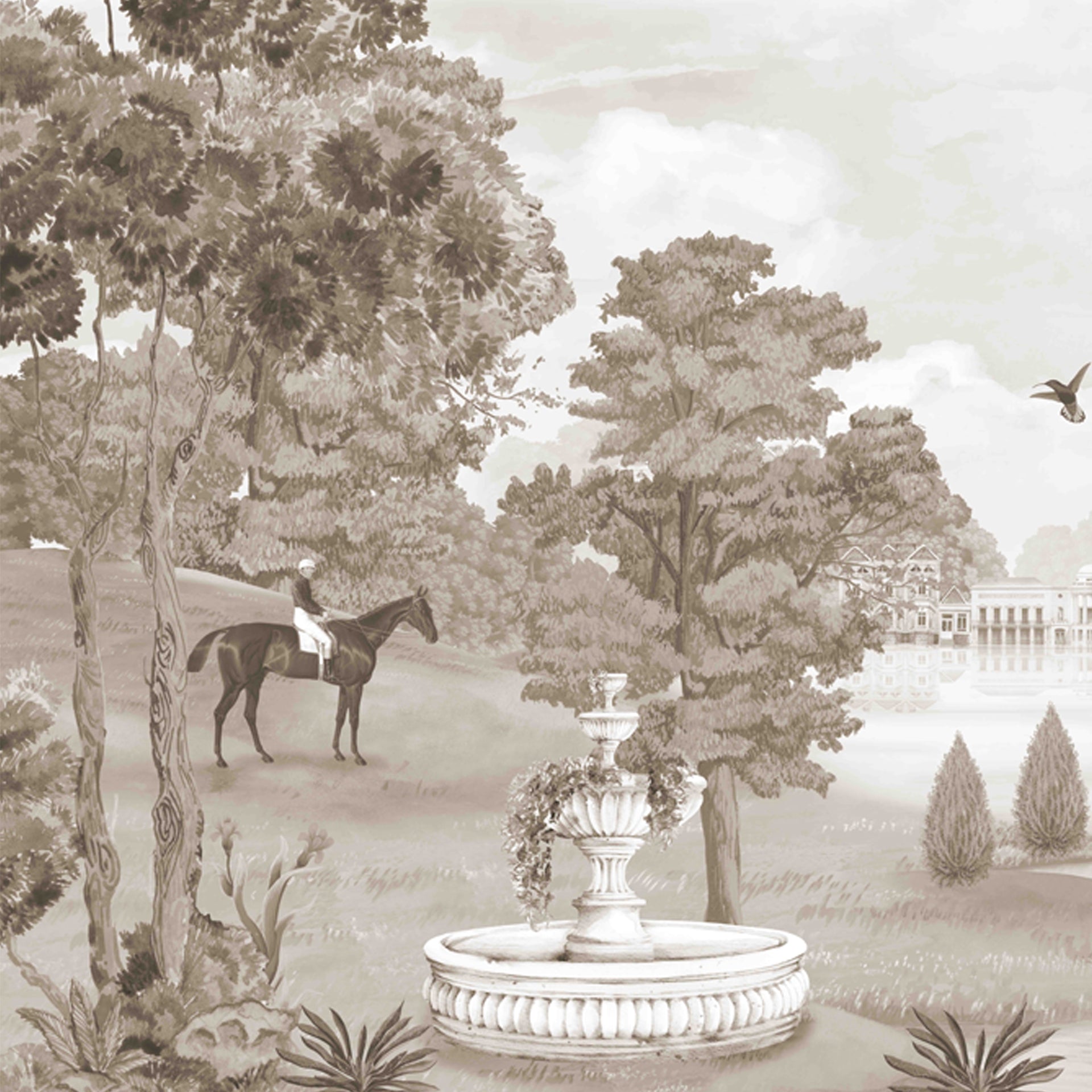 Vintage-inspired illustration depicting an elegant estate, serene waterscape, decorative fountain, and grazing horses, all set in a sepia tone for a timeless and elegant atmosphere.