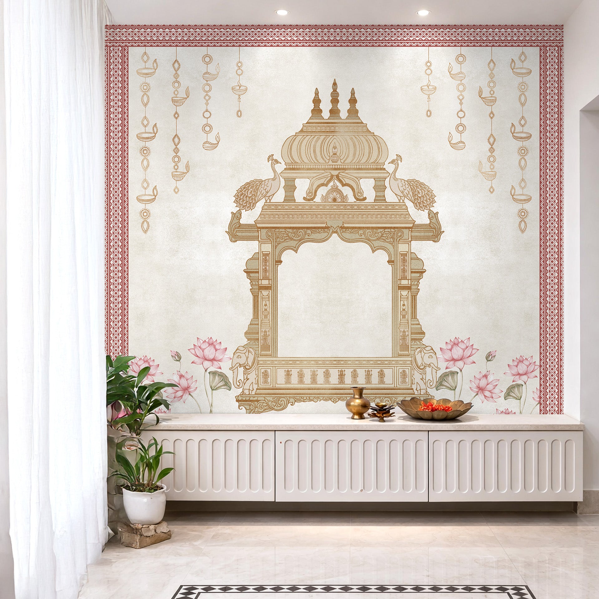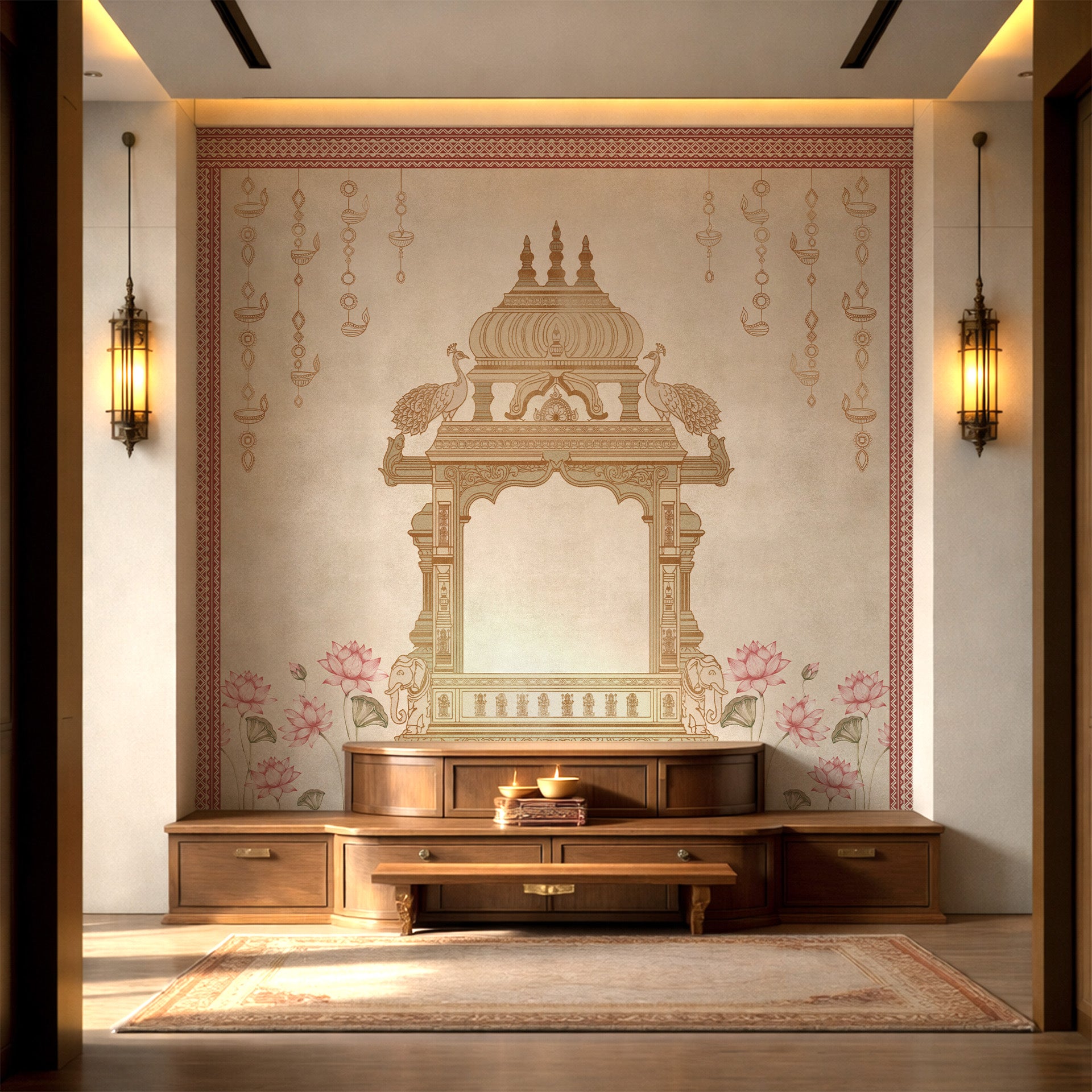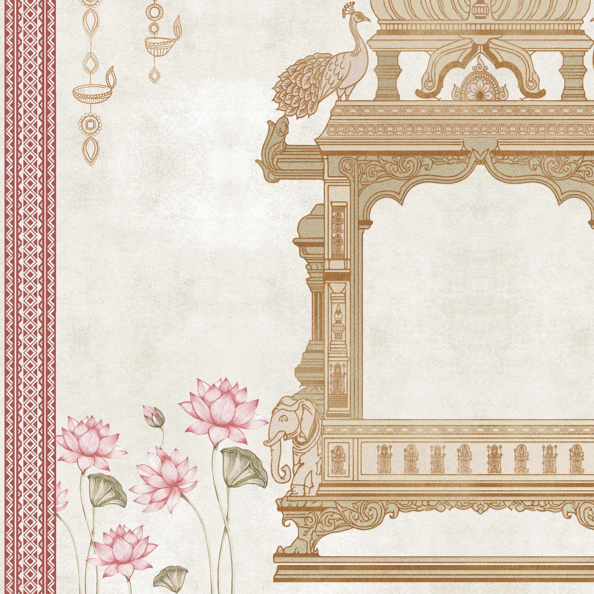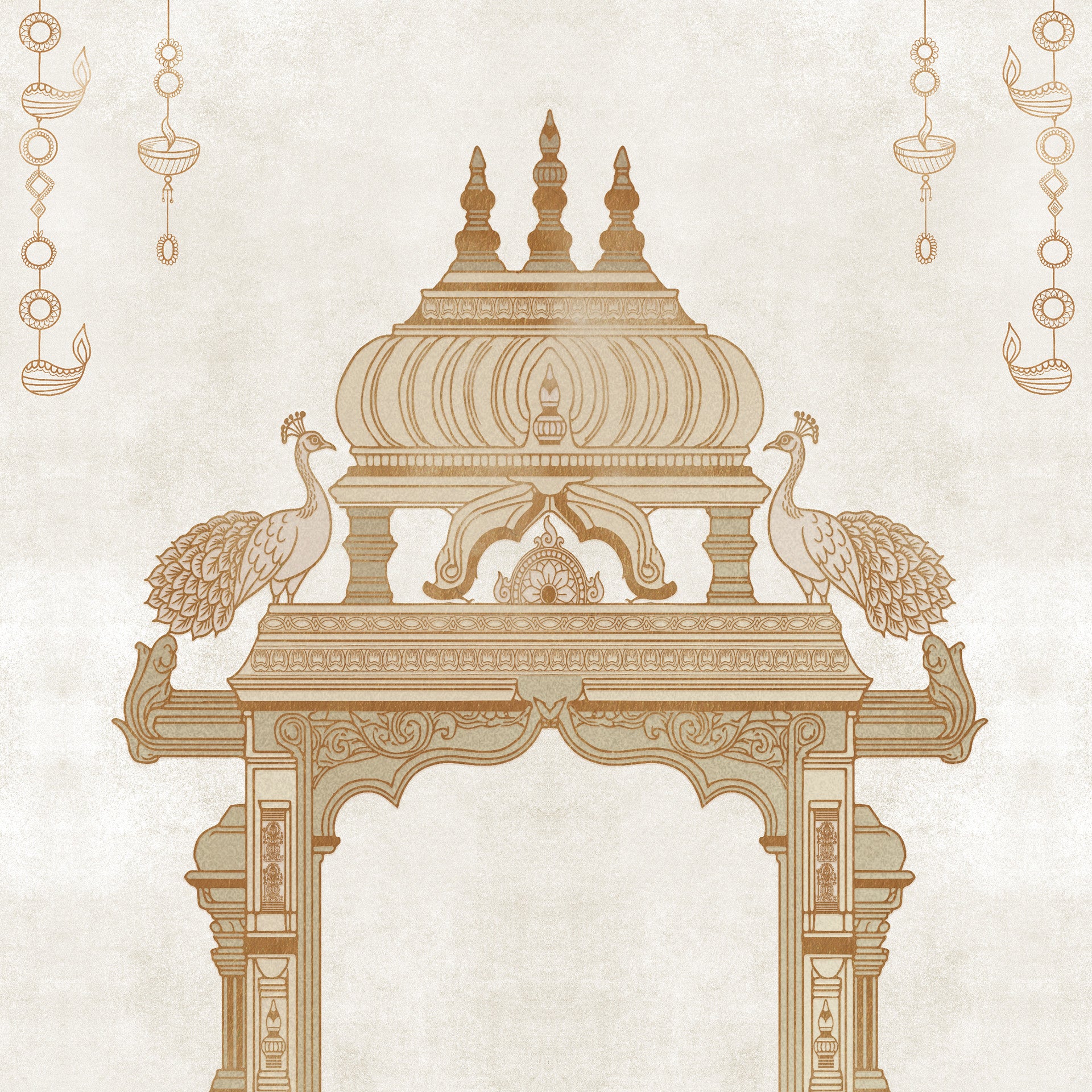 Elegant ornamental Indian mandap frame decorated with peacocks, lotus flowers and hanging lamps in a traditional temple style