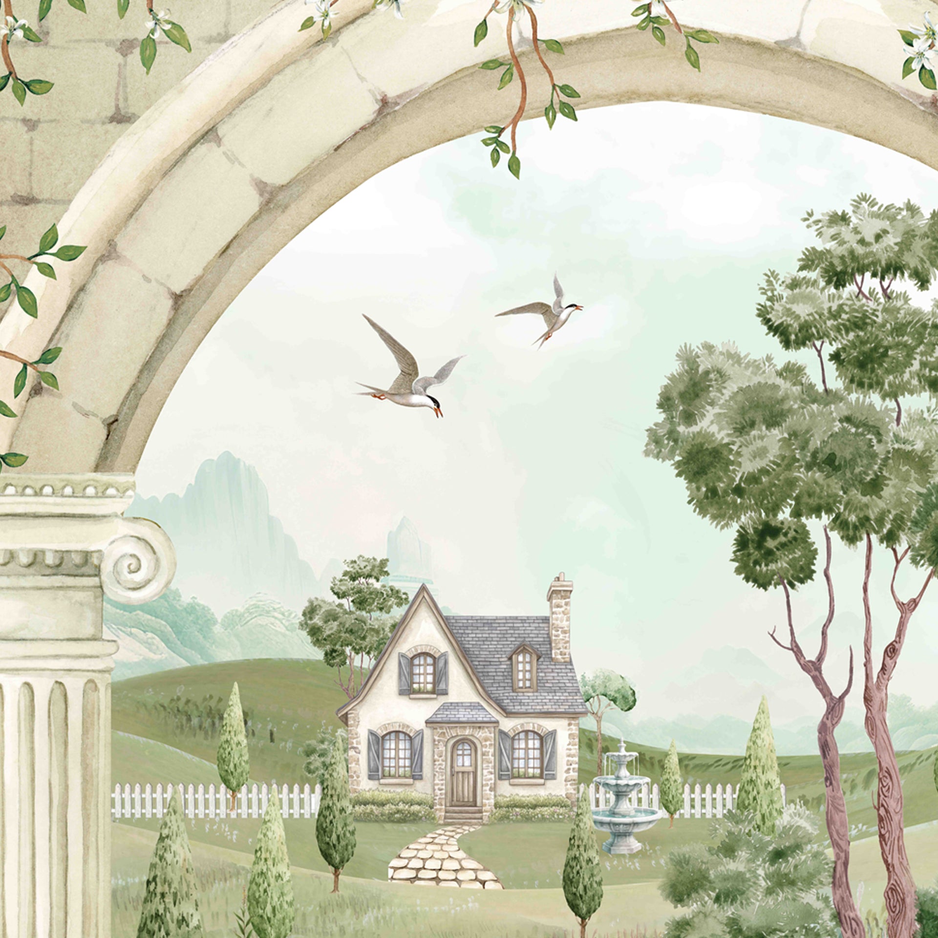 Charming scene depicting a cozy countryside cottage, a serene pond with swans, and vibrant flowers. Framed by an archway, this idyllic image conveys tranquility and the beauty of rural nature.