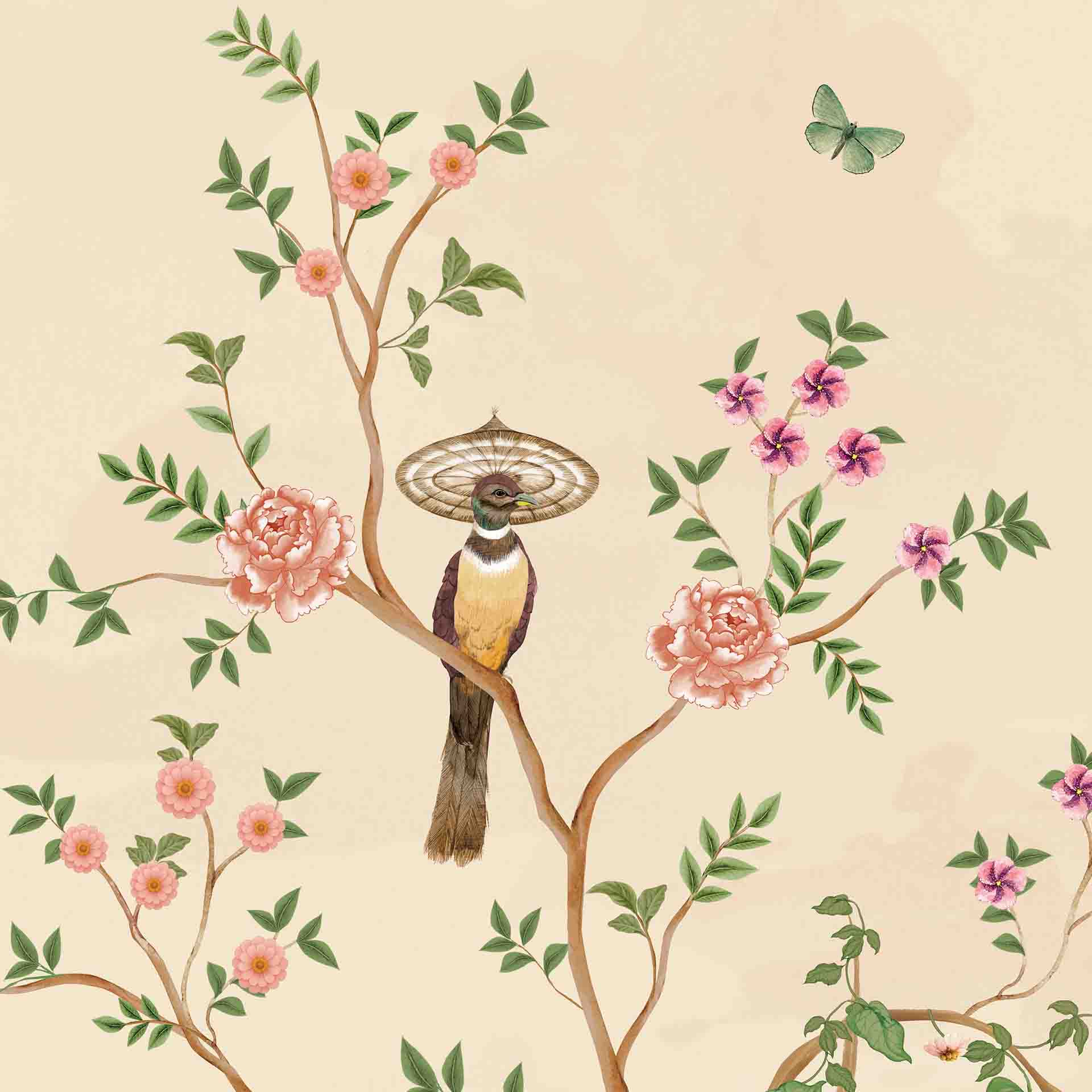 Delicate vintage-style botanical illustration featuring a twisting flowering tree with a perched bird, blooming peonies, butterflies and bees over a soft neutral backdrop for decorative or editorial use.