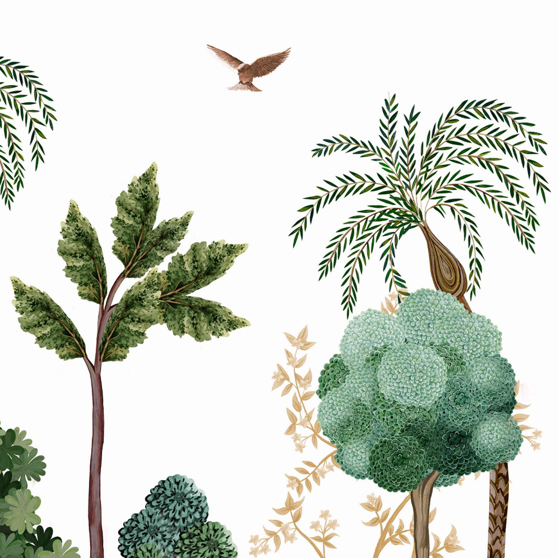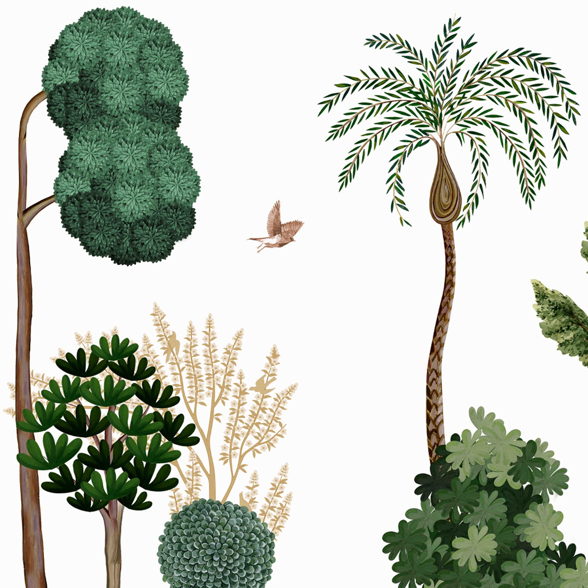 Vibrant illustration featuring palm trees, lush shrubs, and varied greenery against a light backdrop. Ideal for nature, jungle, eco, or tropical themed designs and stock visuals.