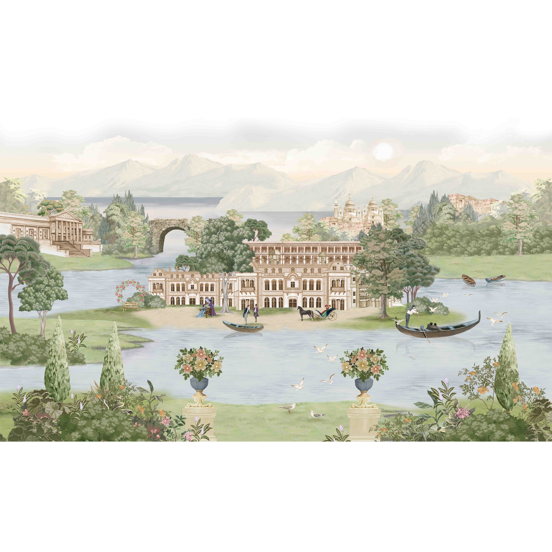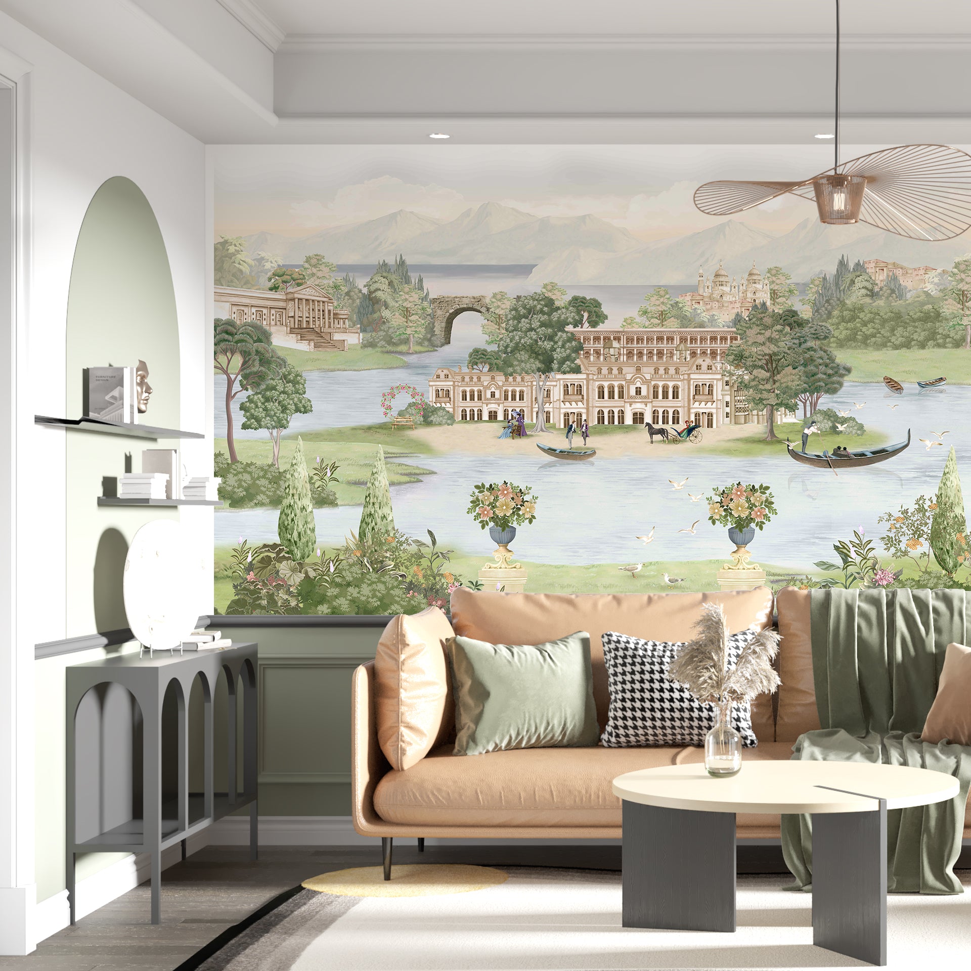 Scenic artwork featuring a serene lake with traditional architecture, picturesque bridges, and calm waters. Perfect for evoking elegance and tranquility.