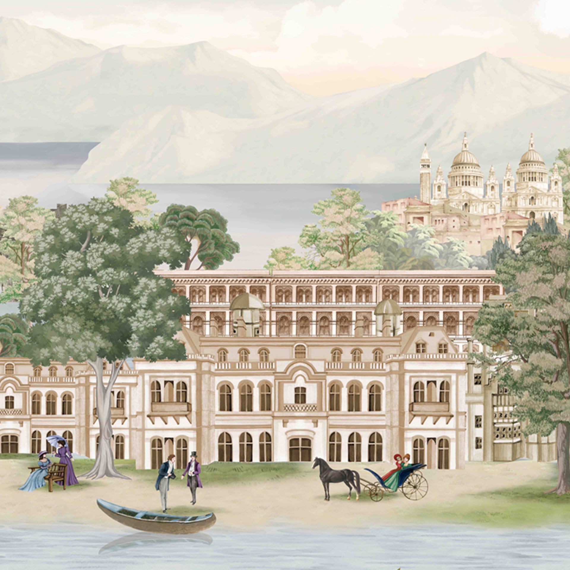 Island of Calm: A serene view of a grand palace situated on a quiet island