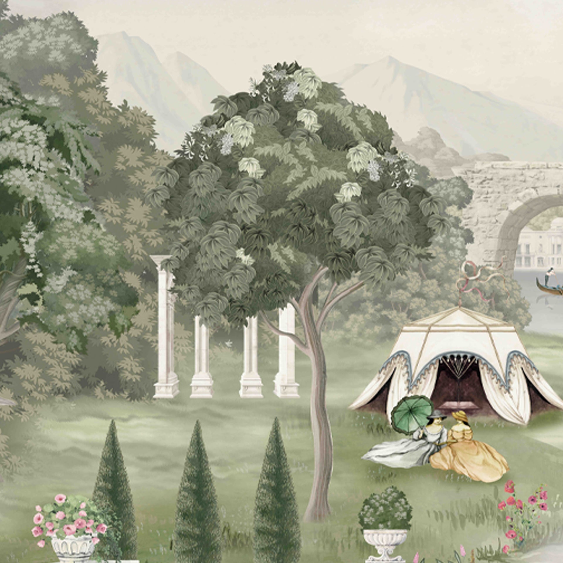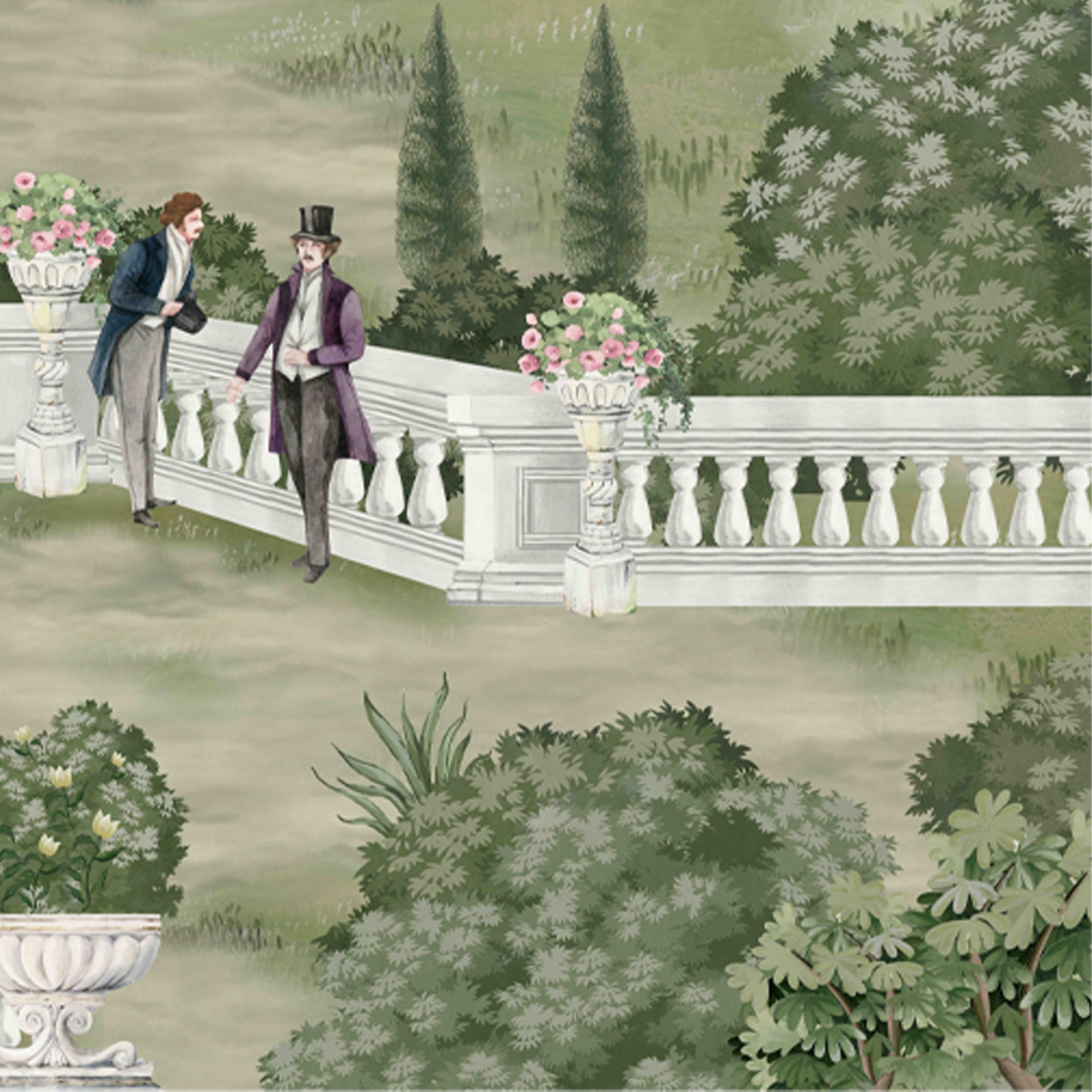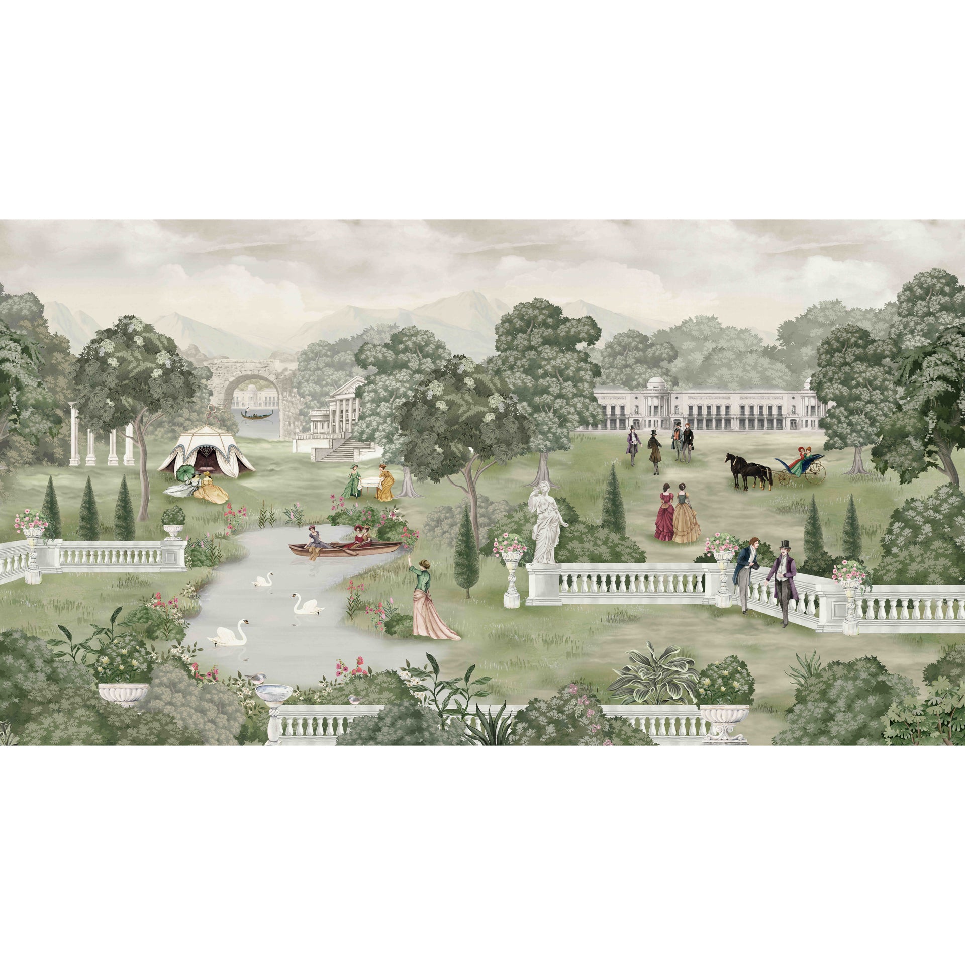 A serene Victorian-era park featuring elegant individuals amidst lush greenery, romantic pond, statues, and classical architecture. This painting evokes nostalgia, refinement, and timeless beauty in an idyllic outdoor setting.