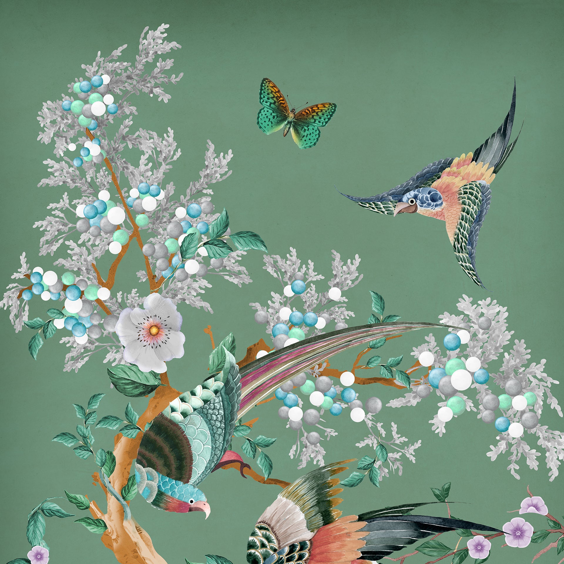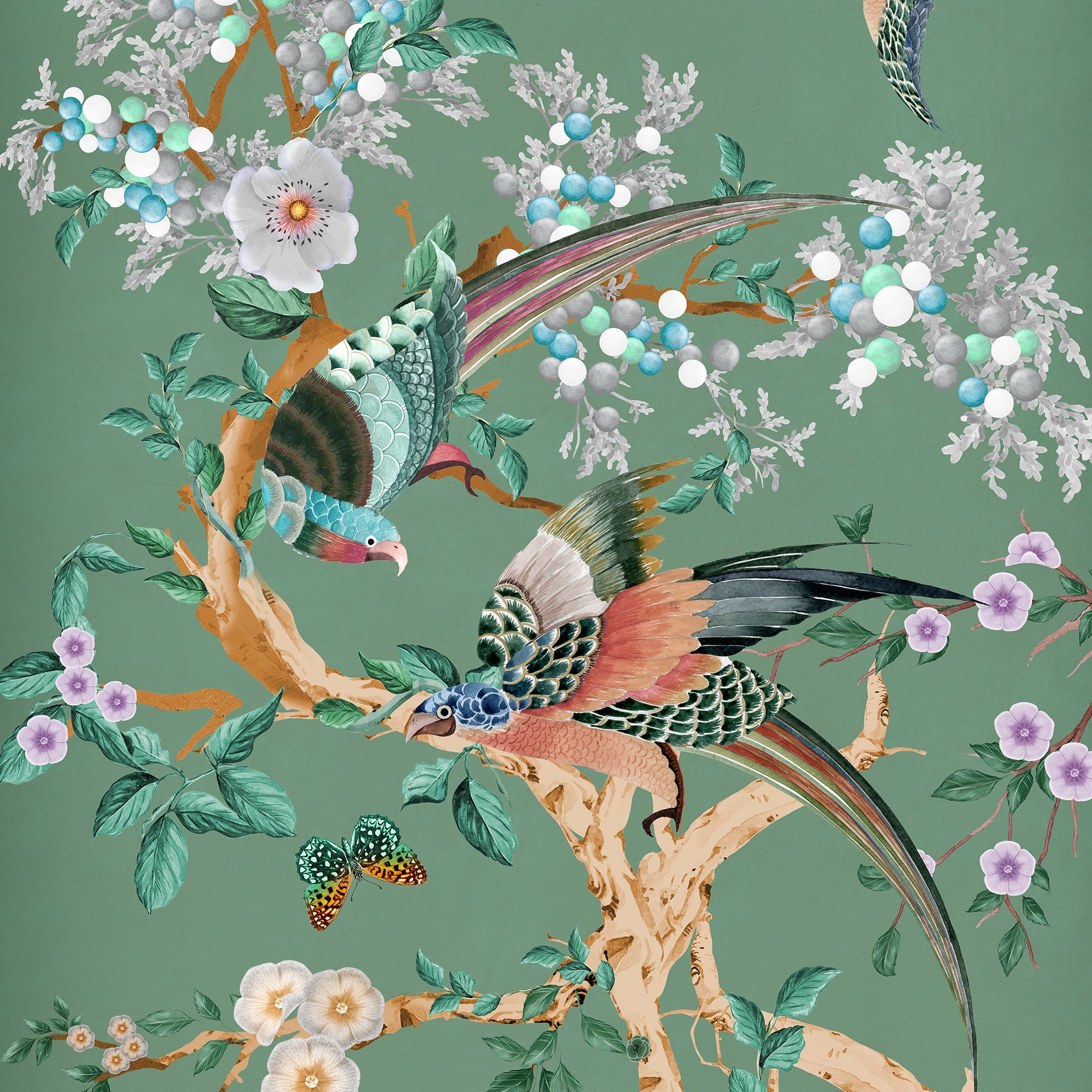 A lush green backdrop frames a decorative tree with blossoms, birds, and butterflies in ornate, Asian-inspired design. This botanical scene conveys elegance, nature, and tranquil beauty suitable for art and decor visuals.