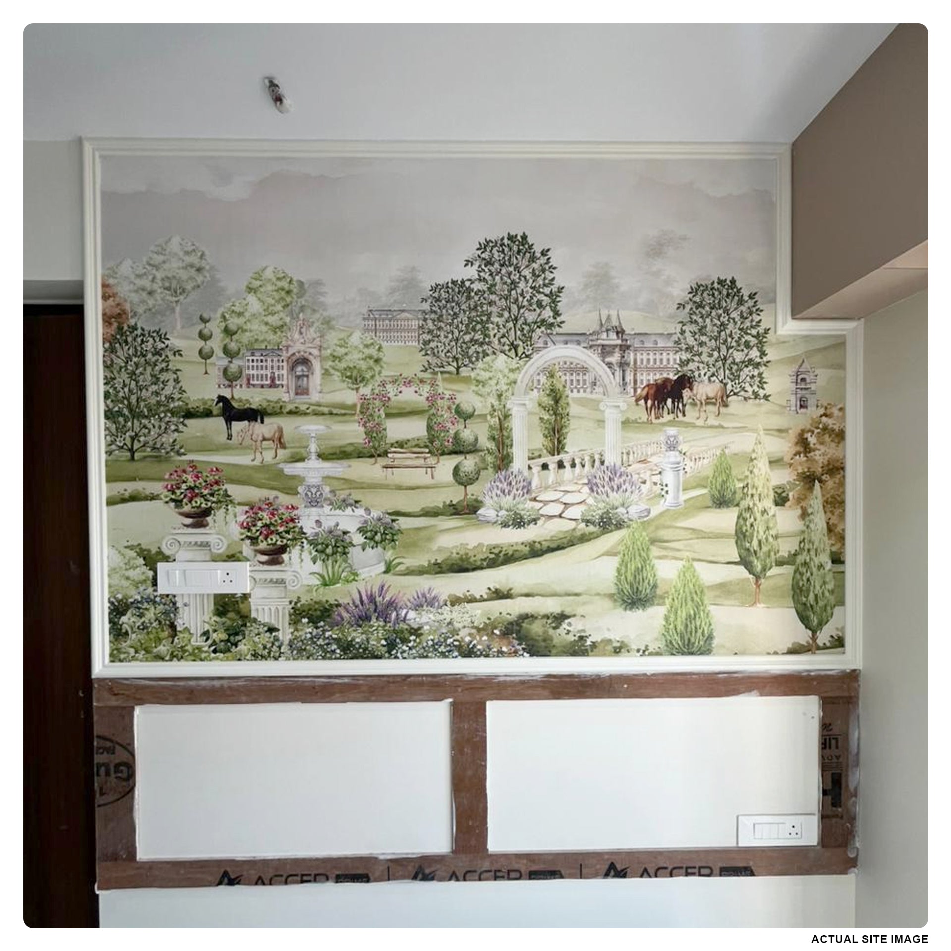 A tranquil historic garden scene featuring ornate columns, fountains, arches, blooming flowers, neatly trimmed shrubs, and grazing horses. Perfect for luxury, estate, or botanical themes in editorial and product contexts.