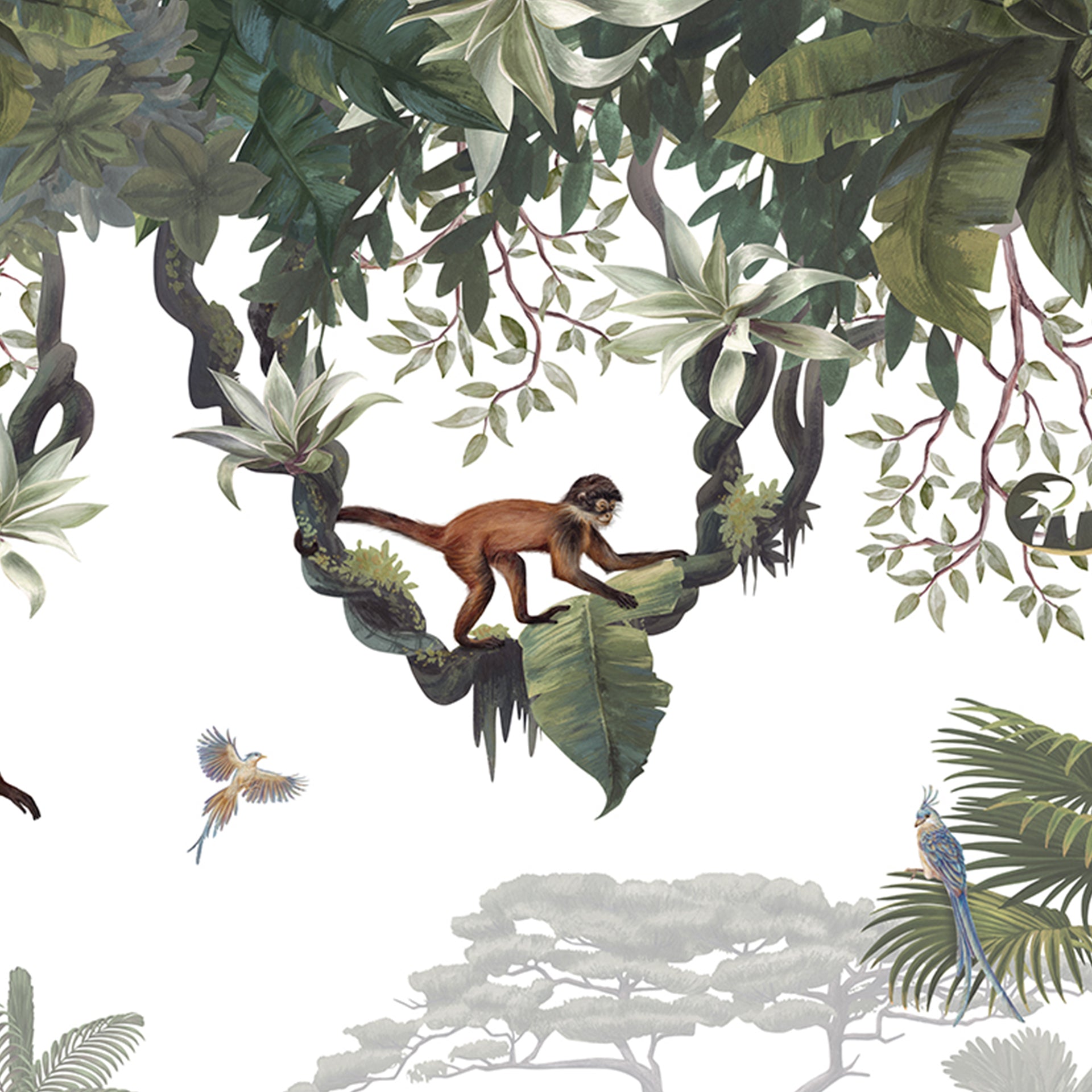 Cheeky-Monkeys: Lush Jungle wallpaper' With Monkeys And Tropical Birds Hanging On Branches In Dense Canopy
