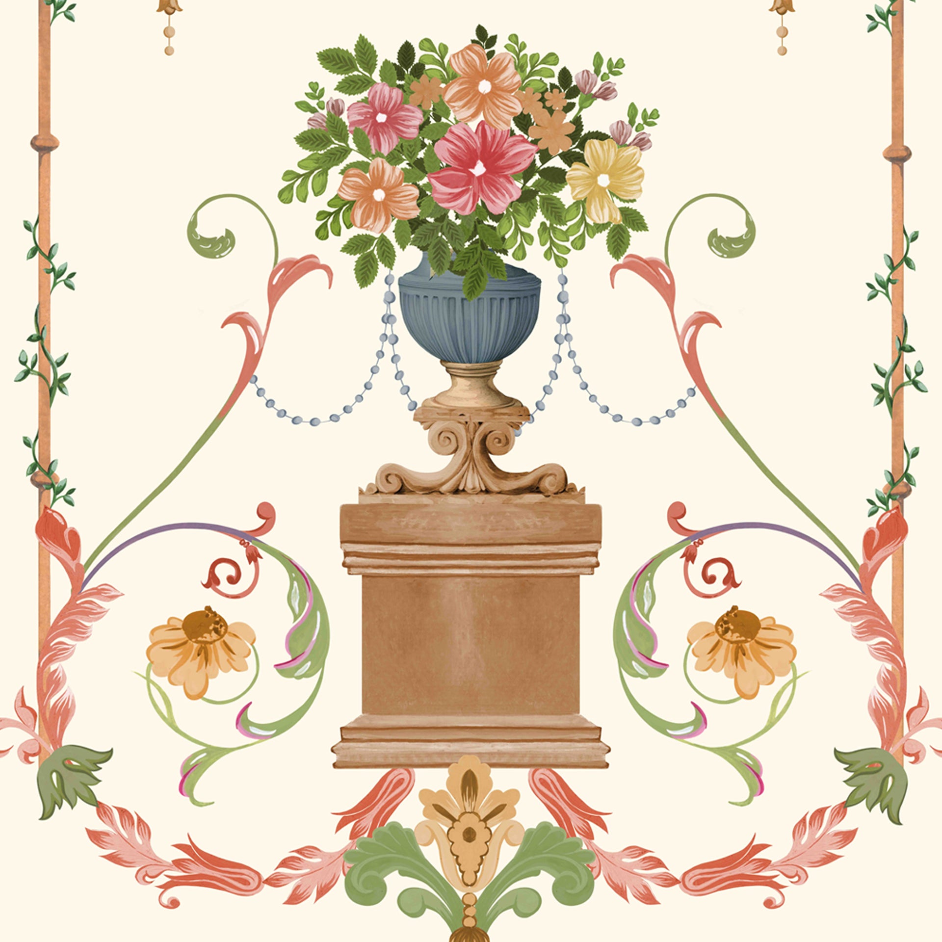 Intricate baroque-style illustration featuring a floral arrangement, ornate detailing, and harmonious botanical patterns, exuding sophistication and classic design aesthetics suitable for artistic and decorative contexts.