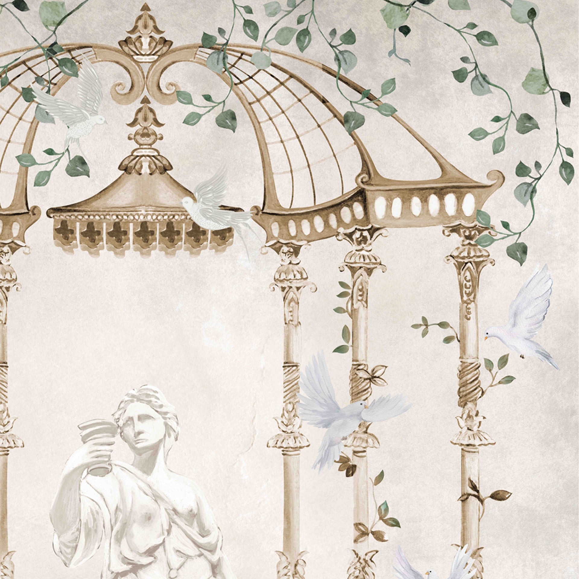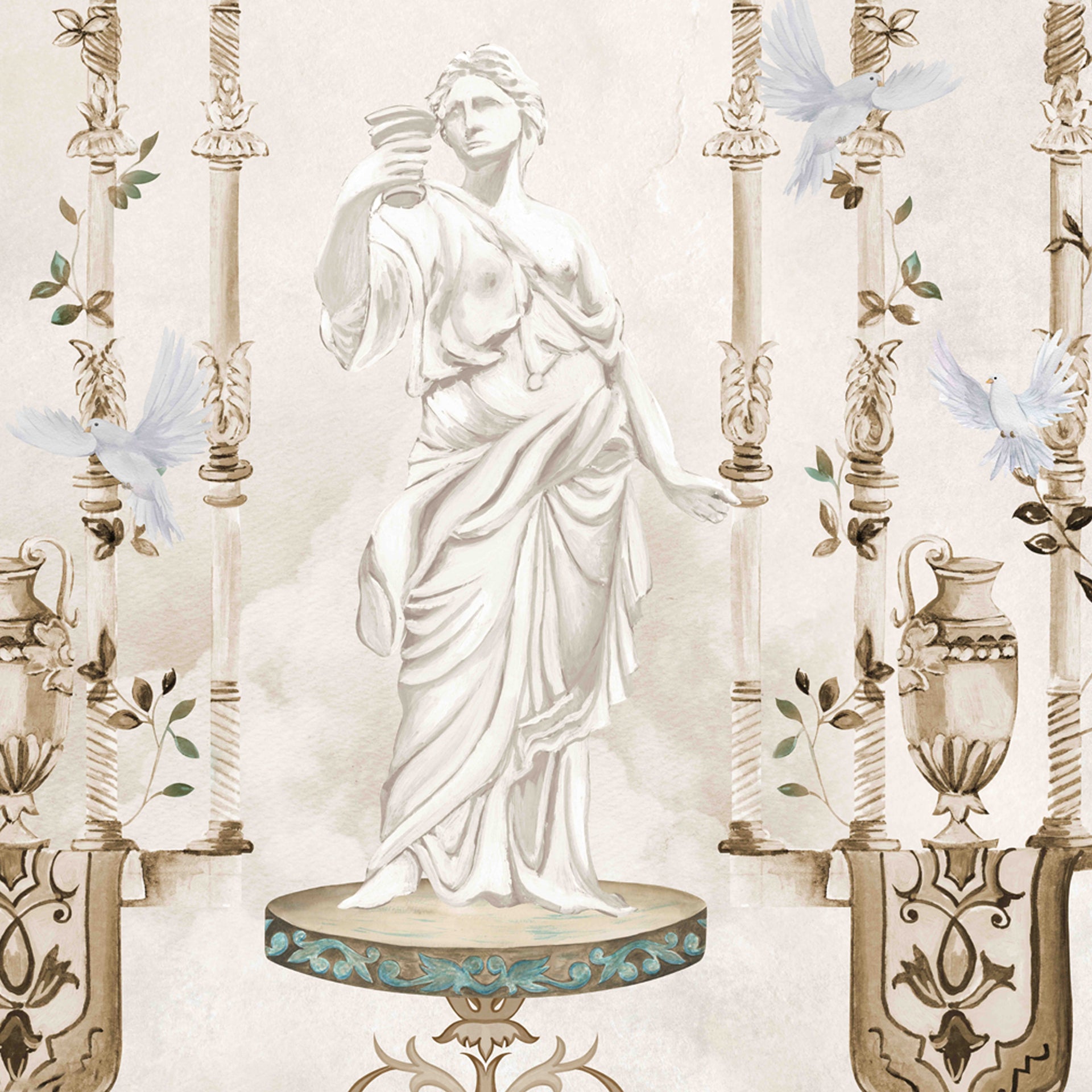 A breathtaking artwork displaying a classical statue surrounded by intricate garden-inspired designs and flying doves, evoking feelings of sophistication and tranquility.