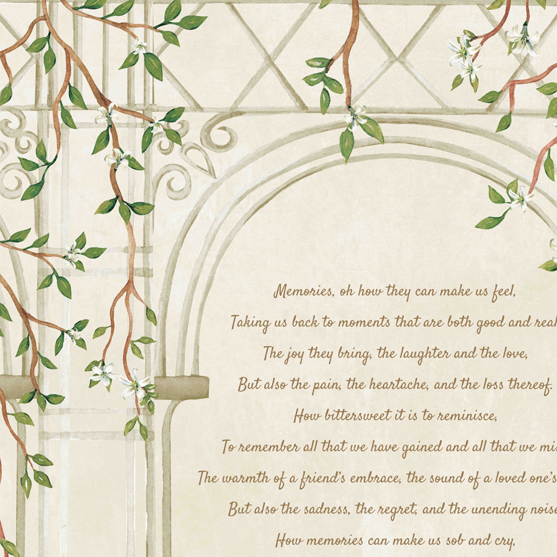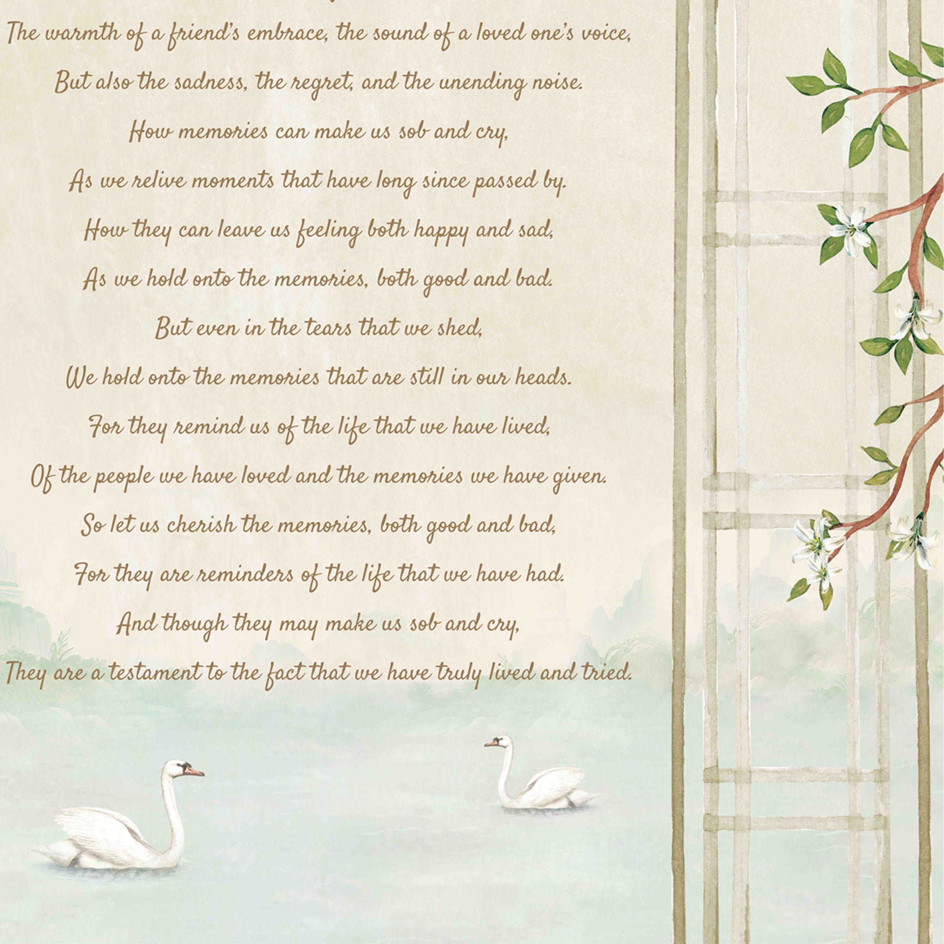 A warm and sentimental poetic verse depicted with intricate floral details and calm swans by the lake, evoking reflective and heartfelt emotions. Perfect for decorative, literary, and inspirational themes.