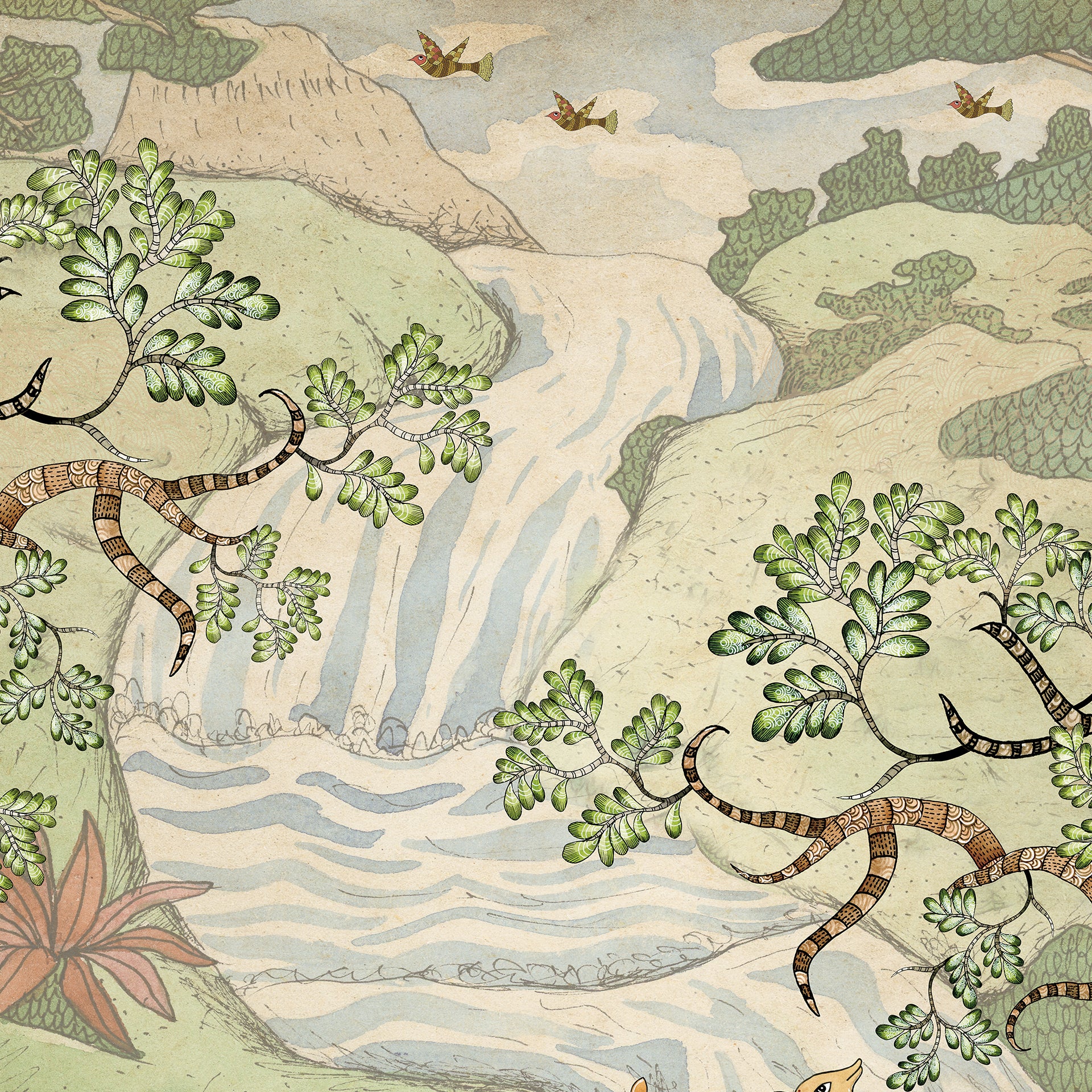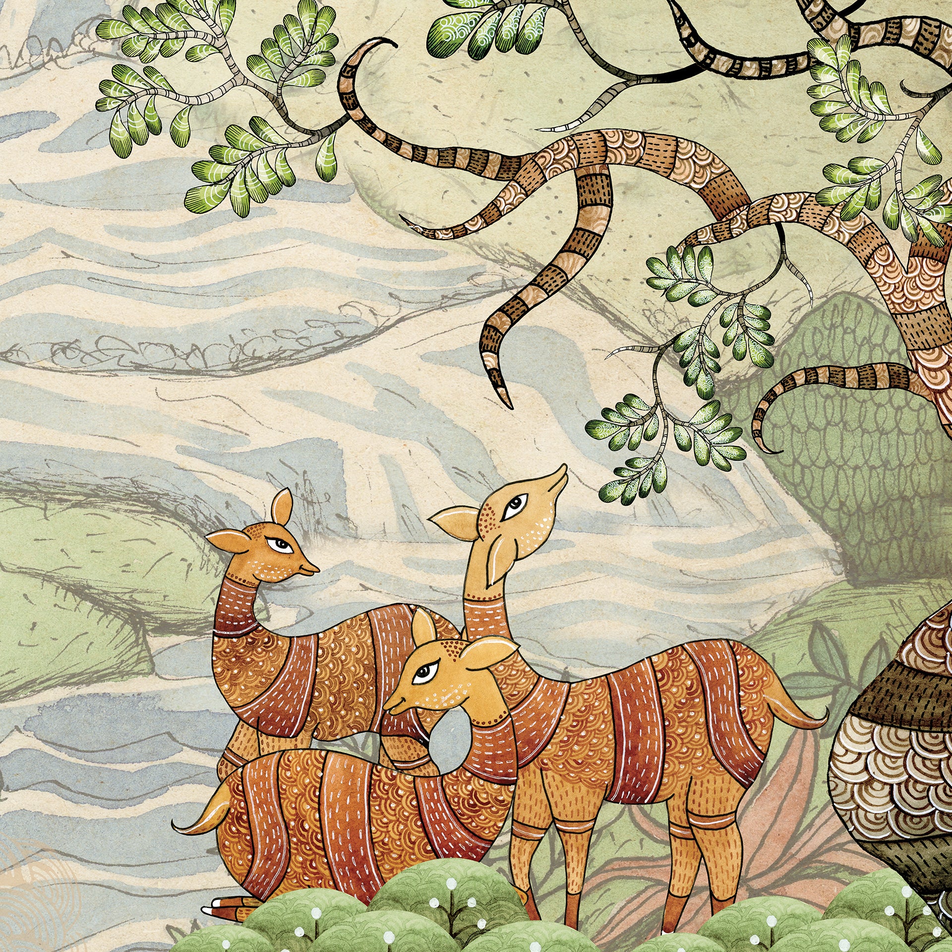 Forest Lullaby: Traditional Indian Artwork Depicting Nature, Animals, And A Serene Landscape
