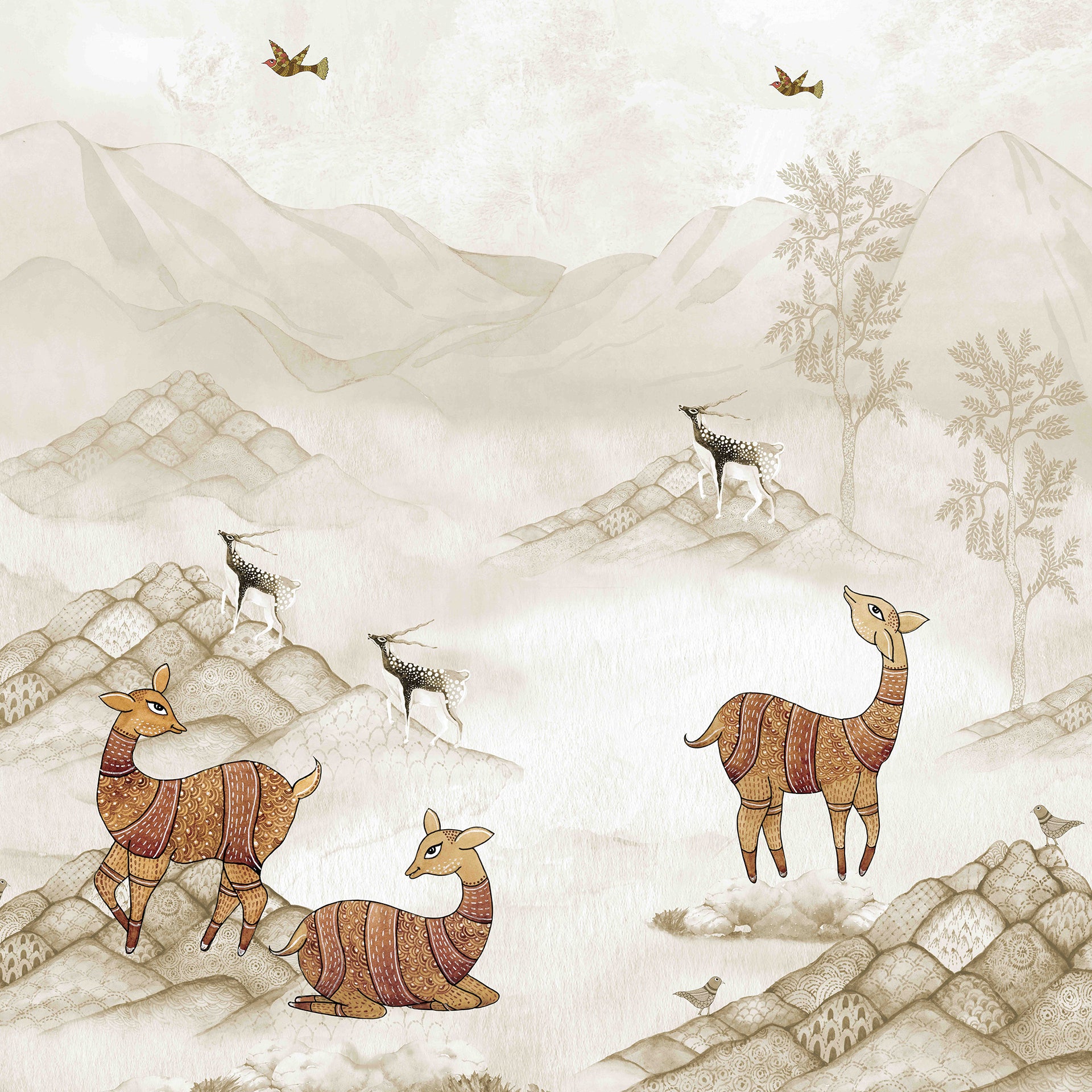 >Illustration of llamas in a serene mountainous landscape, emphasizing nature's beauty and animals' grace in a tranquil artistic composition. Birds enhance the peaceful atmosphere of this scenic natural setting.