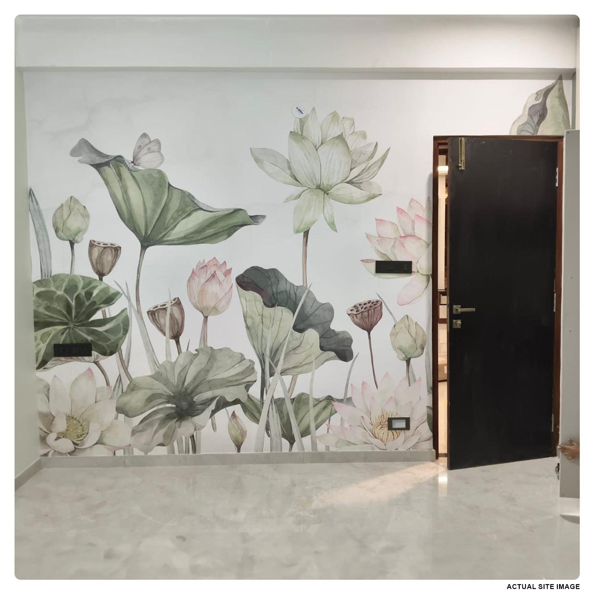 Huge lotus motif wallpaper in water brings a calming elegance to spaces. This lotus wallpaper is perfect for showrooms, living room or malls.