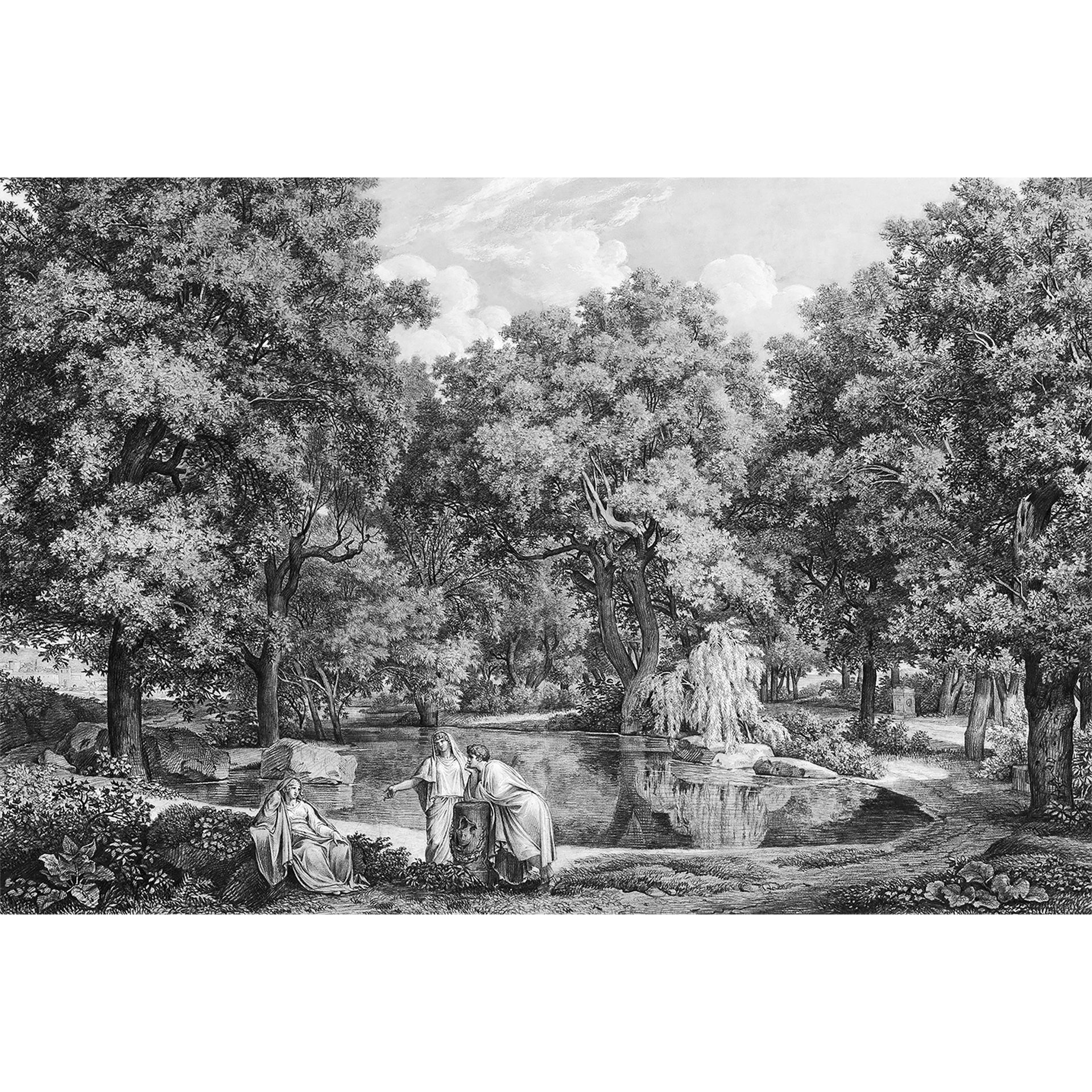 Black and White Lakeside Talk Wallpaper Mural featuring a serene lakeside landscape rendered in a classic monochrome palette. This sophisticated mural adds a historic and calming ambiance to any room, making it perfect for living rooms, bedrooms, or office spaces.