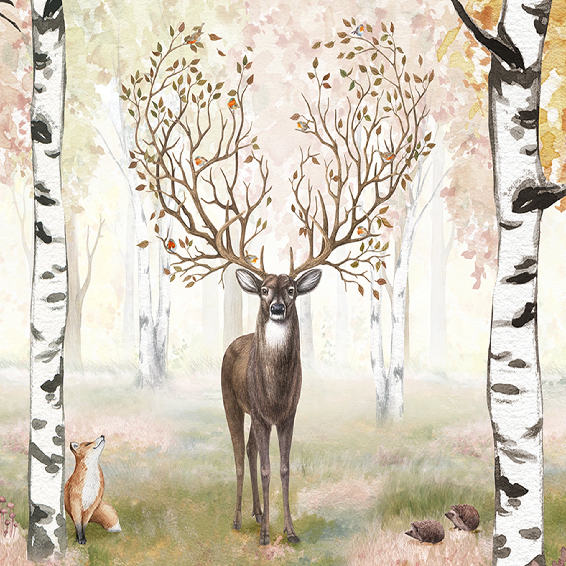 A whimsical watercolor woodland scene featuring a stag with antler branches, birch trees, and small animals like rabbits and squirrels. Warm fall colors evoke peaceful nature, family moments, and seasonal charm.