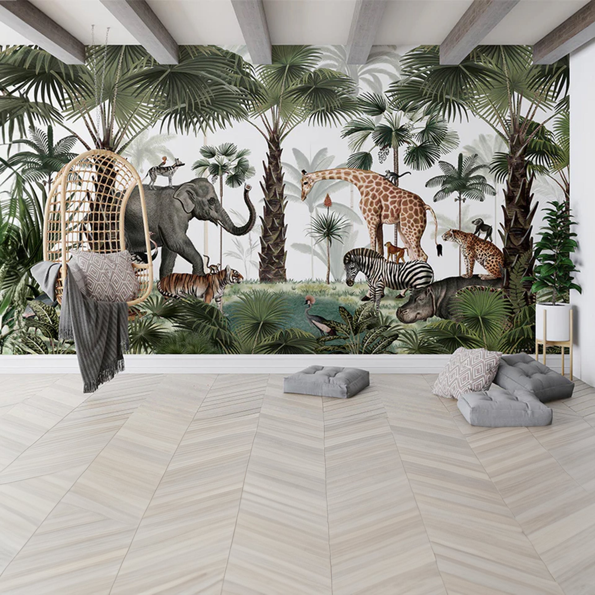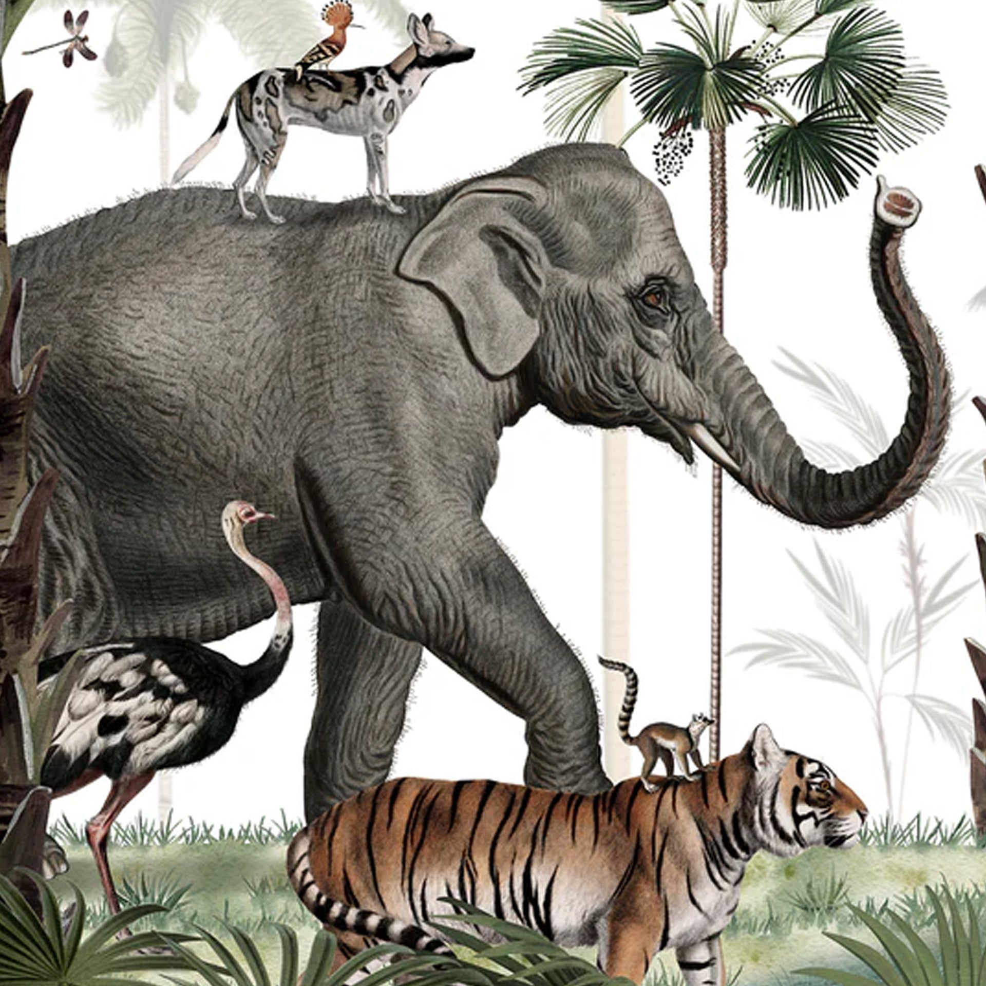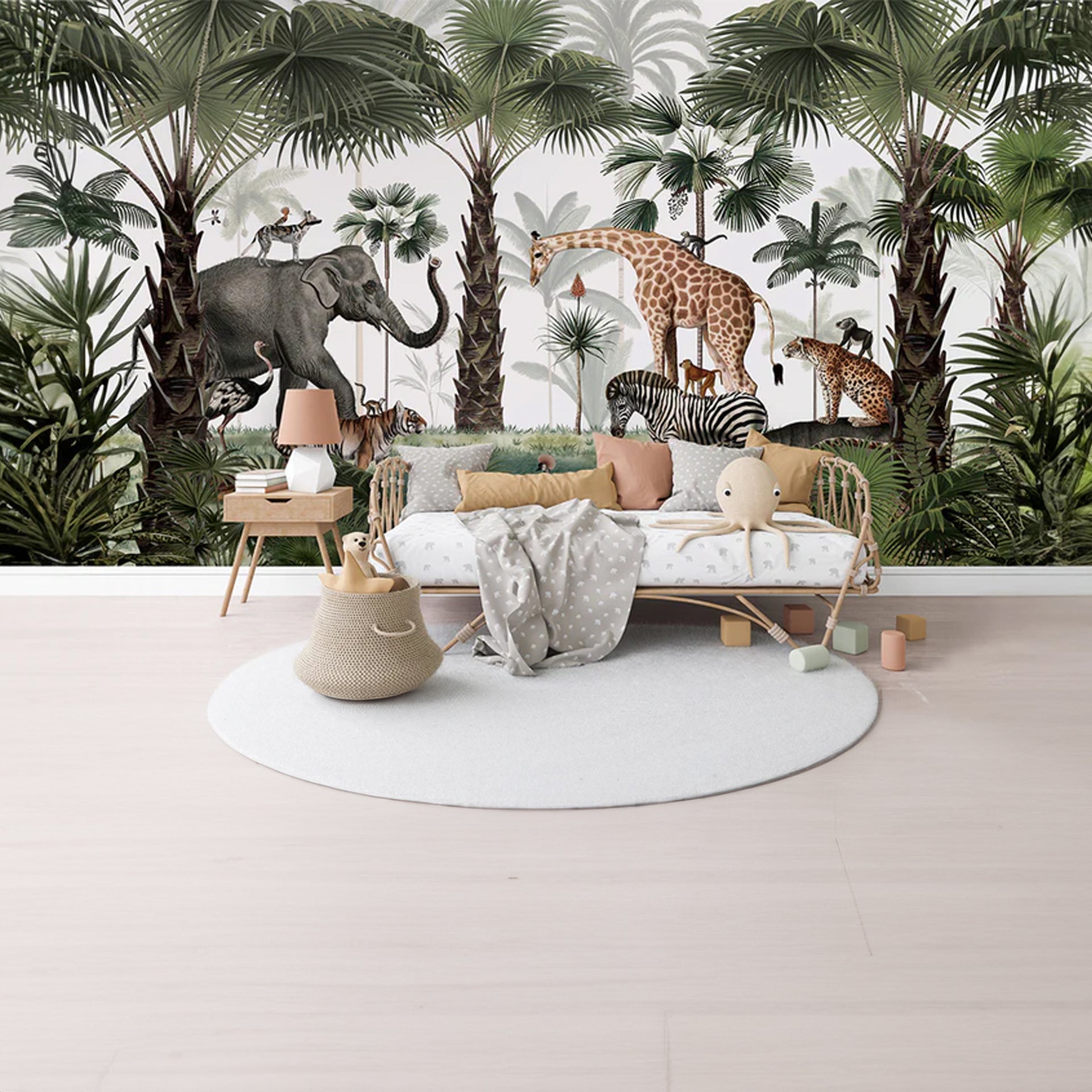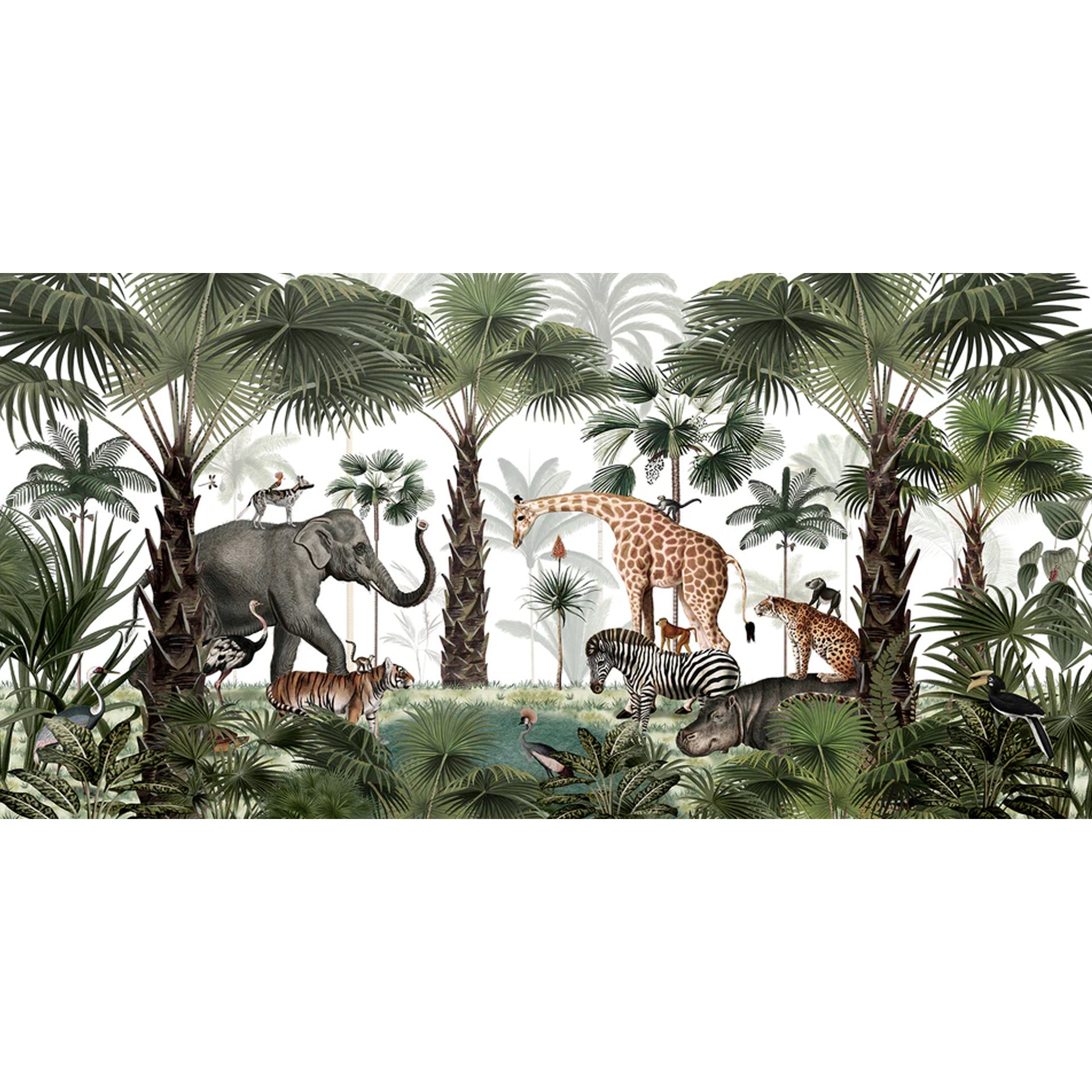 A lush jungle scene featuring elephants, giraffes, zebras, tigers and more amid palm trees and dense foliage. Wildlife in a tropical rainforest setting conveys adventure, biodiversity, and natural beauty.