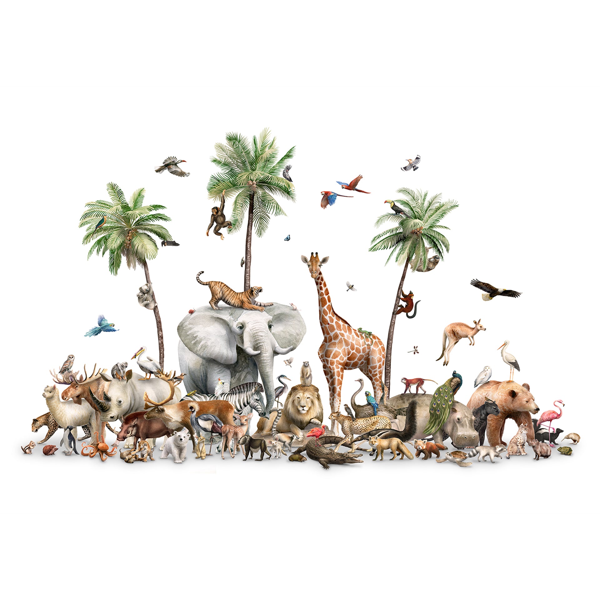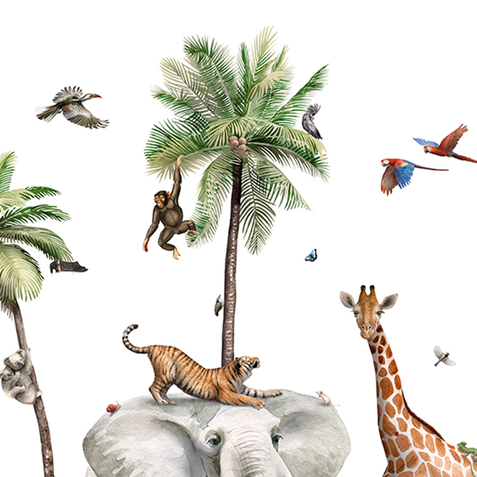 A lively, colorful scene featuring a variety of wildlife in a jungle setting. Elephants, giraffes, lions, tigers, and a swarm of birds create a rich, family-friendly panorama of nature’s diversity.