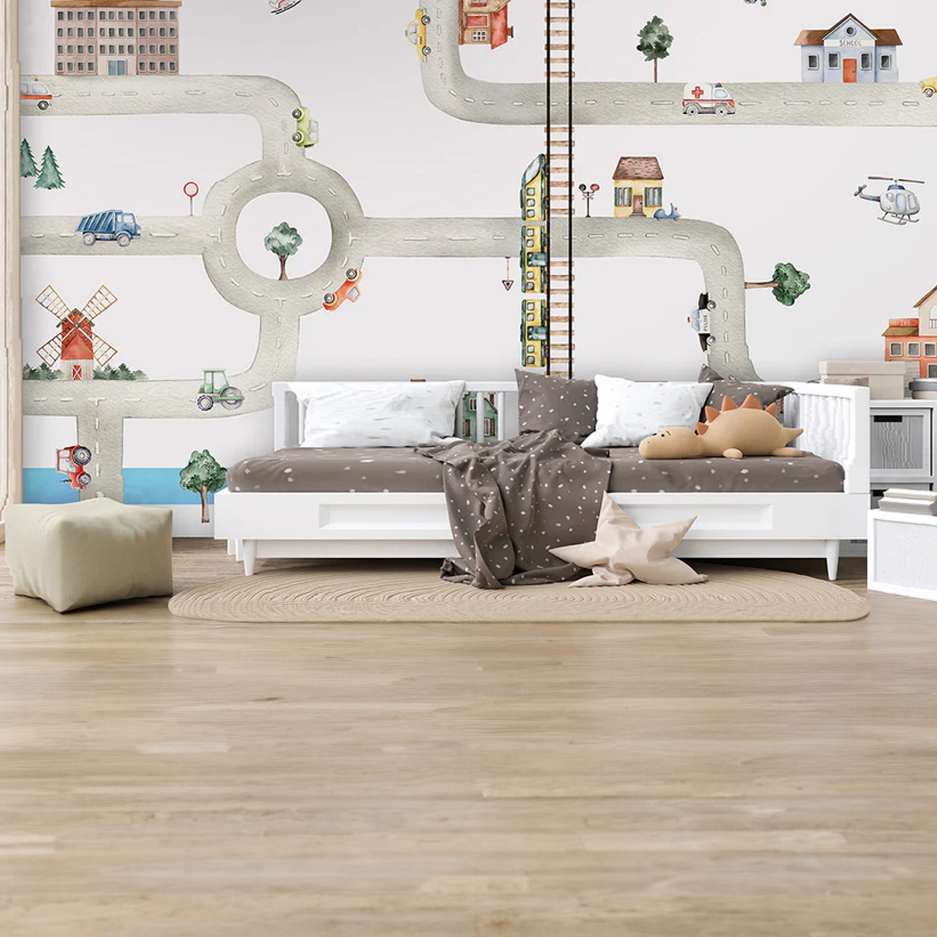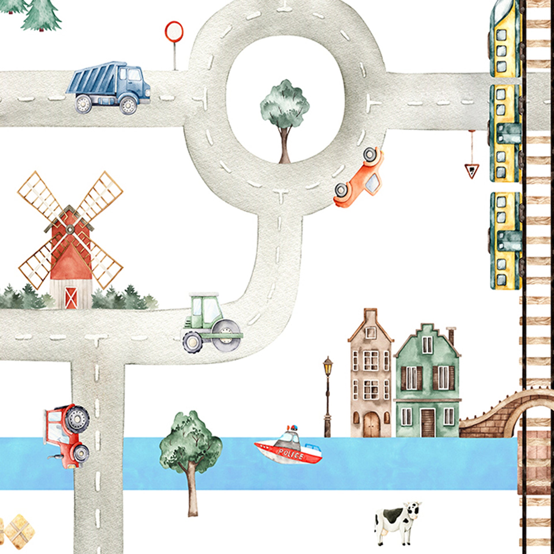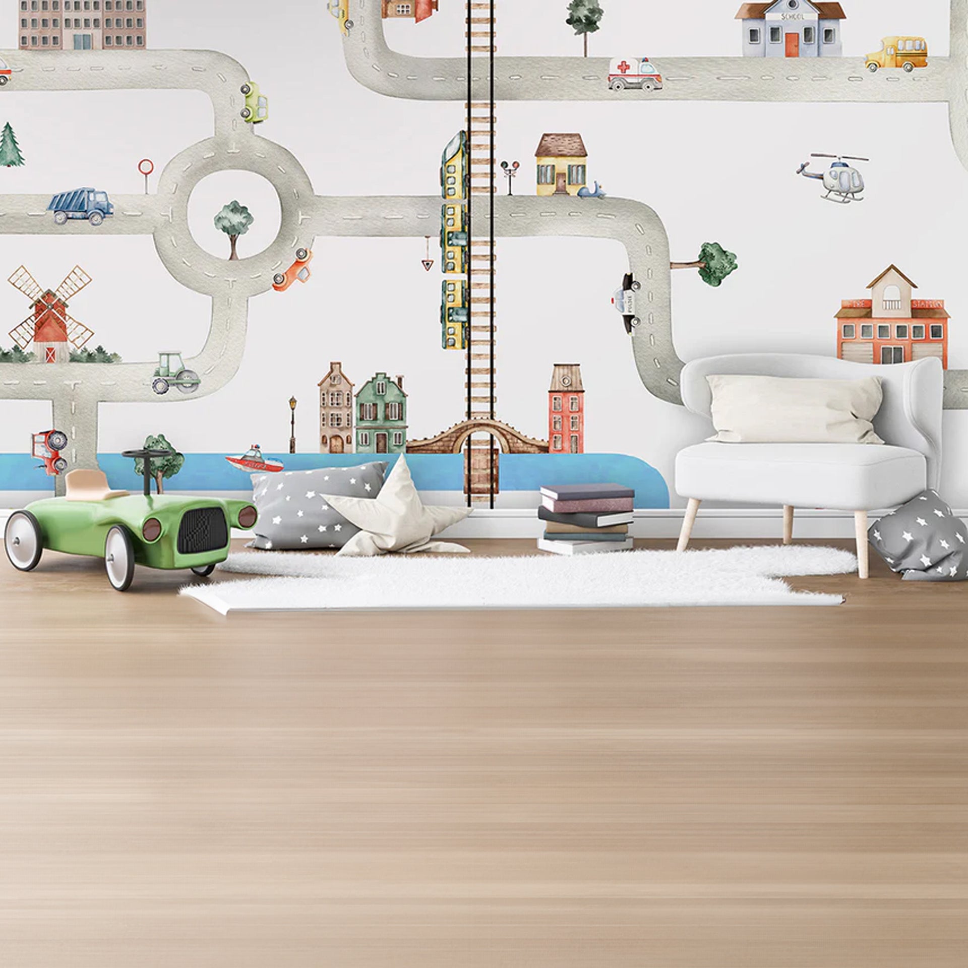 A colorful, watercolor-style city map featuring winding roads, bridges, trains, vehicles, and buildings. Playful, educational scene perfect for kids, travel planning, and creative learning about transport and neighborhoods.