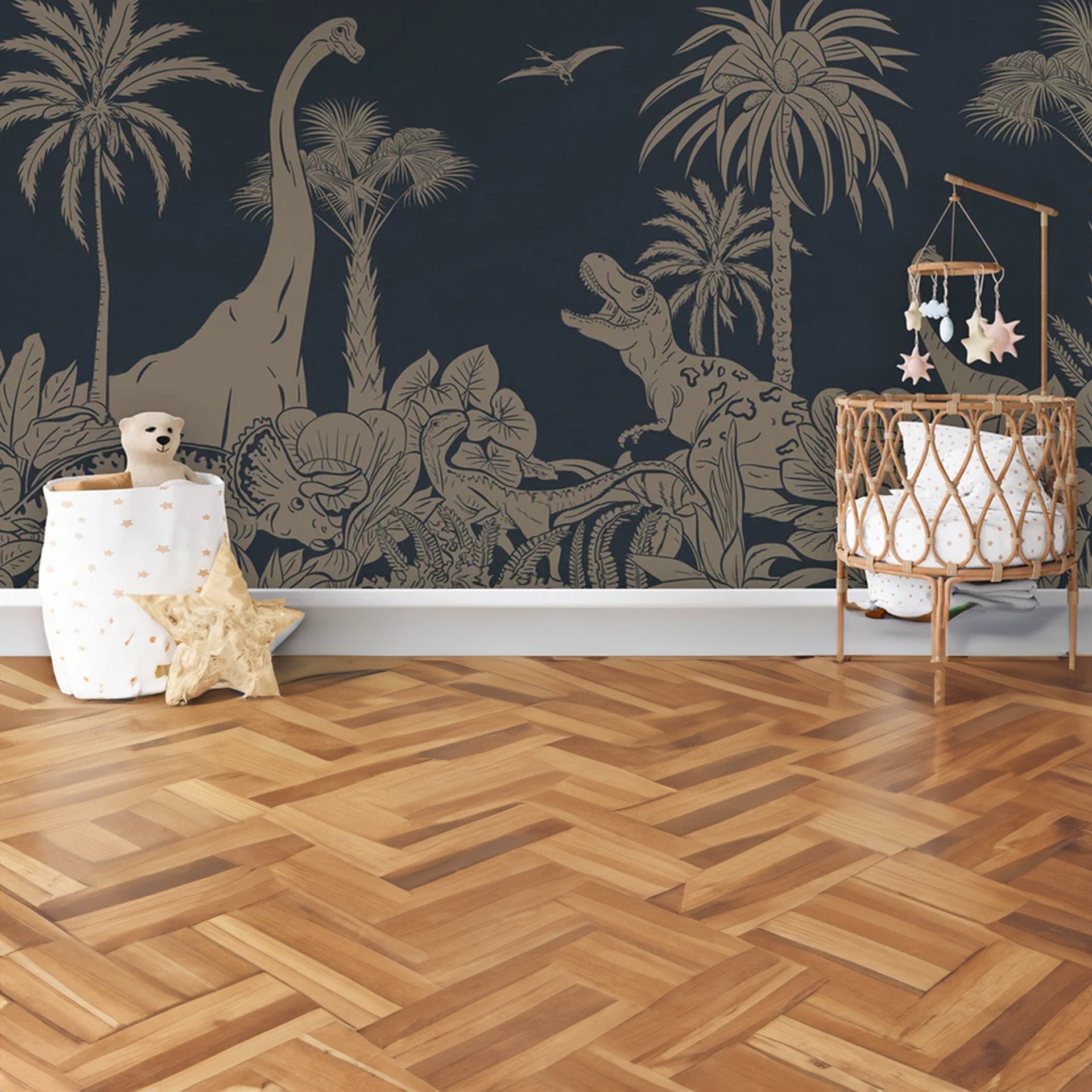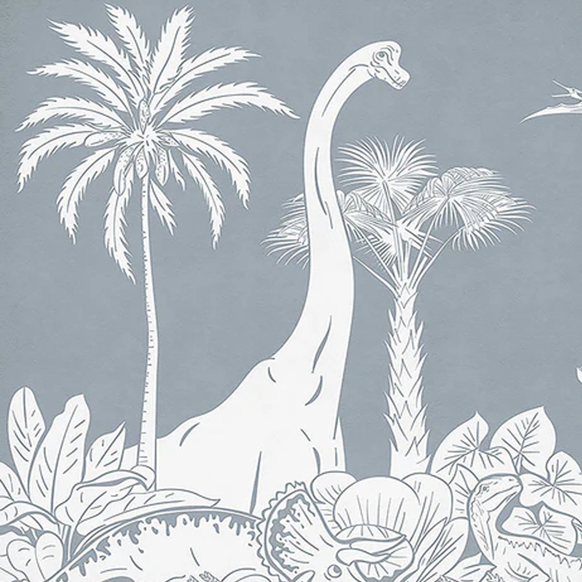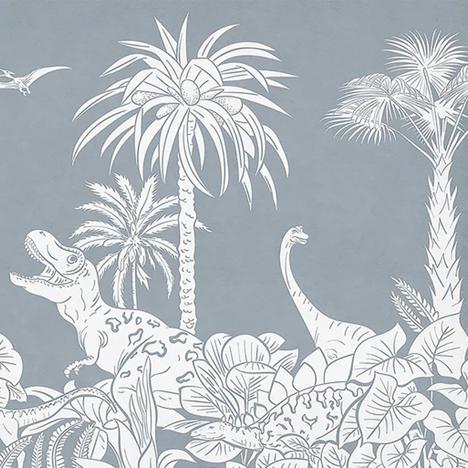 A stylized white line drawing of dinosaurs roaming a dense tropical jungle filled with palms and ferns. This illustration conveys wonder, adventure, and the ancient world in a modern graphic style.