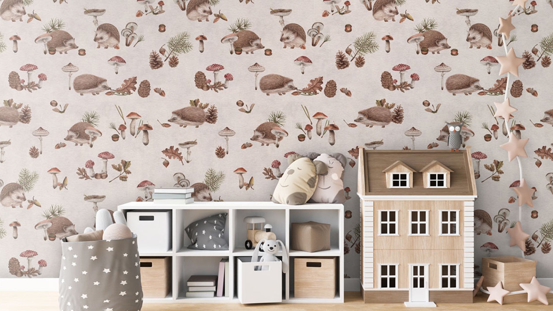 Happy Hedgehog Wallpaper with White Background depicts cheerful hedgehogs among mushrooms, leaves, and woodland things.