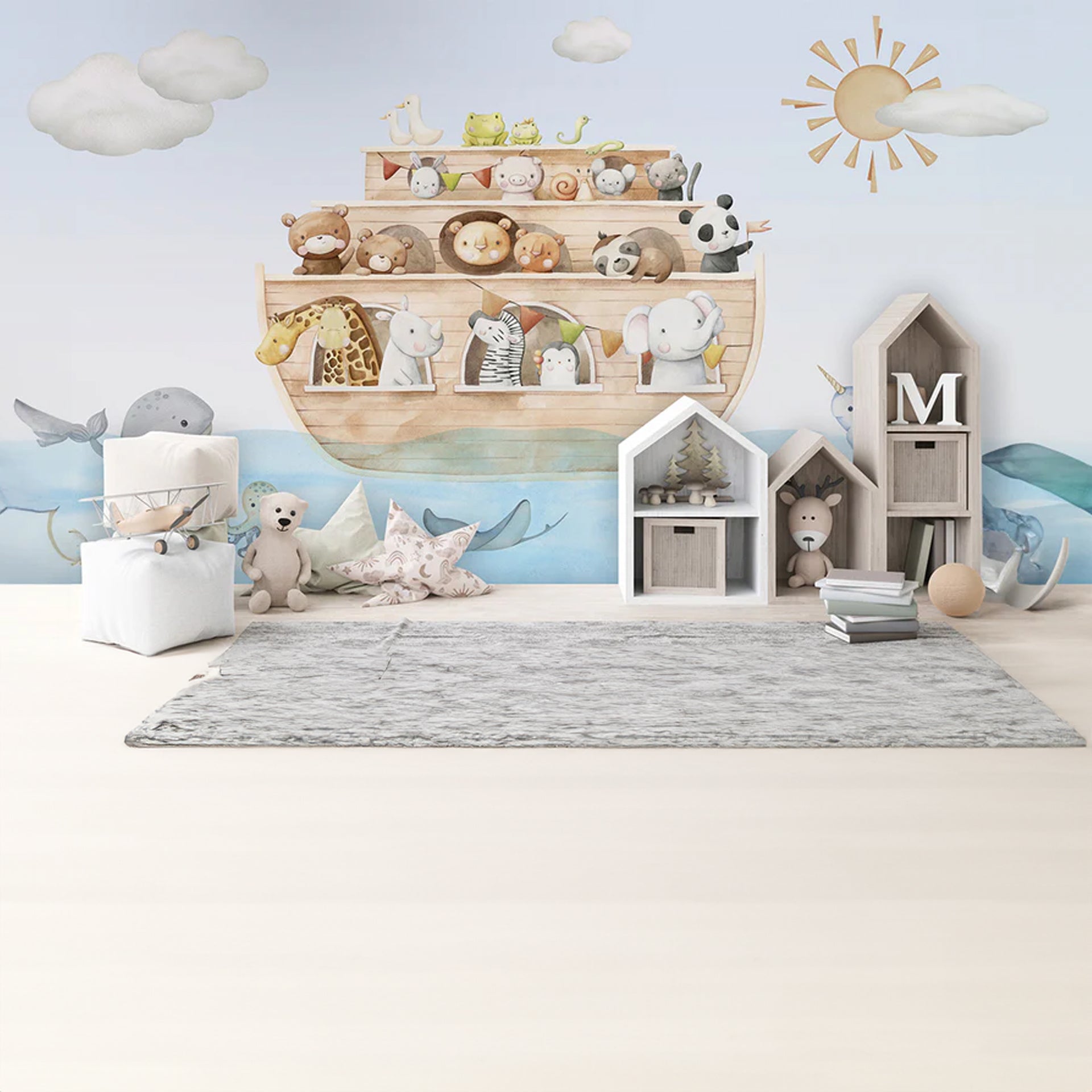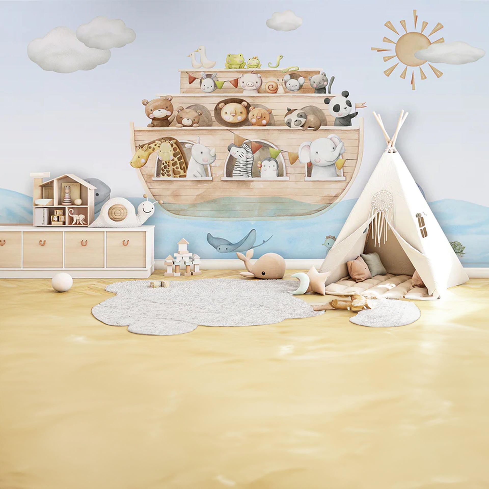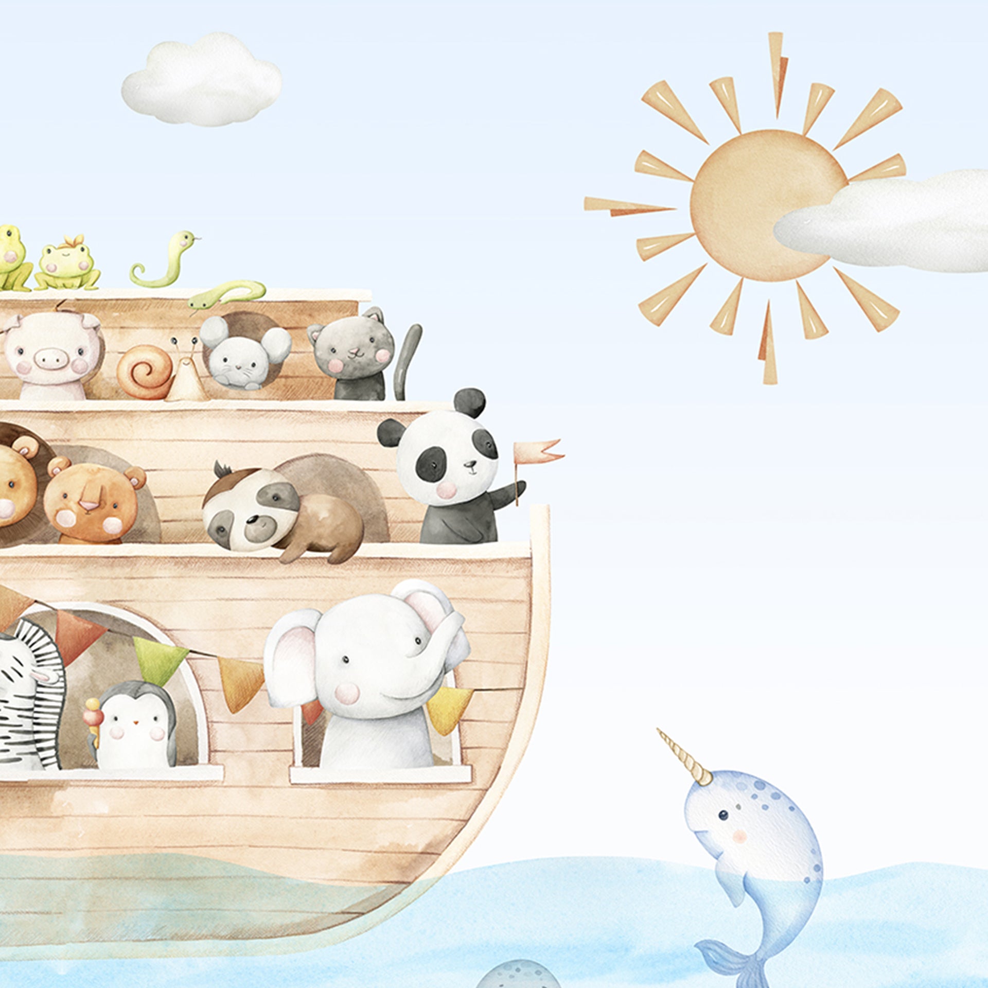A charming illustration of a wooden ark carrying a diverse group of animals, playful and curious, sailing under a sunny sky while colorful sea creatures swim nearby, evoking friendship, exploration, and imagination.