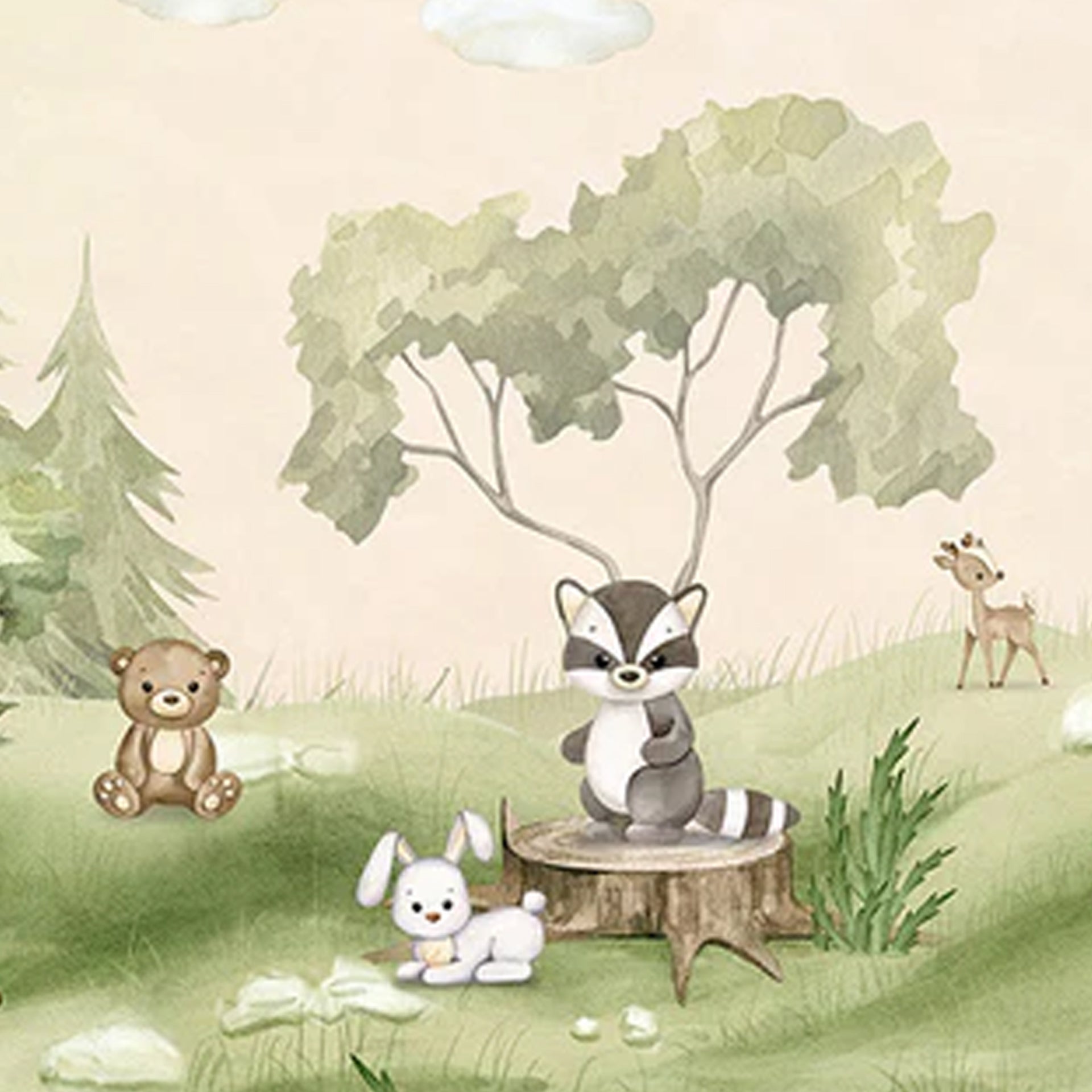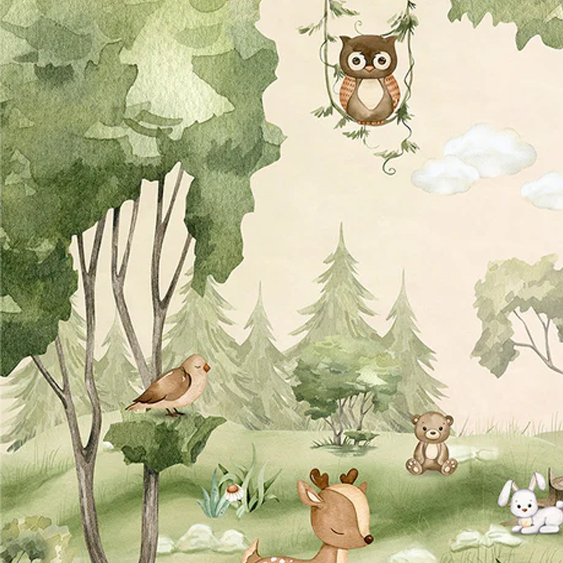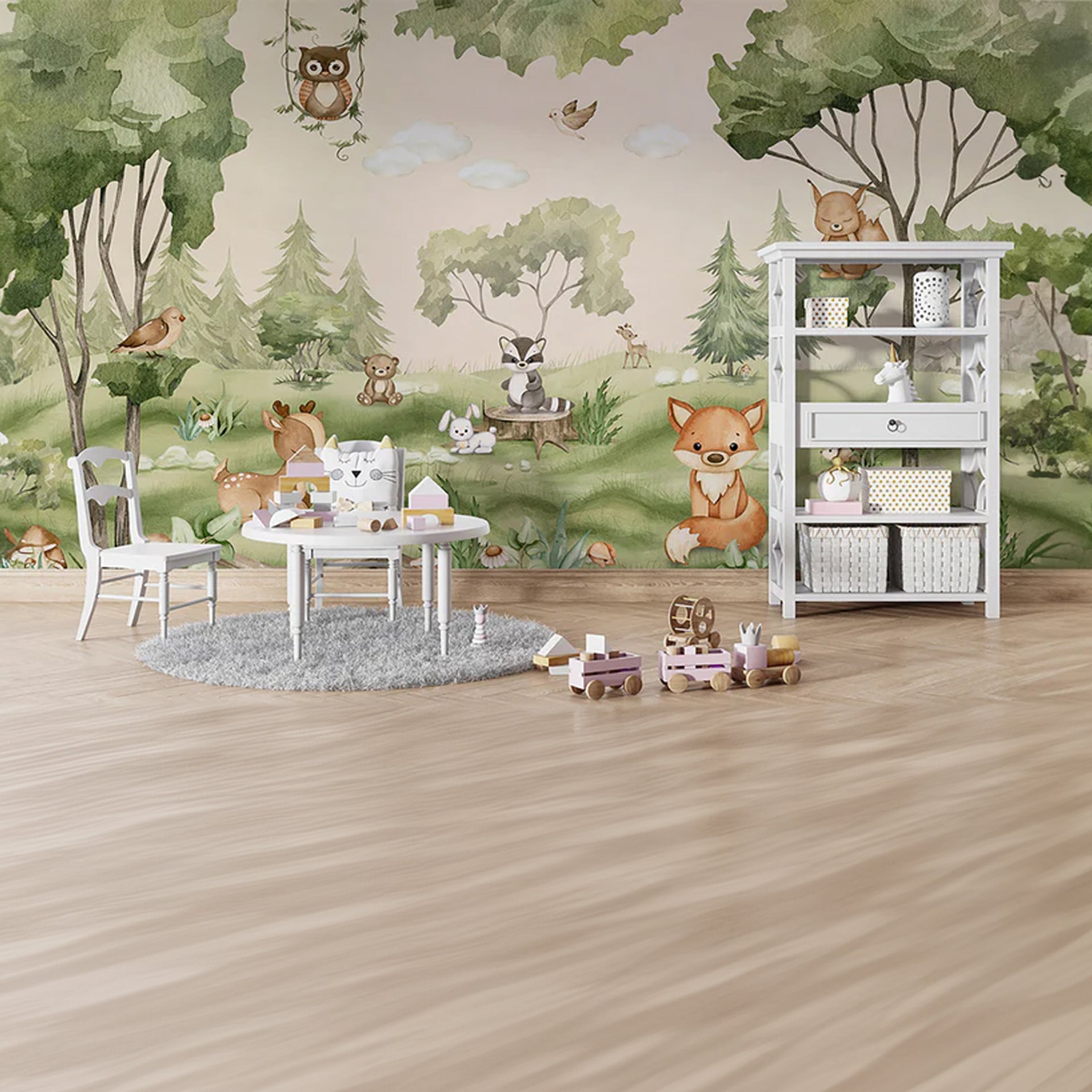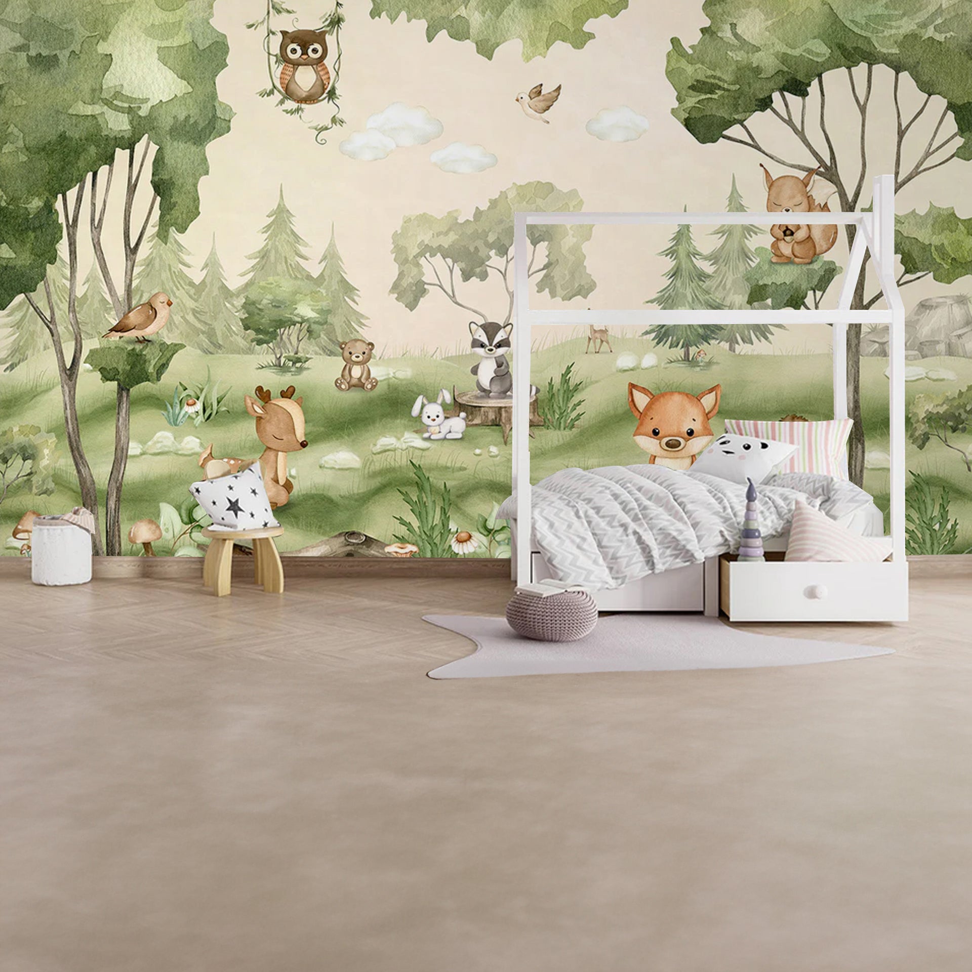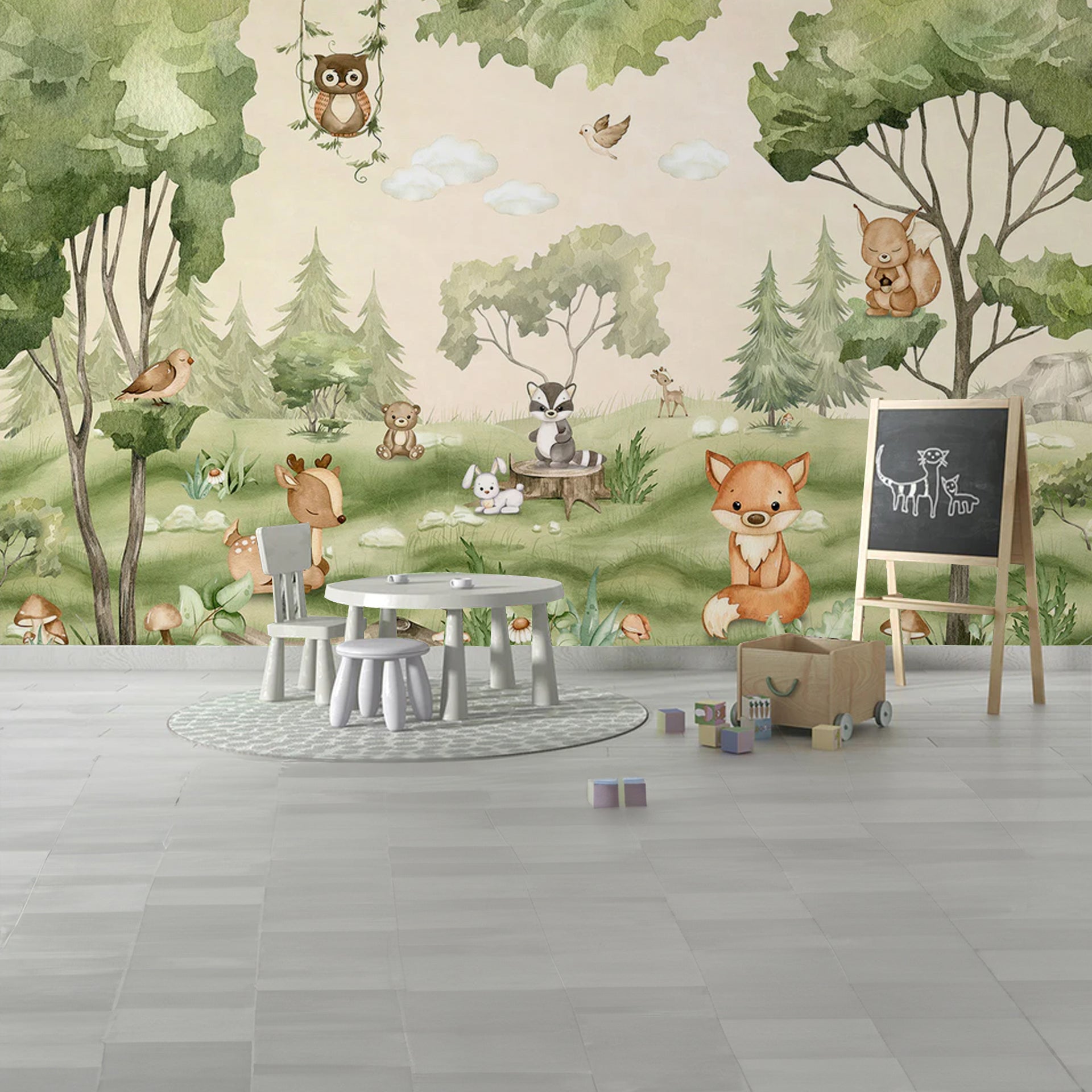 A charming watercolor illustration features a fox, bunny, deer, owl, raccoon, and birds in a serene forest clearing. Perfect for children's books, nursery decor, or nature-themed designs.