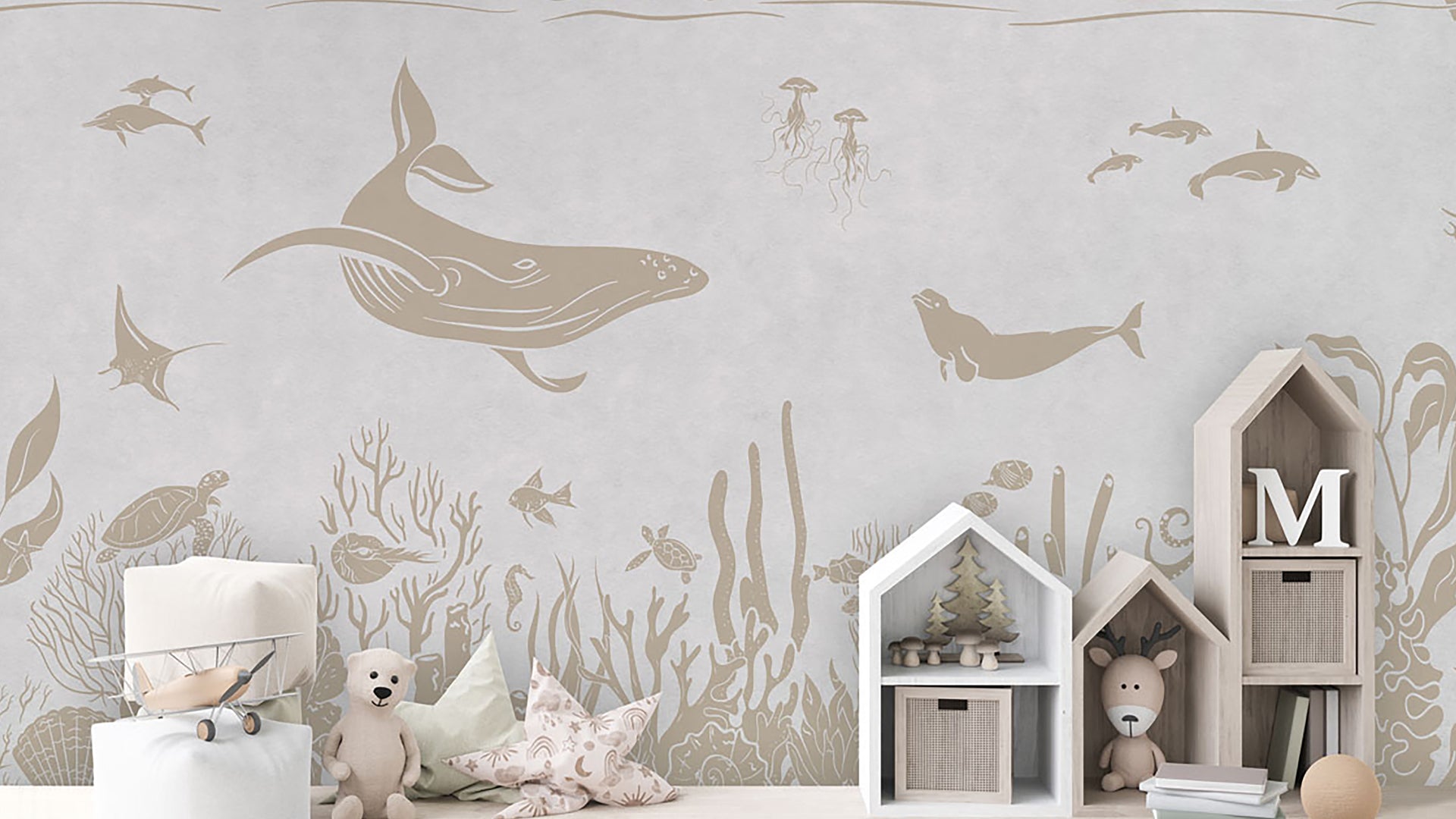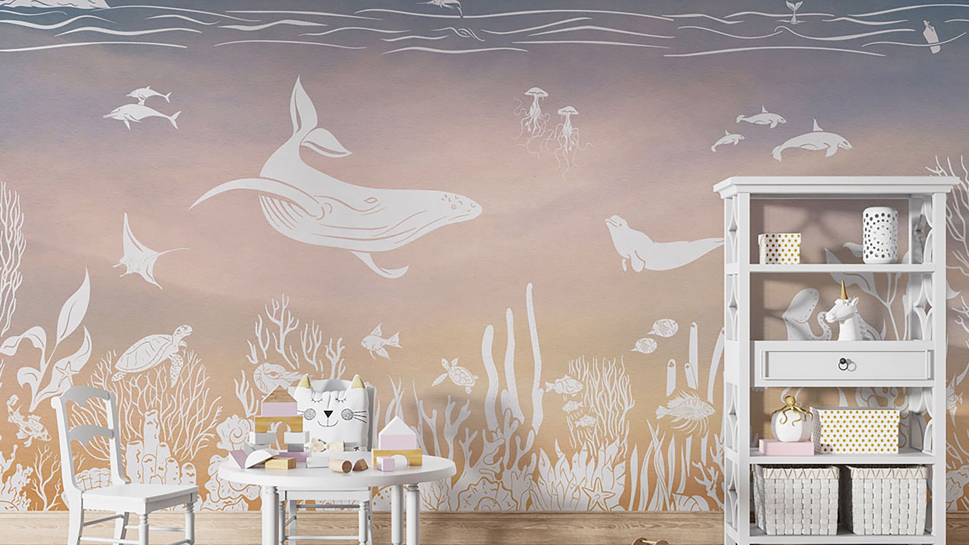 Monochrome Sea Pink: A Dreamy Underwater Wallpaper In Soft Blush Tones, Featuring Graceful Whales, Playful Dolphins, Sea Turtles, And Delicate Coral Reefs