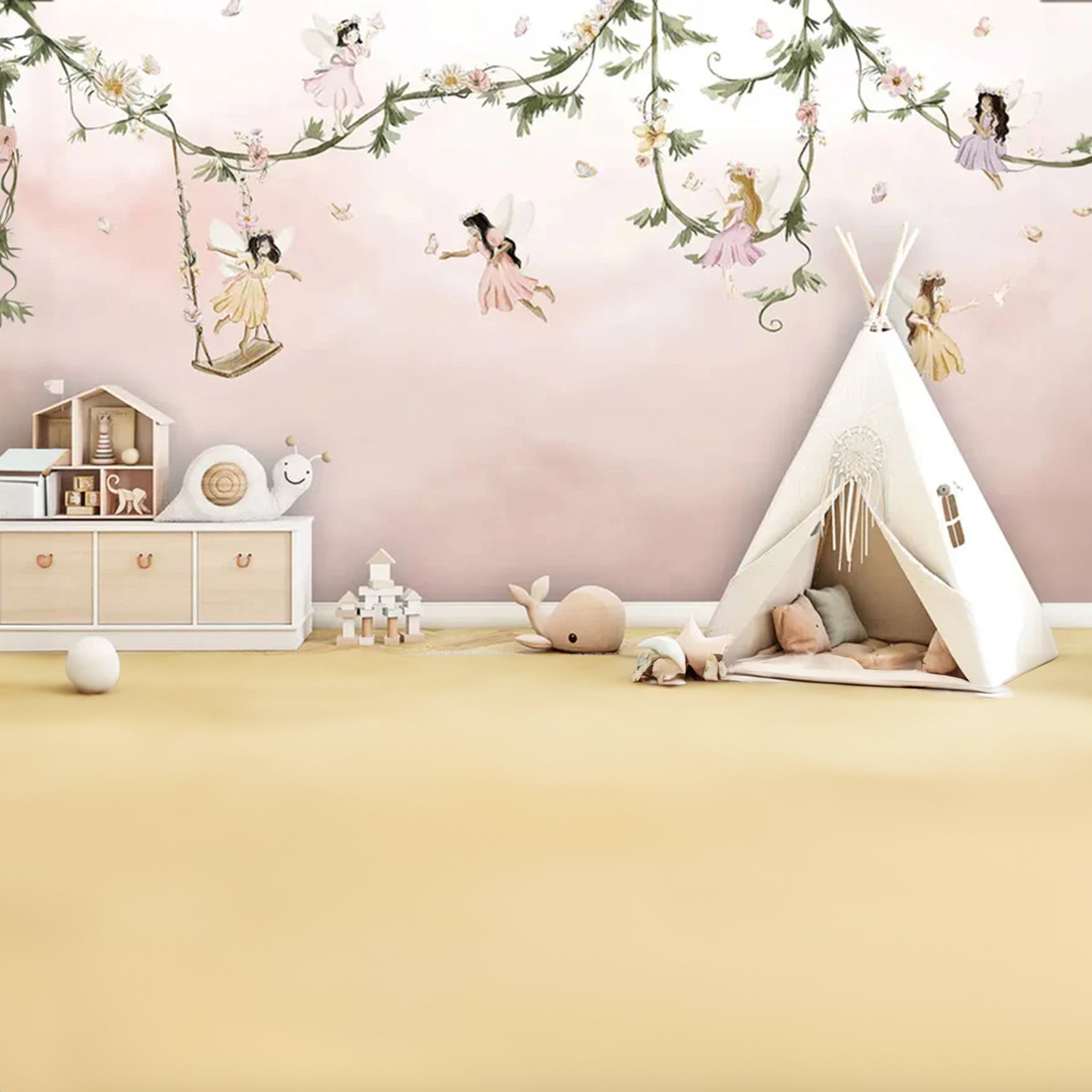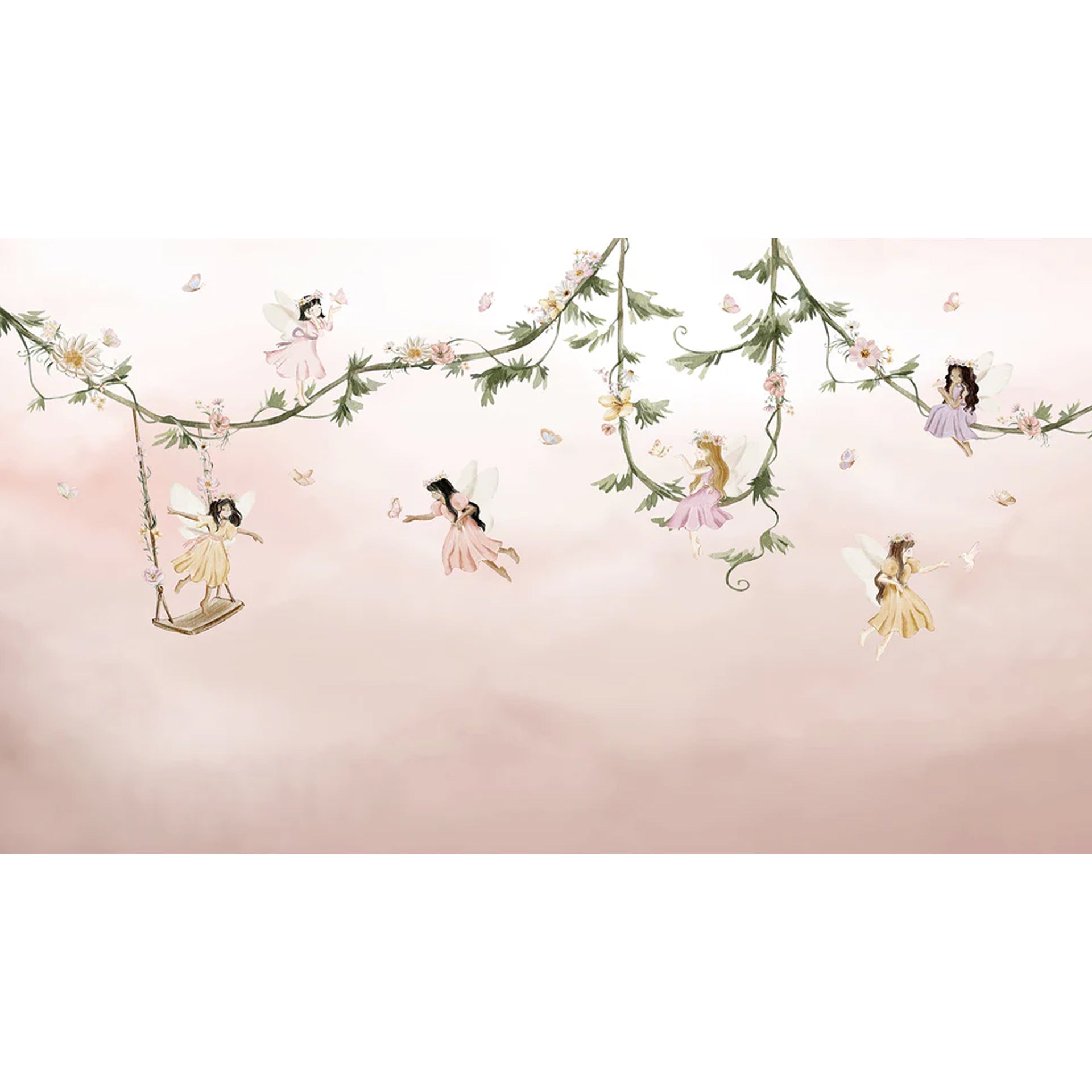 Dream-Flight: Whimsical Fairies Swing Along Floral Vines in a Soft Pink Sky
