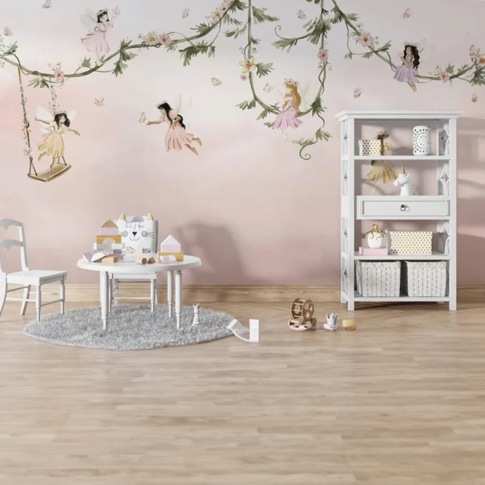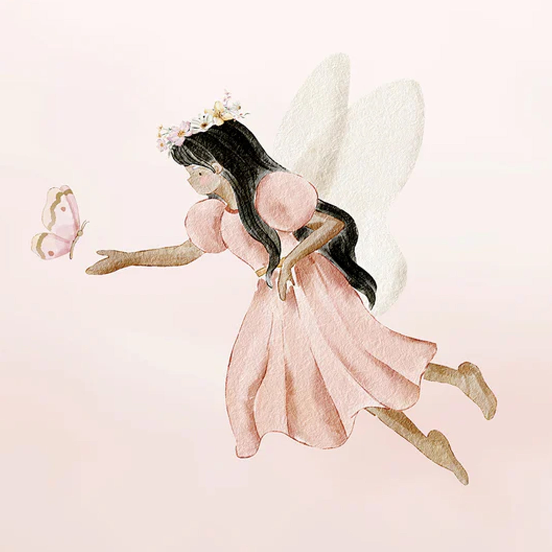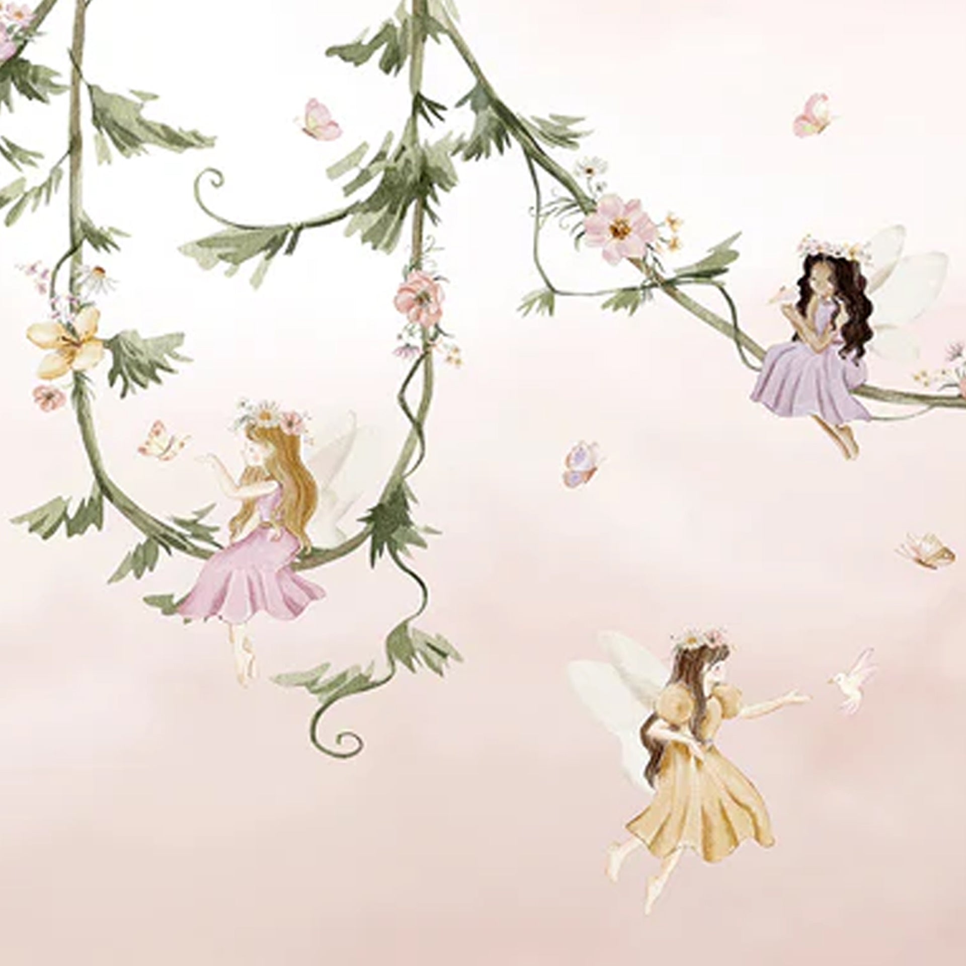 Delicate illustration of tiny fairies in pastel dresses perched on twisting vines, fluttering among blossoms beneath a dreamy pink sky. Whimsical, magical mood perfect for children's decor and fantasy storytelling.