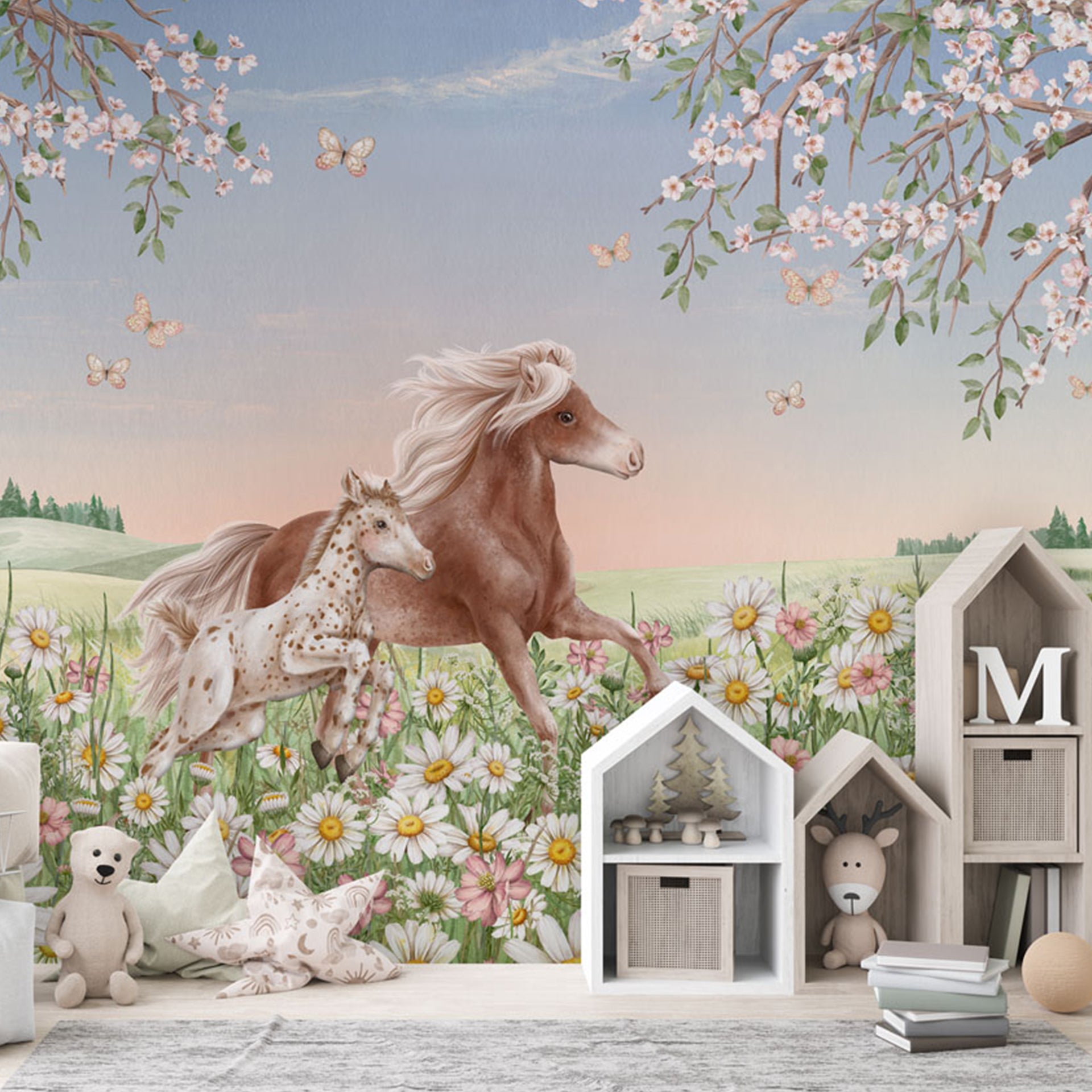 A tranquil spring scene features a brown horse and foal galloping through a daisy-filled meadow, framed by cherry blossoms and fluttering butterflies beneath a soft pastel sky.