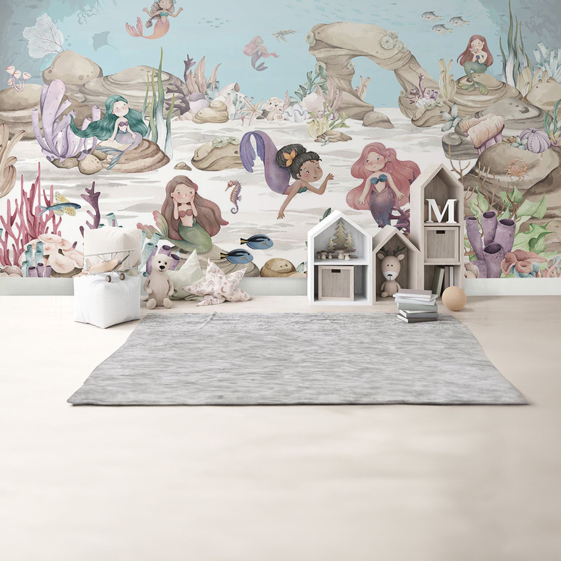 Colorful underwater landscape with mermaids, coral arches, and playful sea life. A magical, peaceful ocean scene perfect for children's books and fantasy illustrations.