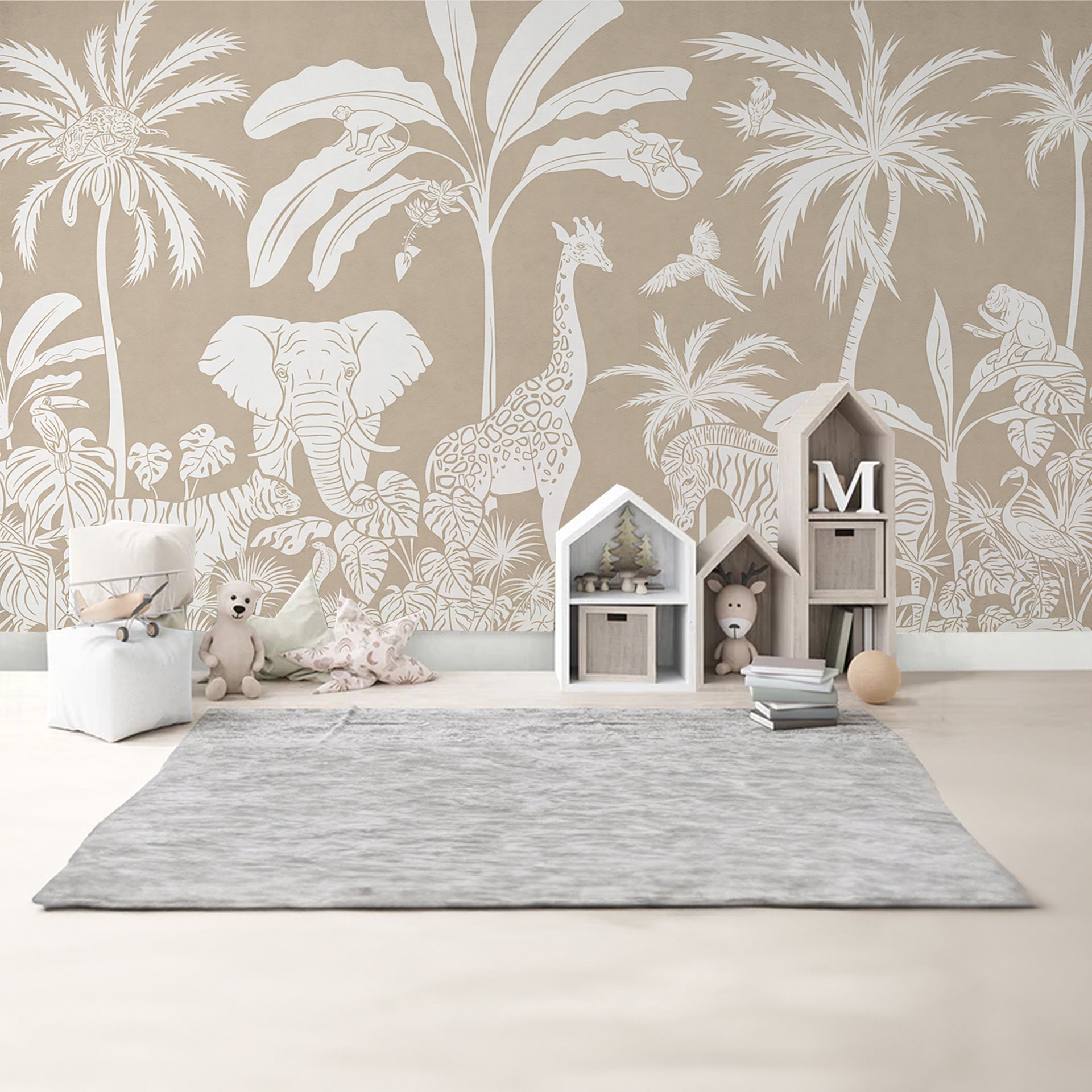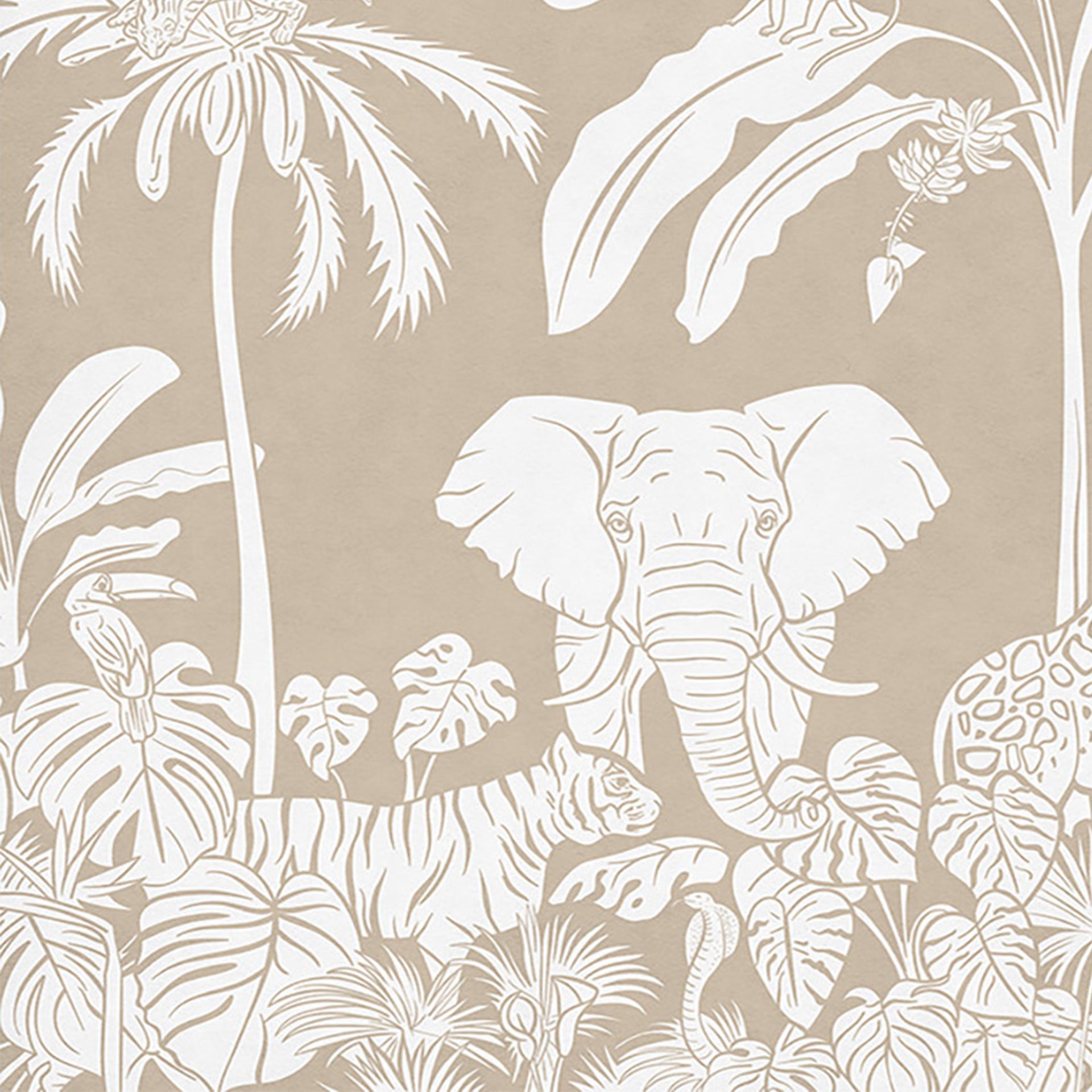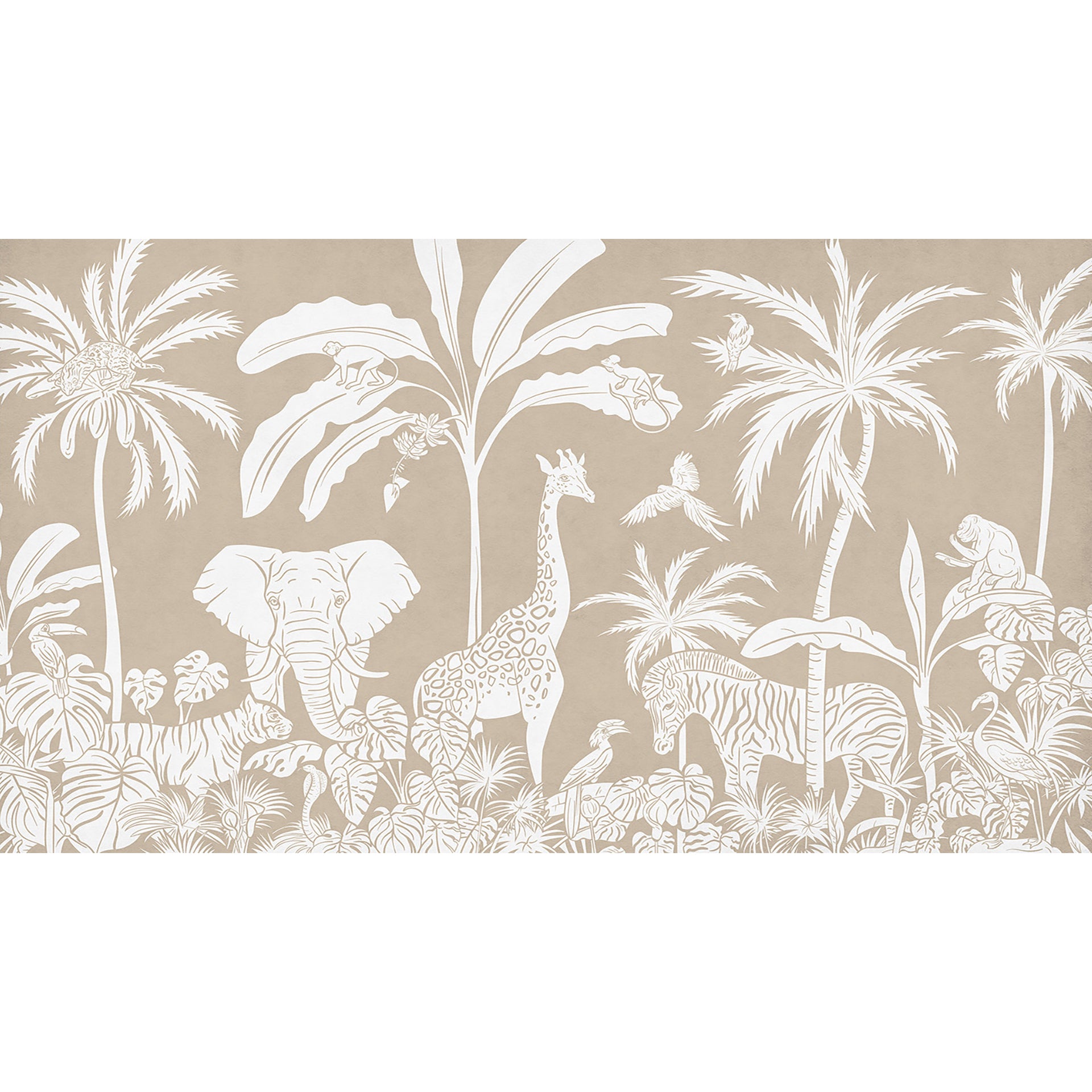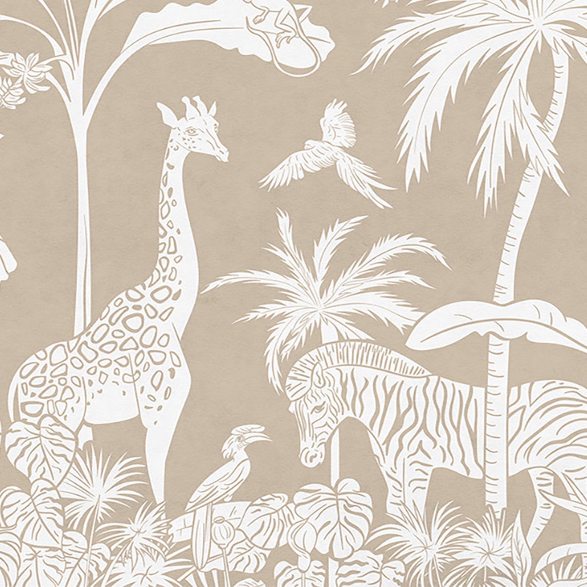 Elegant beige silhouette of a dense tropical jungle featuring elephants, giraffes, tigers, birds, and palm trees. A tranquil, nature-inspired design suitable for wallpapers, textiles, or stock illustrations seeking exotic wildlife vibes.