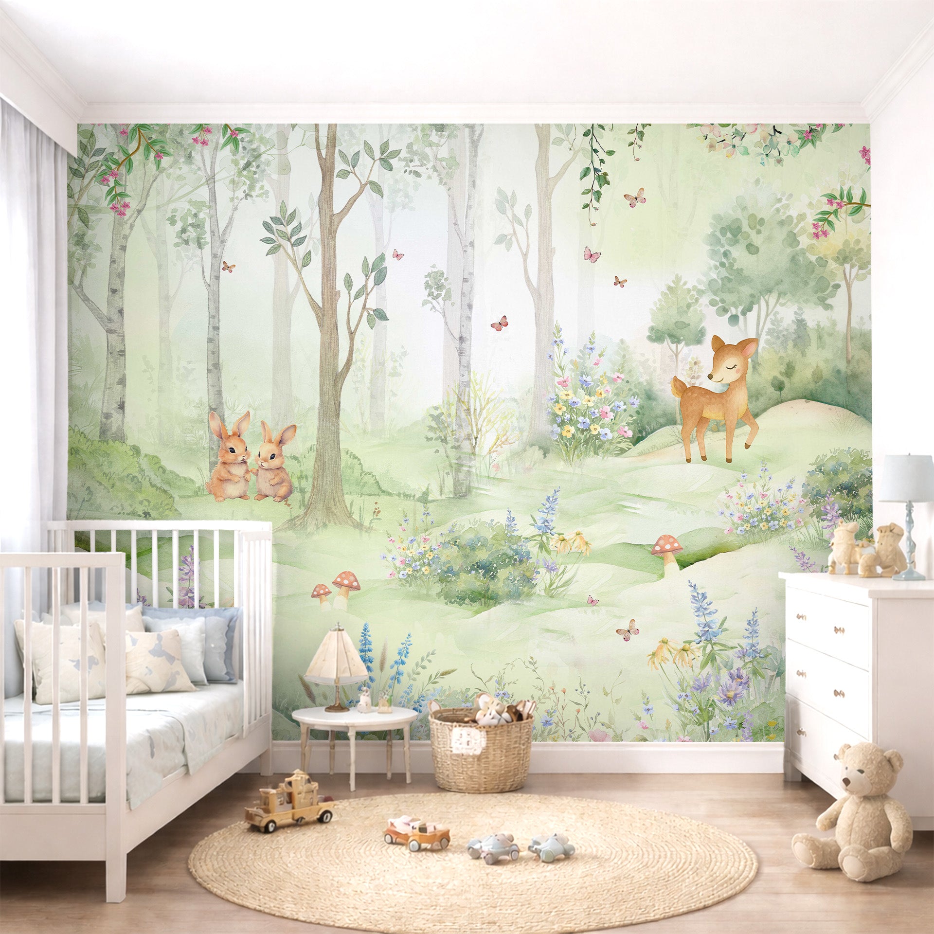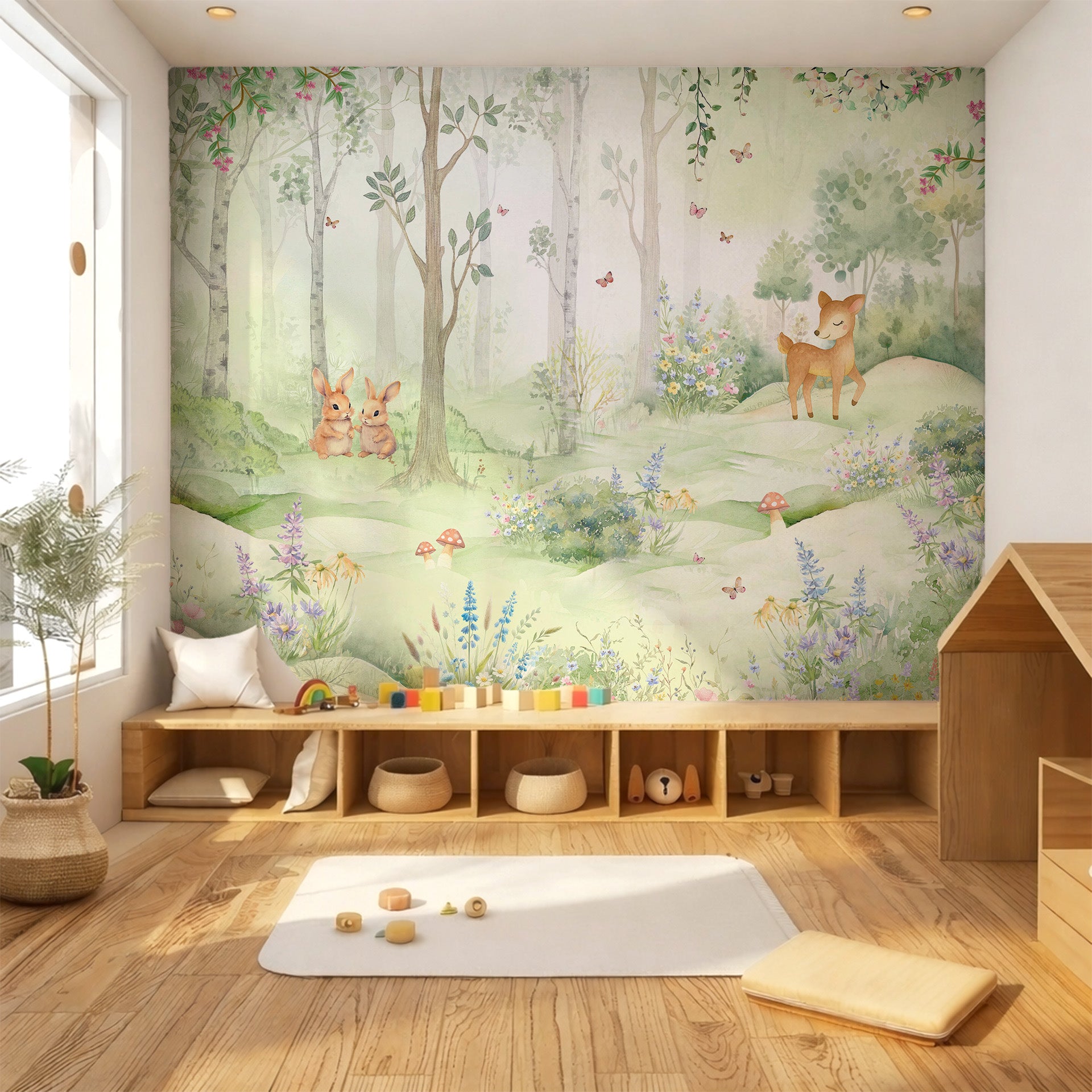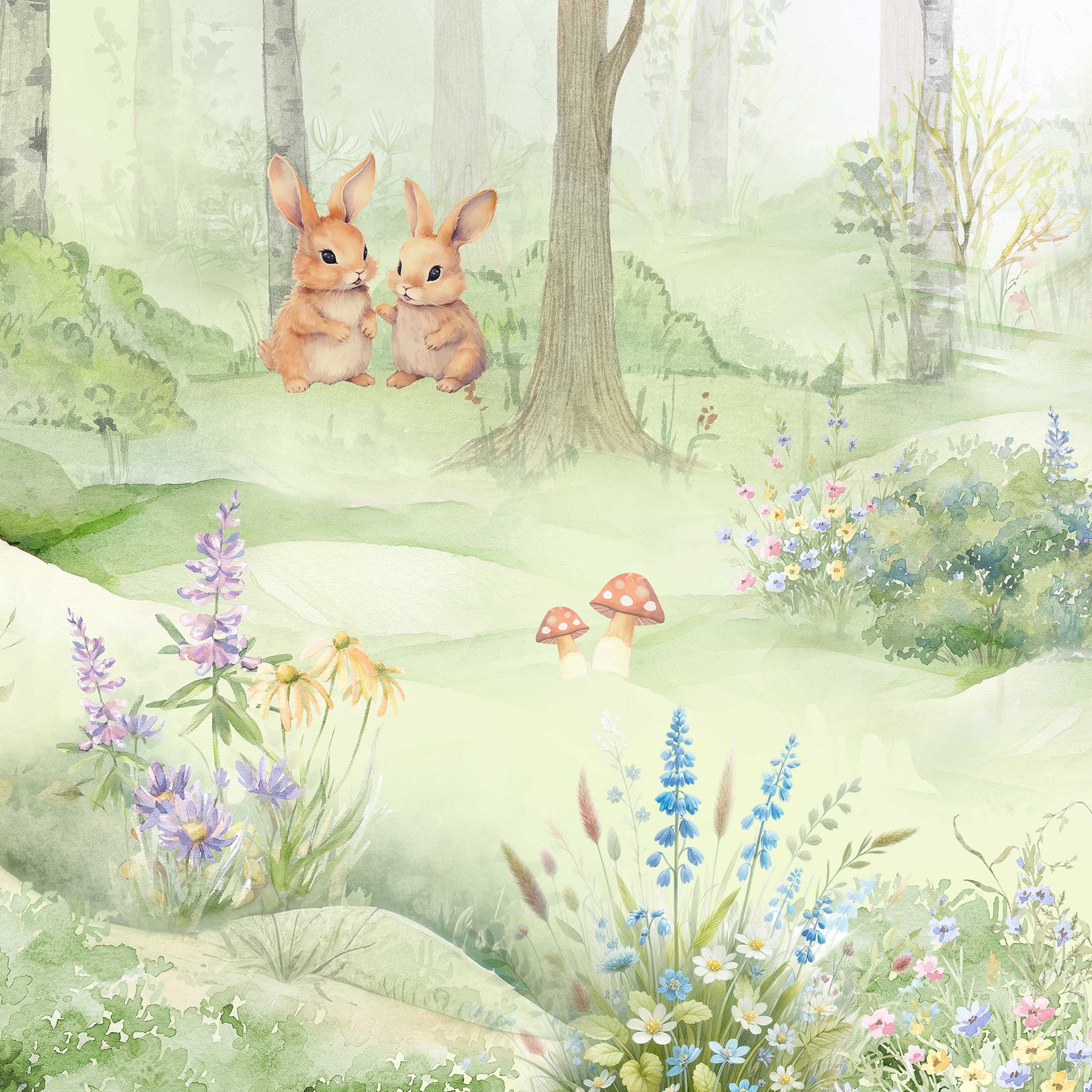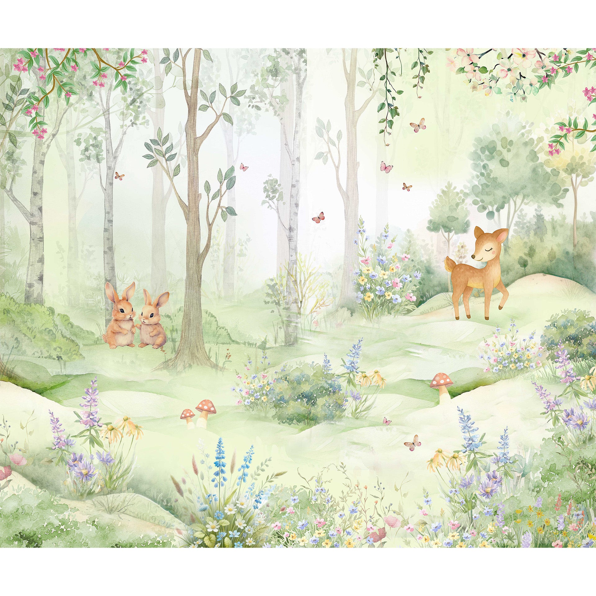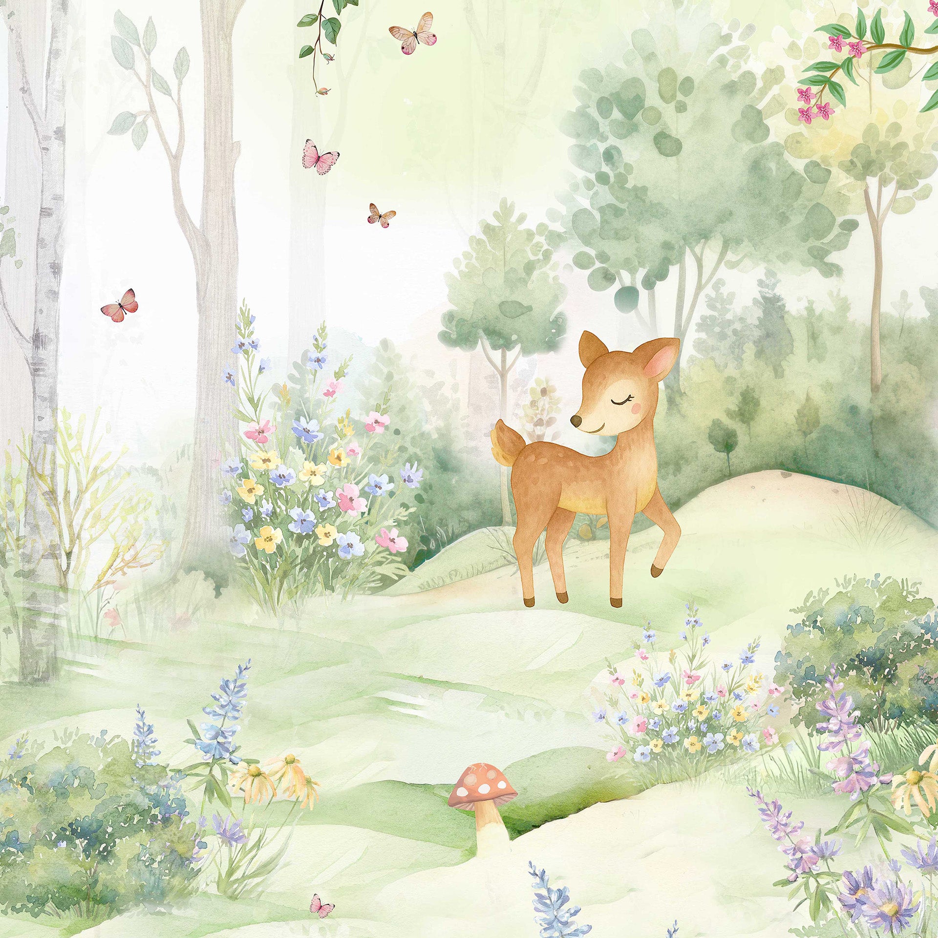 Gentle watercolor illustration of a peaceful woodland meadow with a smiling deer fawn, two rabbits, wildflowers and butterflies. Soft pastel tones evoke spring, calm, nursery and fairytale atmospheres.