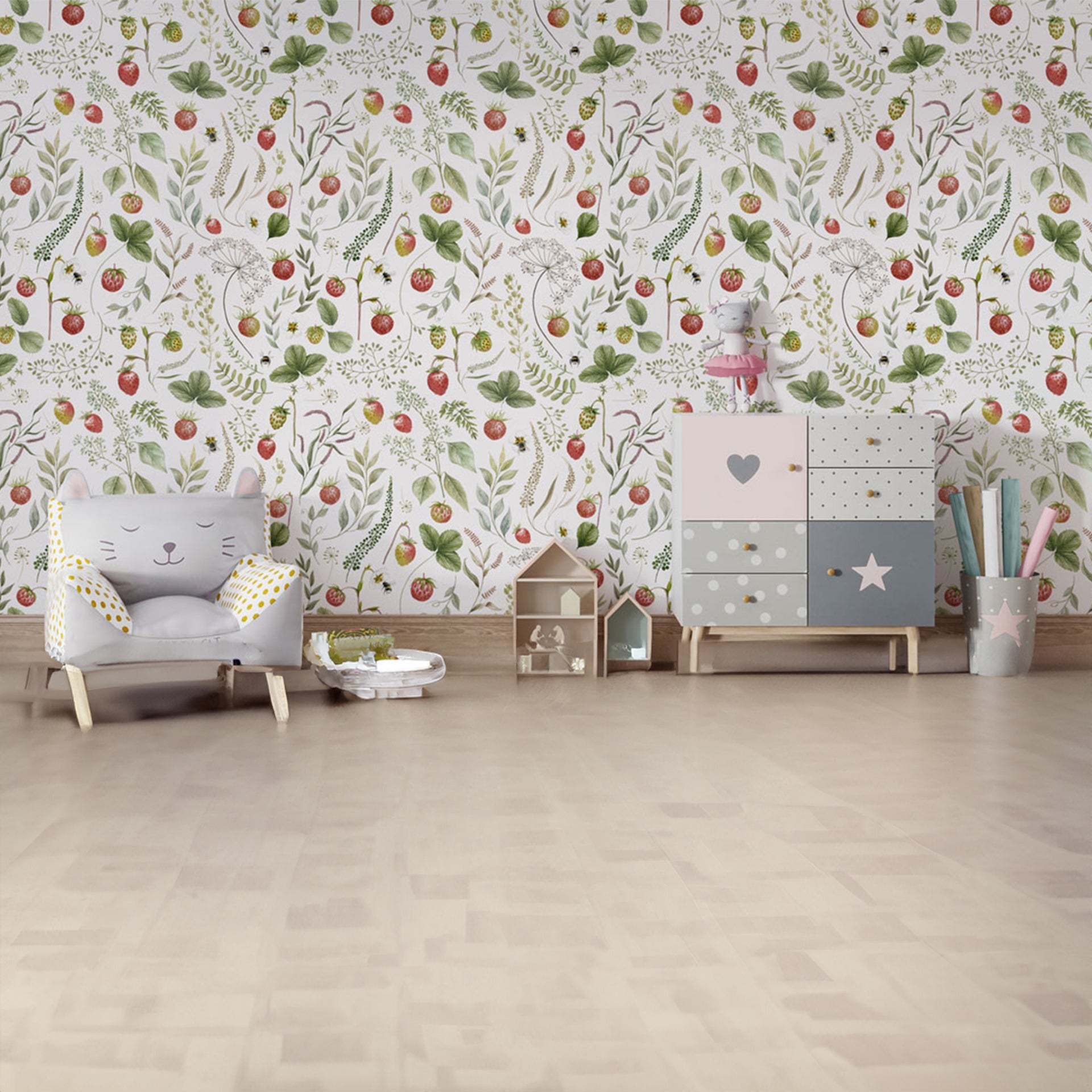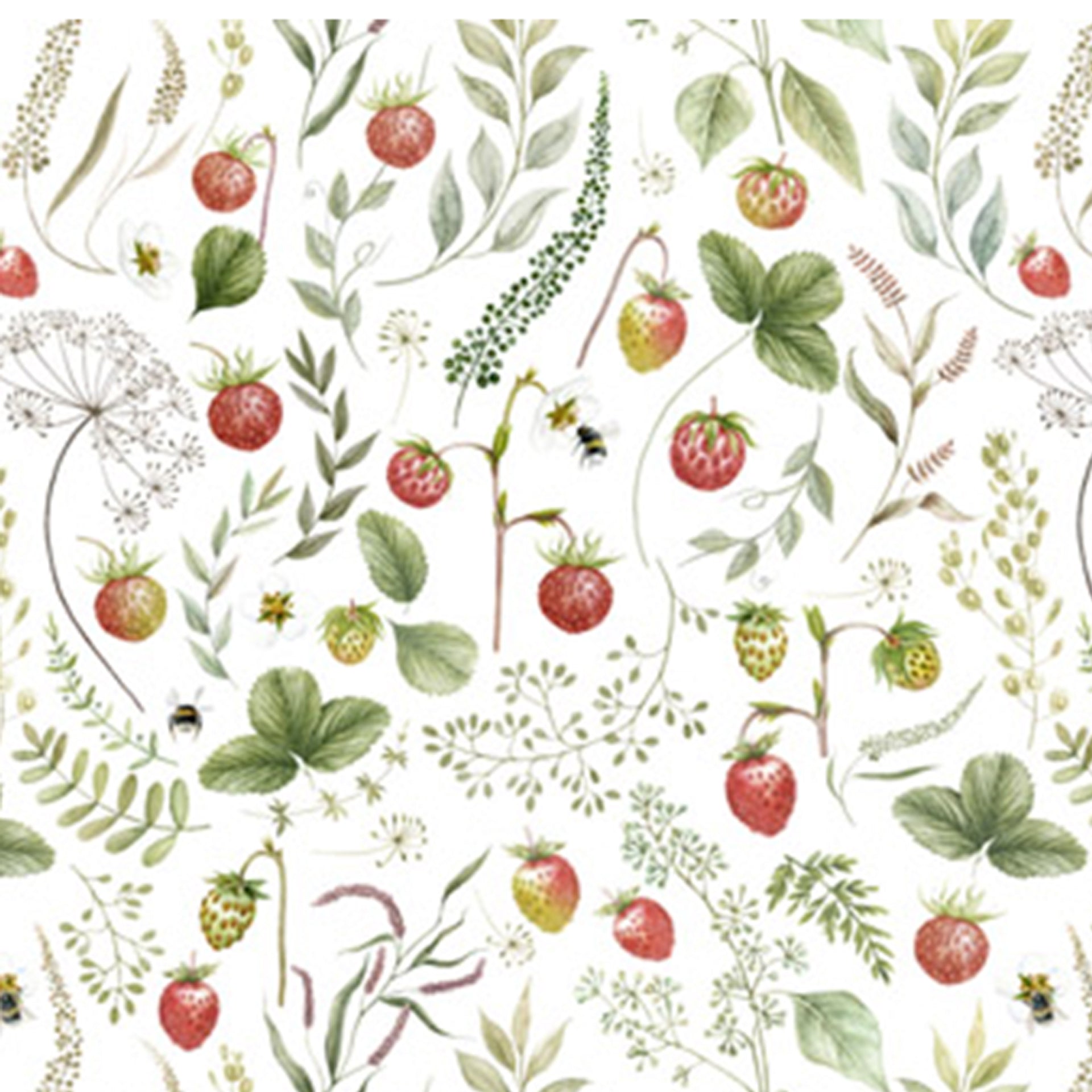 Vibrant botanical repeating pattern featuring delicate leaves, tiny blossoms, and ripened red berries. Ideal for fabric, wallpaper, stationery, or home decor, evoking fresh garden-inspired style and natural calm.