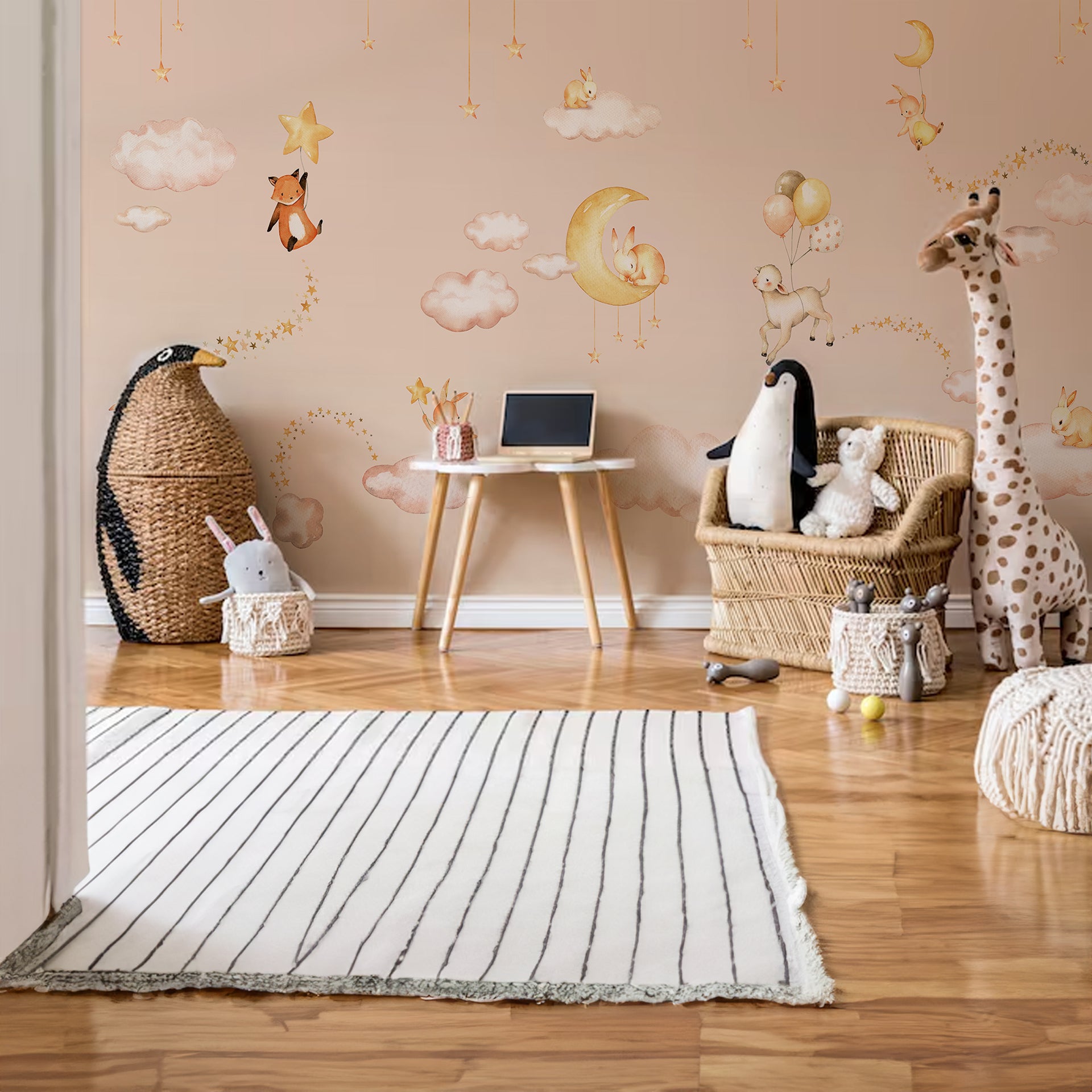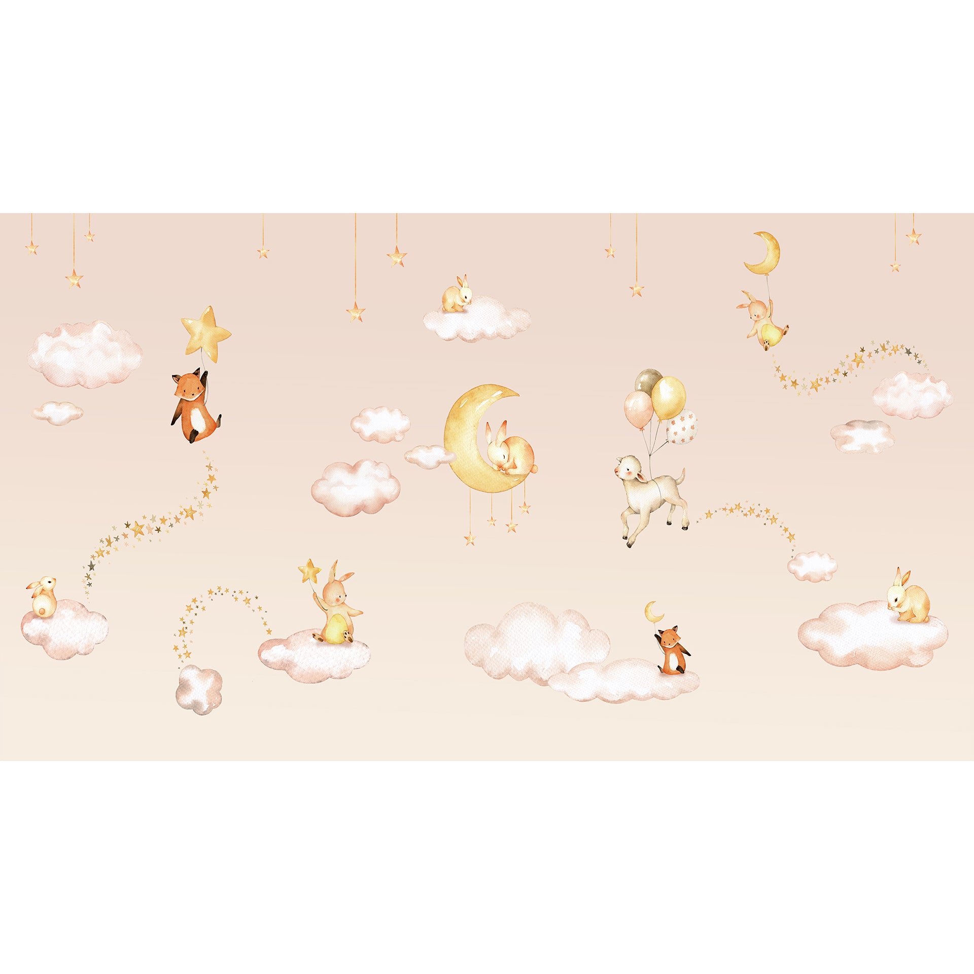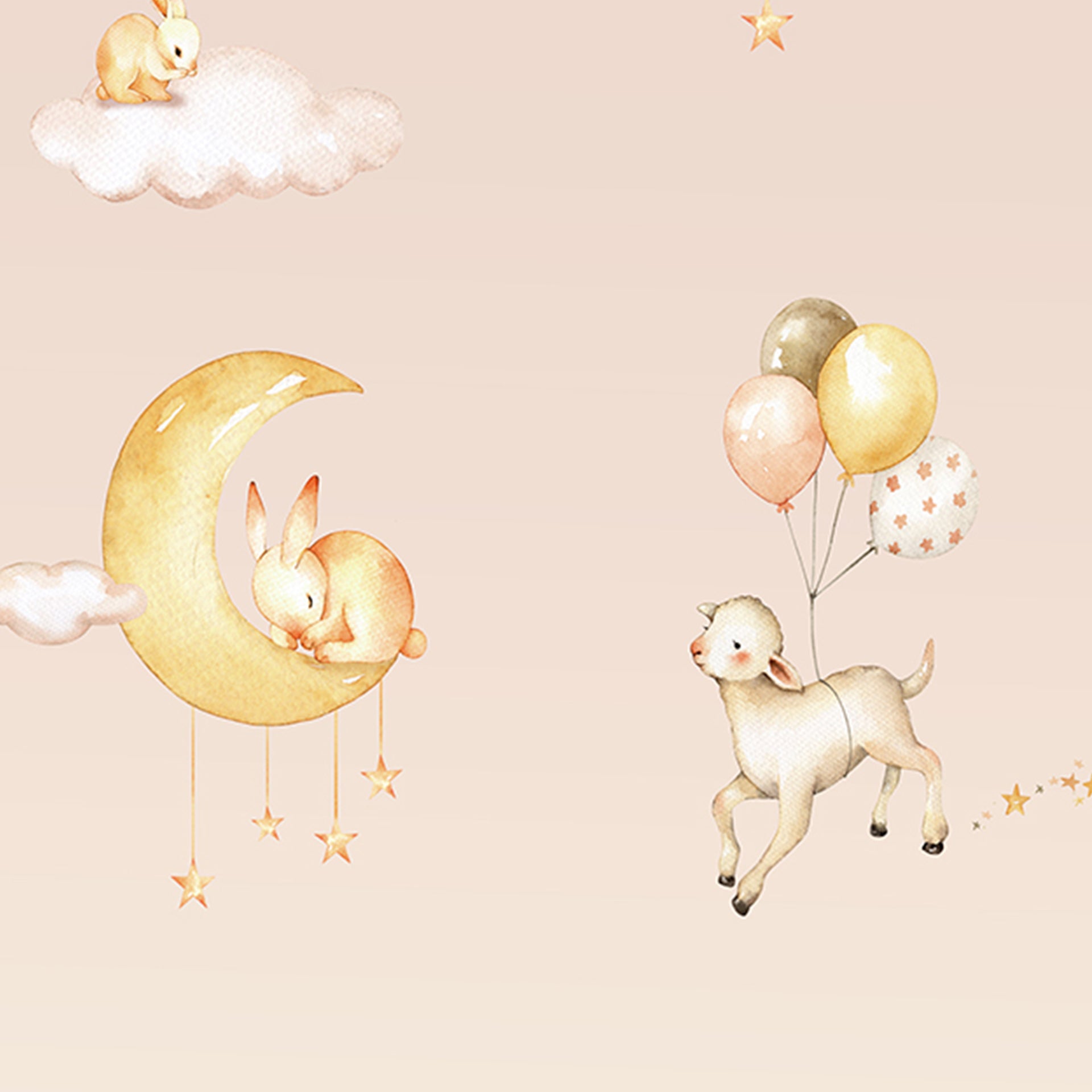 Sweet-Dreams: Whimsical Wallpaper With Rabbits, Clouds, Moon, Stars, and Balloons in Soft Pastel Tones