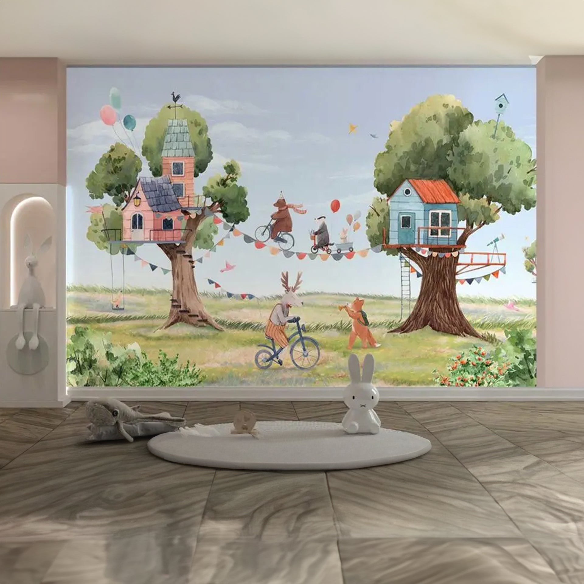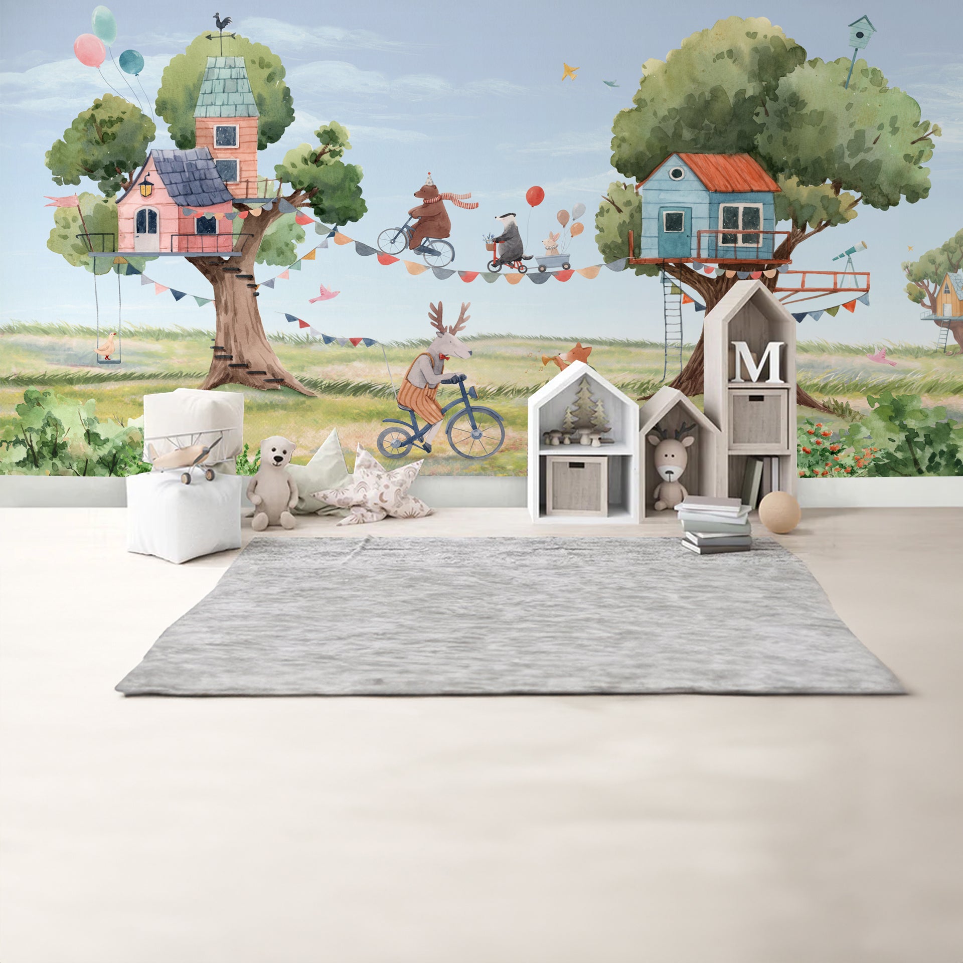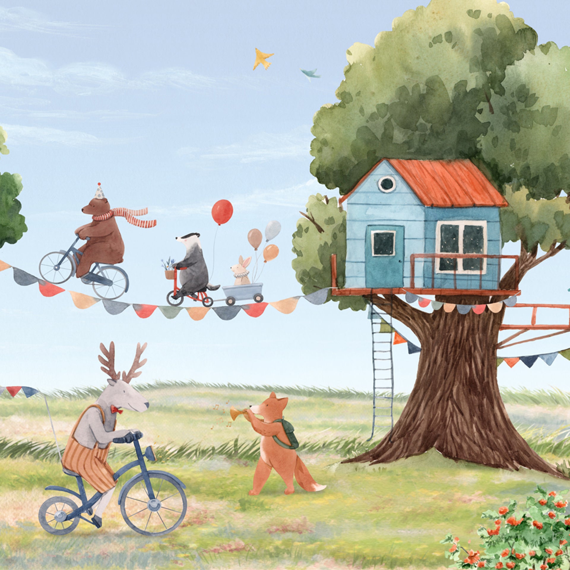 Tree-House-Party: Whimsical wallpaper With Biking Friends, Balloons, and Playful Animals