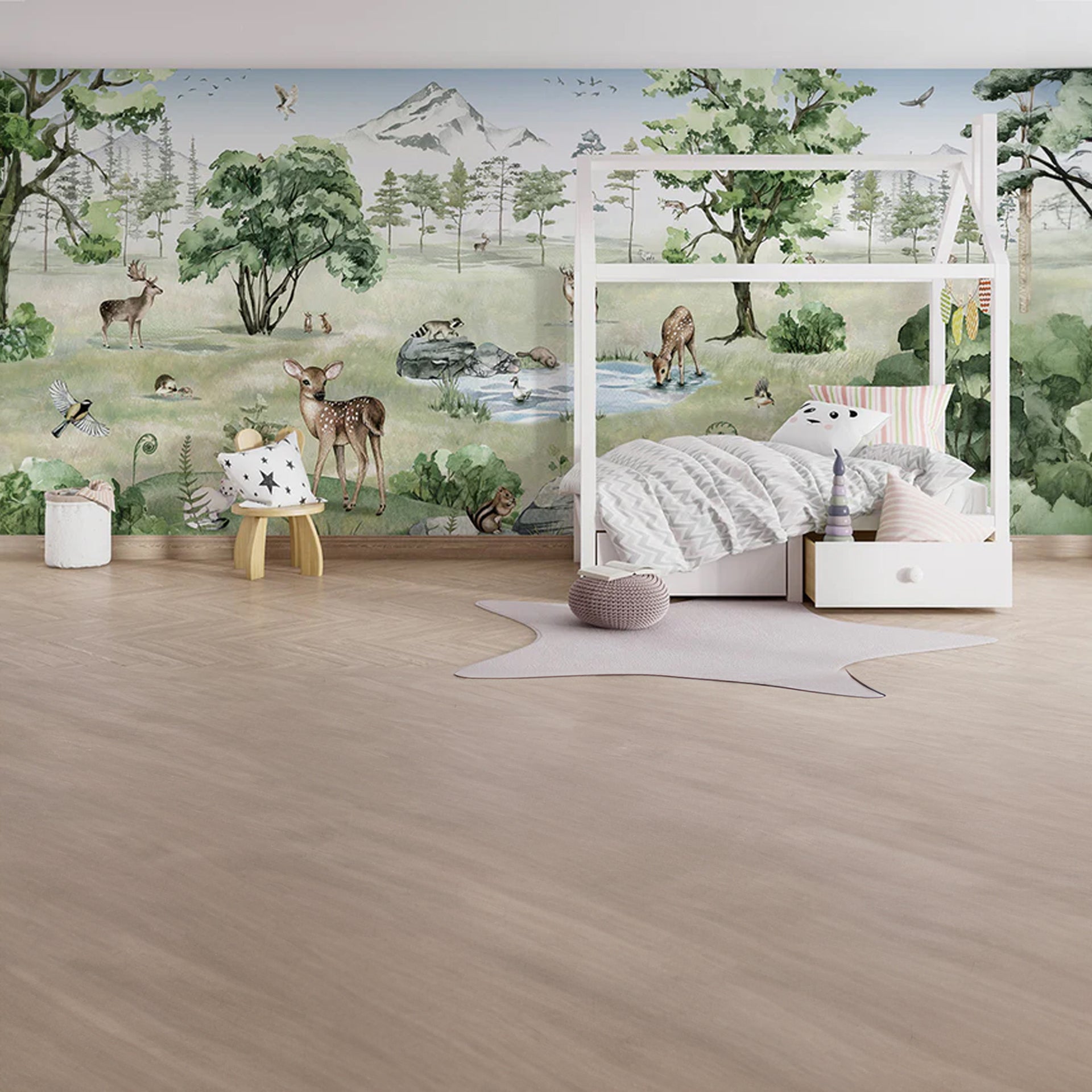 A tranquil watercolor-style forest landscape featuring deer, birds, and a gentle stream, set against distant mountains. Evokes calm, nature, wildlife, and outdoor exploration for nature-related projects.