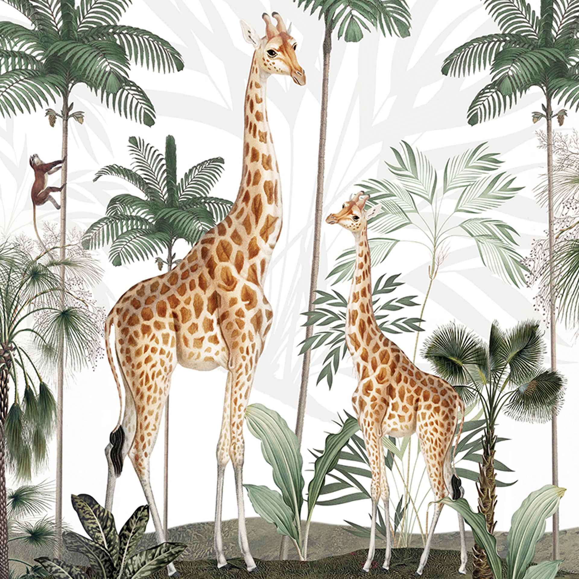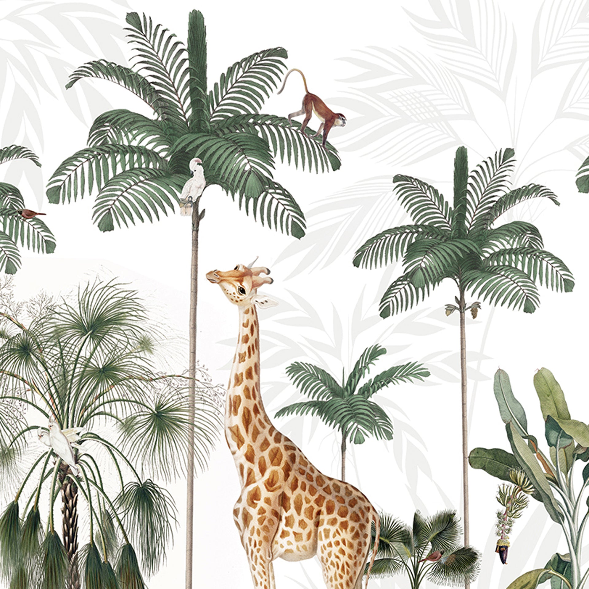 A charming tropical jungle backdrop featuring tall giraffes amid palm trees, lush foliage, and scattered wildlife. Ideal for nature, wildlife, family, travel, or educational imagery in editorial or decorative projects.
