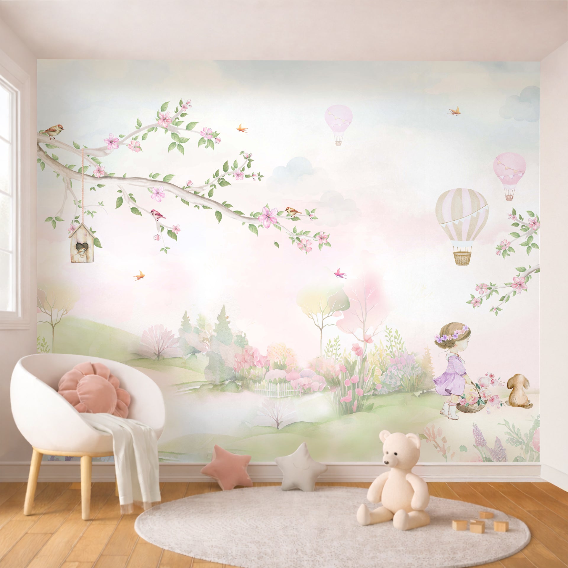 Whimsical countryside wallpaper with pink flowers and hot air balloons, Perfect for girls’ rooms, playrooms, and nurseries.