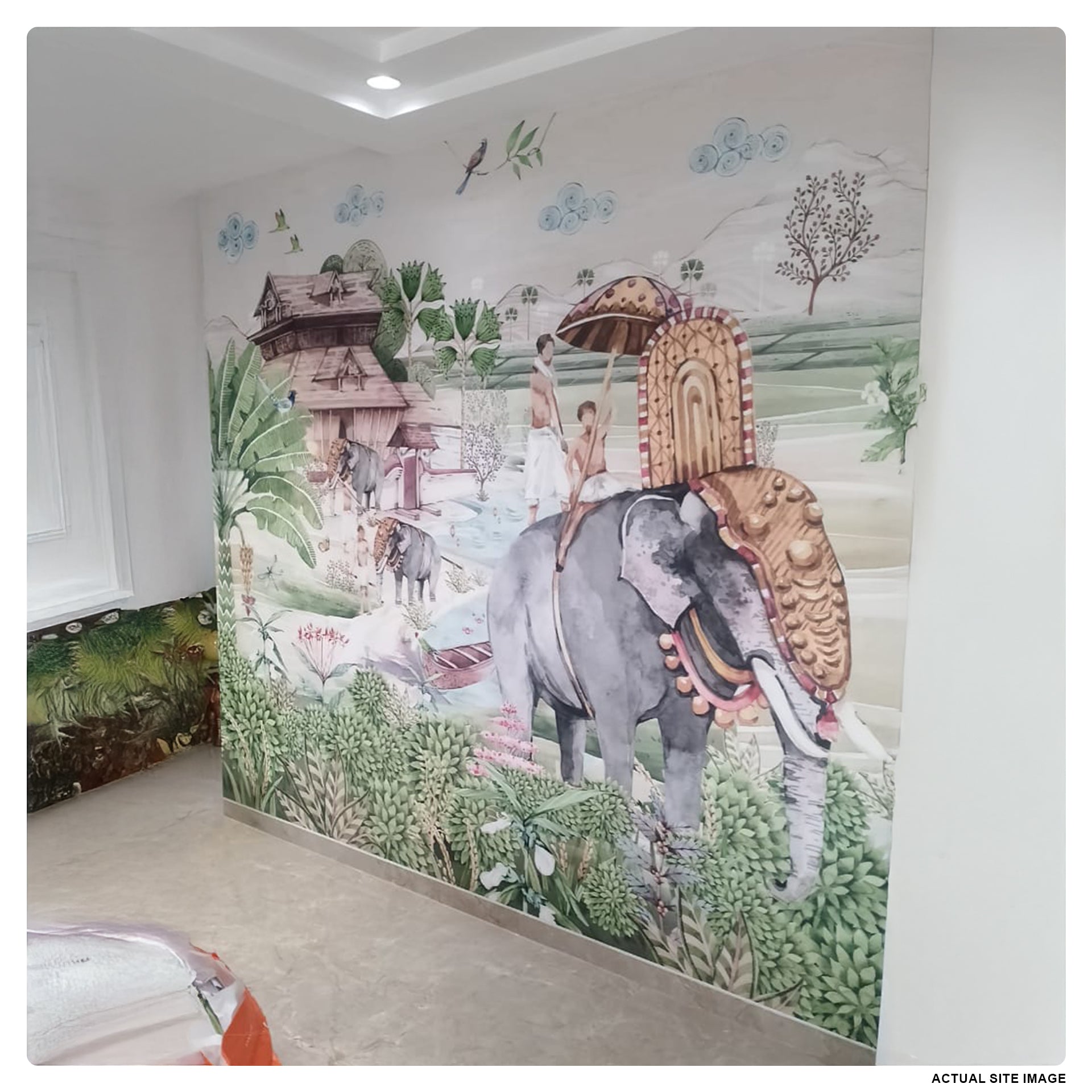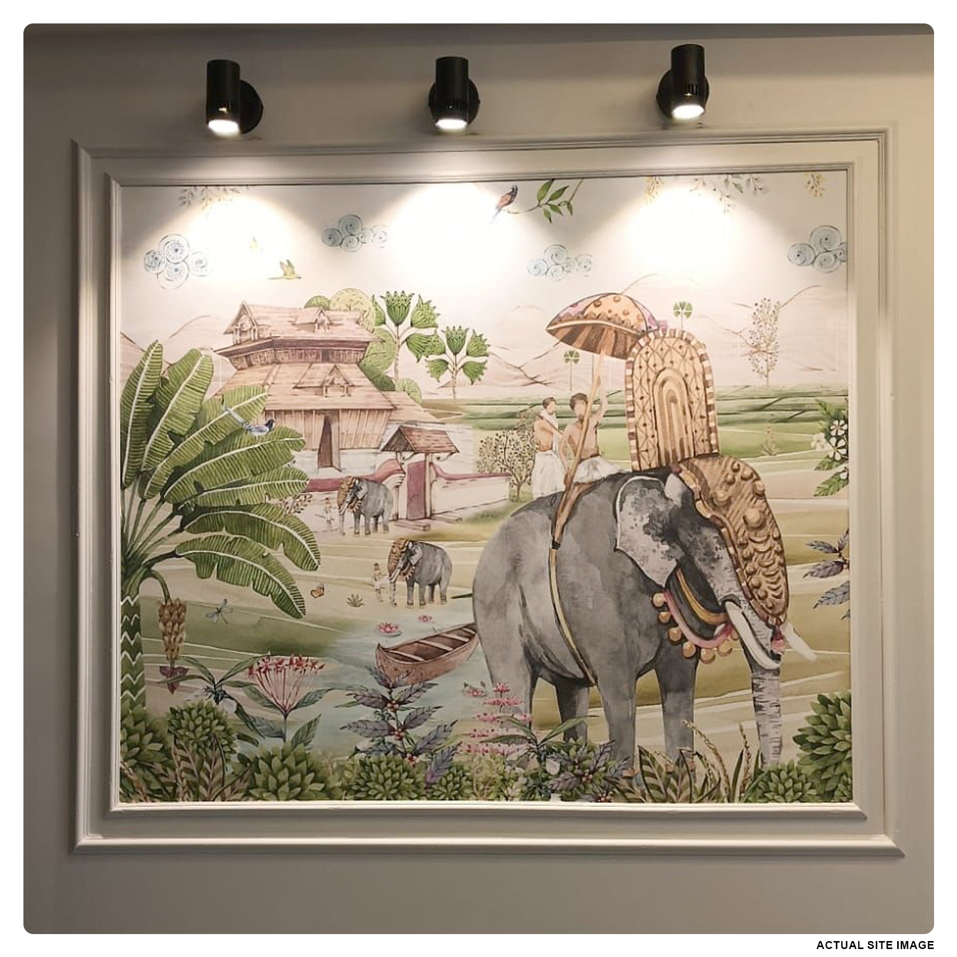Bring the serene beauty of Kerala’s traditional landscape into your space with this stunning wallpaper featuring majestic elephants, tranquil lakes, and lush trees. Perfect for adding cultural charm and natural elegance to any room. Ideal for living rooms, bedrooms, or accent walls, this vibrant wallpaper celebrates Kerala’s rich heritage and scenic beauty.
