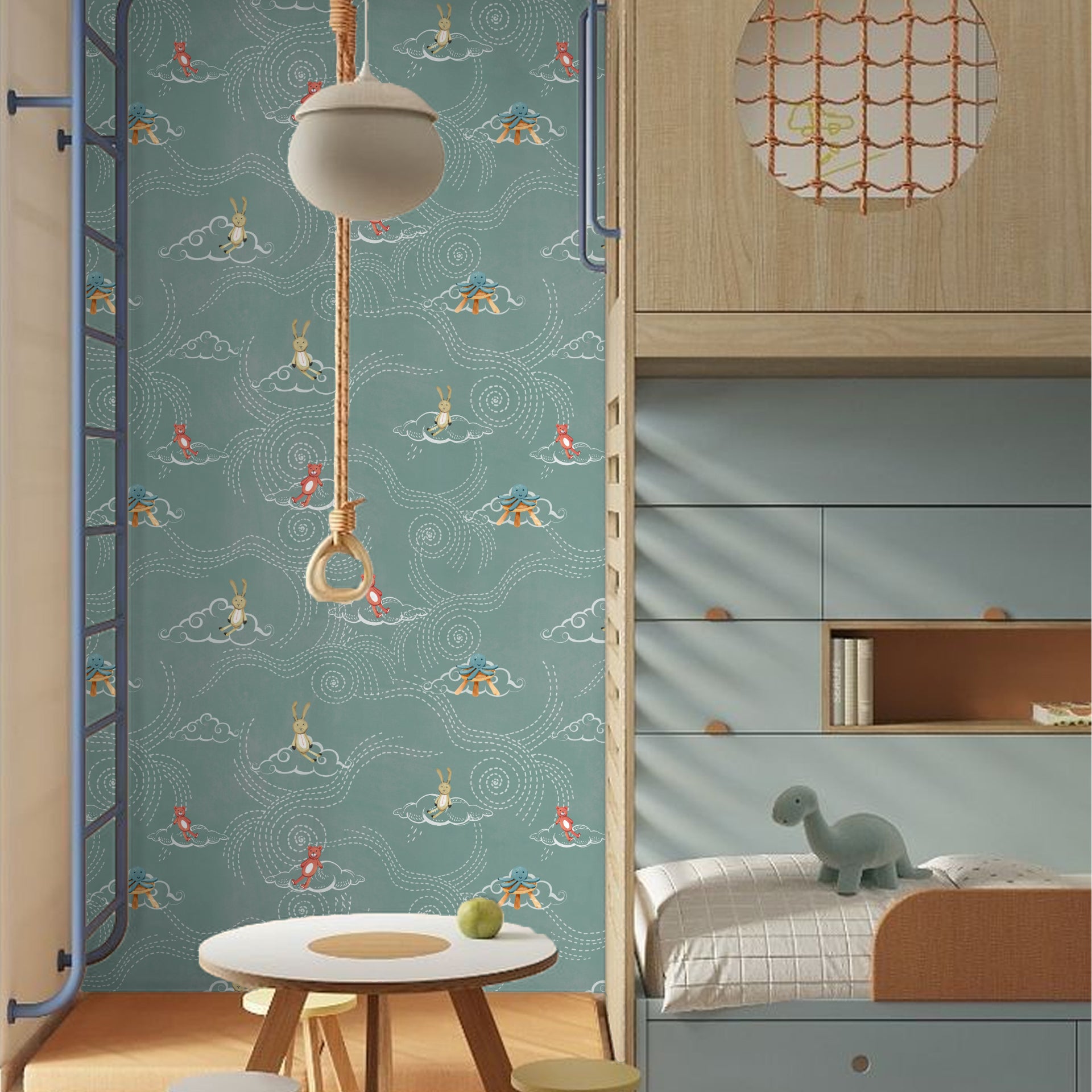 Whimsical Animal Cloud Wallpaper for Kids' Rooms With amusing animals like bears, rabbits, and octopuses floating on clouds over a beautiful teal backdrop.