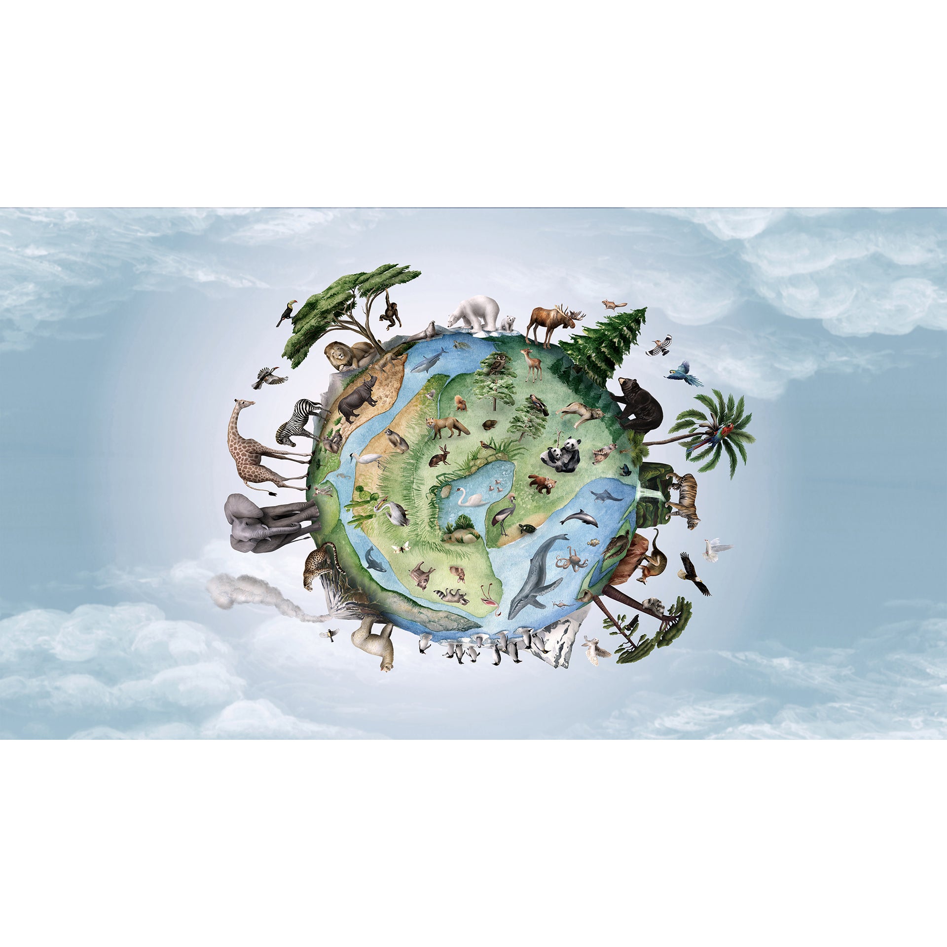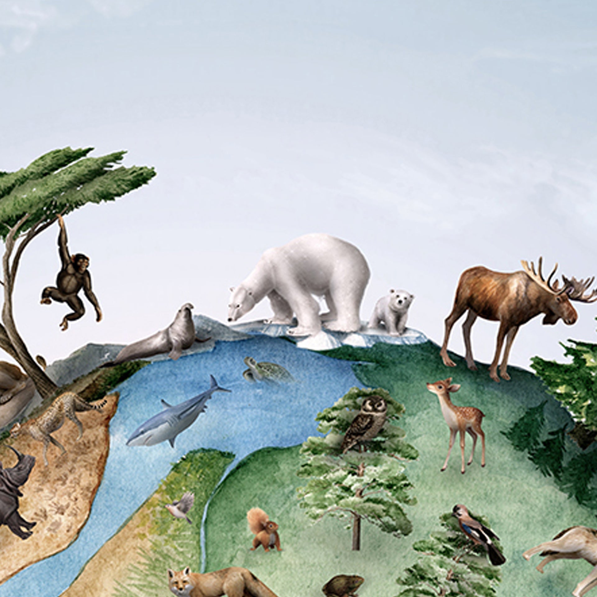 A colorful globe featuring forests, seas, and wildlife, with diverse life forms circling the planet. Symbolizes biodiversity, environmental awareness, and the interconnected ecosystems that sustain our world.