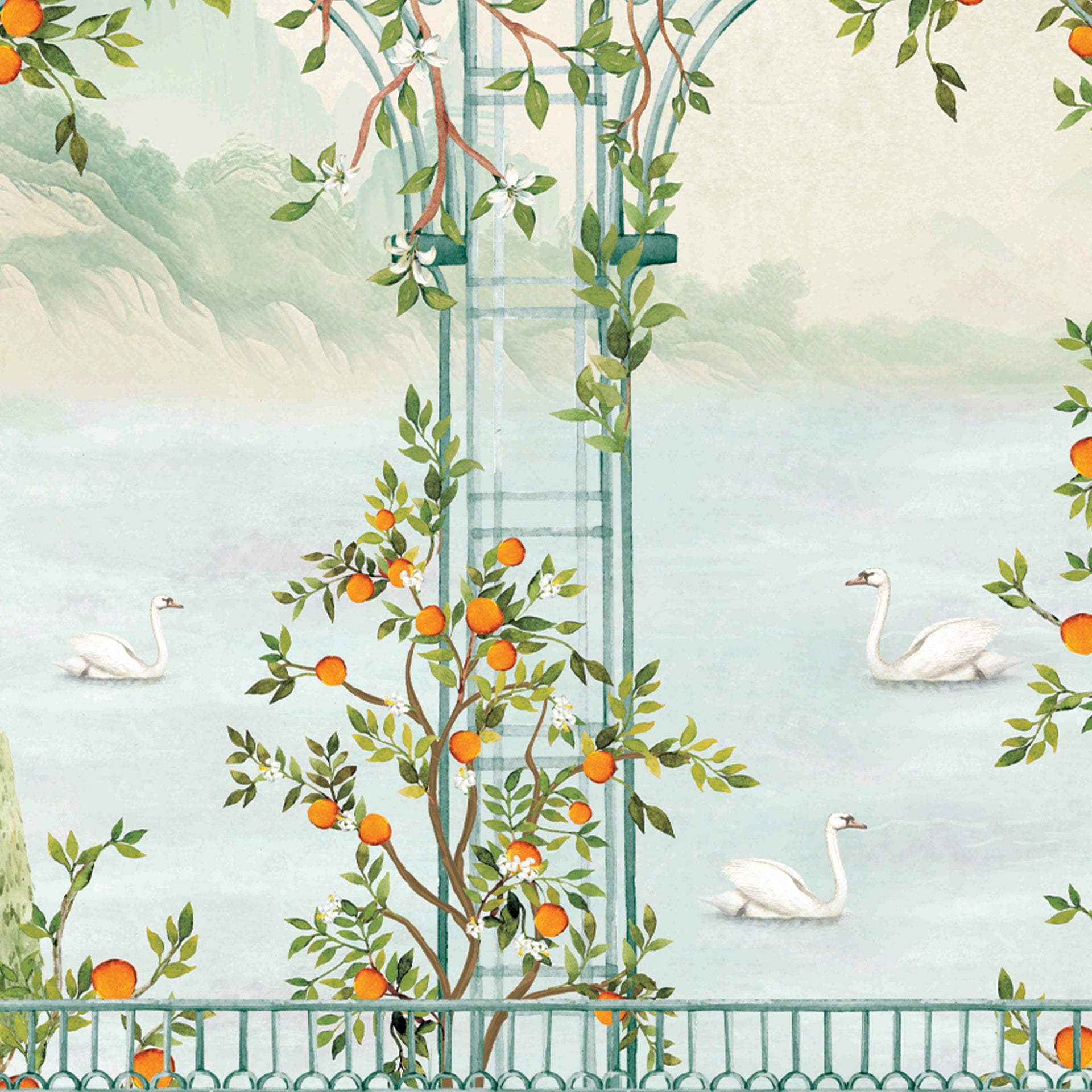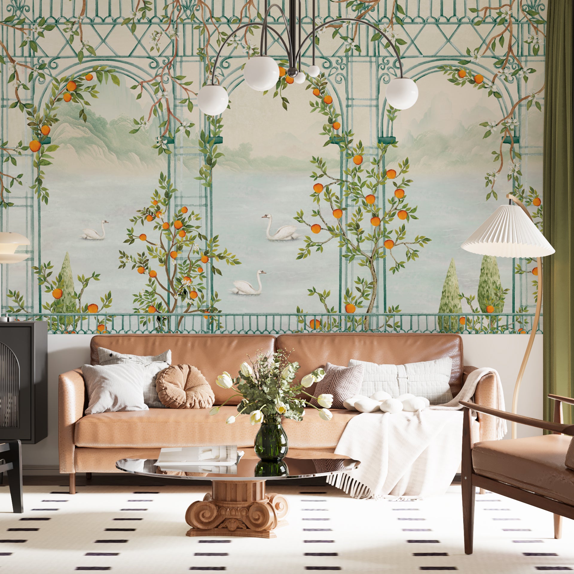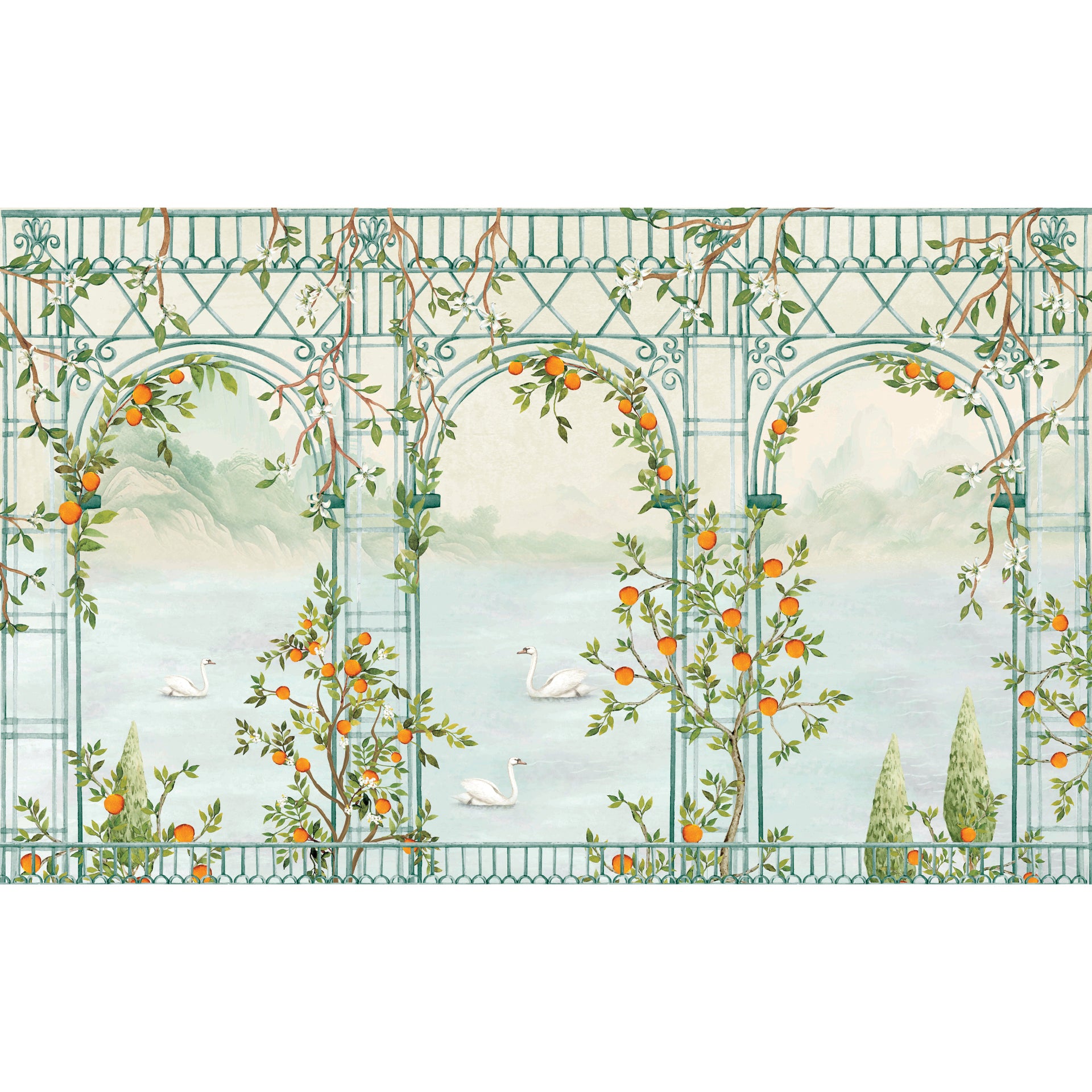 Charming illustration of ornate archways framing a peaceful lake with swans. Lush orange trees in bloom decorate the foreground, creating a scenic view combining nature and intricate architectural elements.