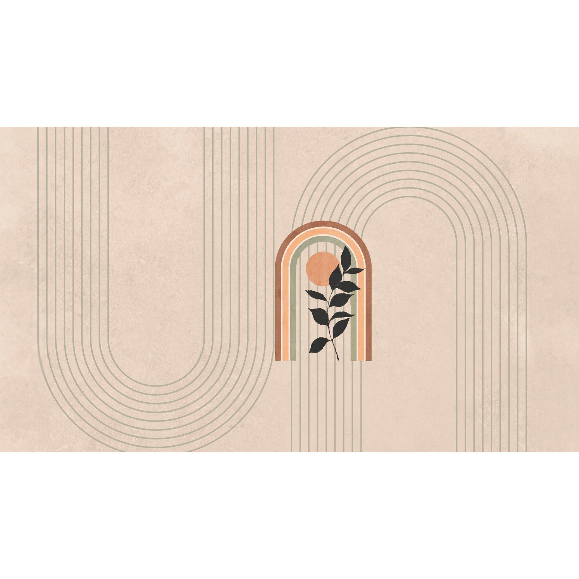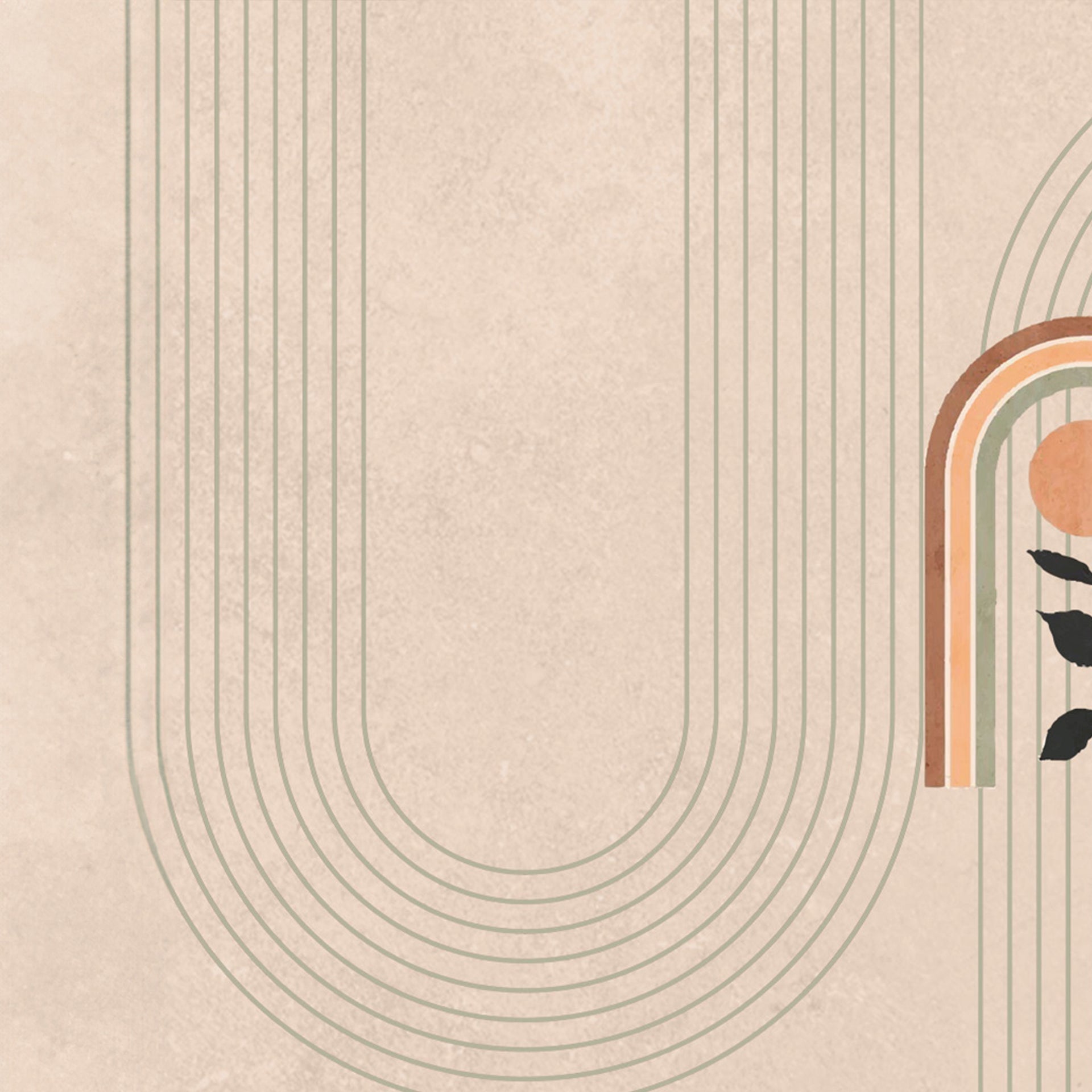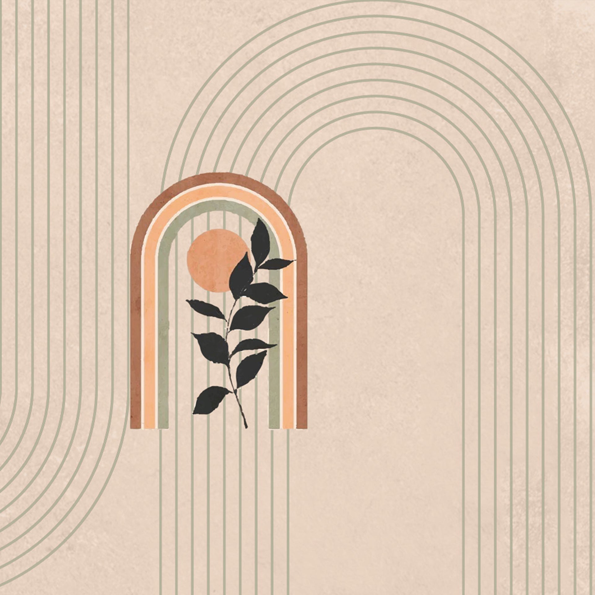 Abstract illustration featuring geometric lines, earthy tones, and botanical elements. This modern art piece combines plant imagery and sun symbolism, creating a serene and stylish visual experience.