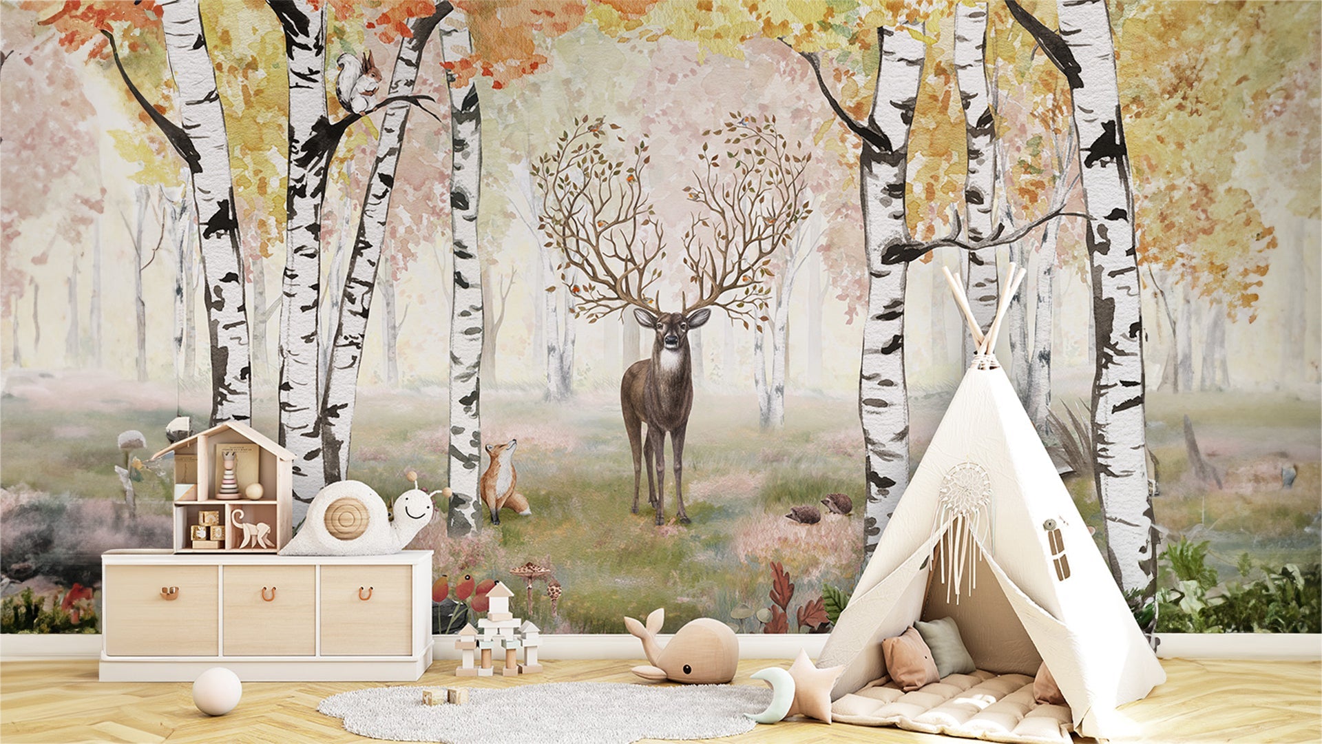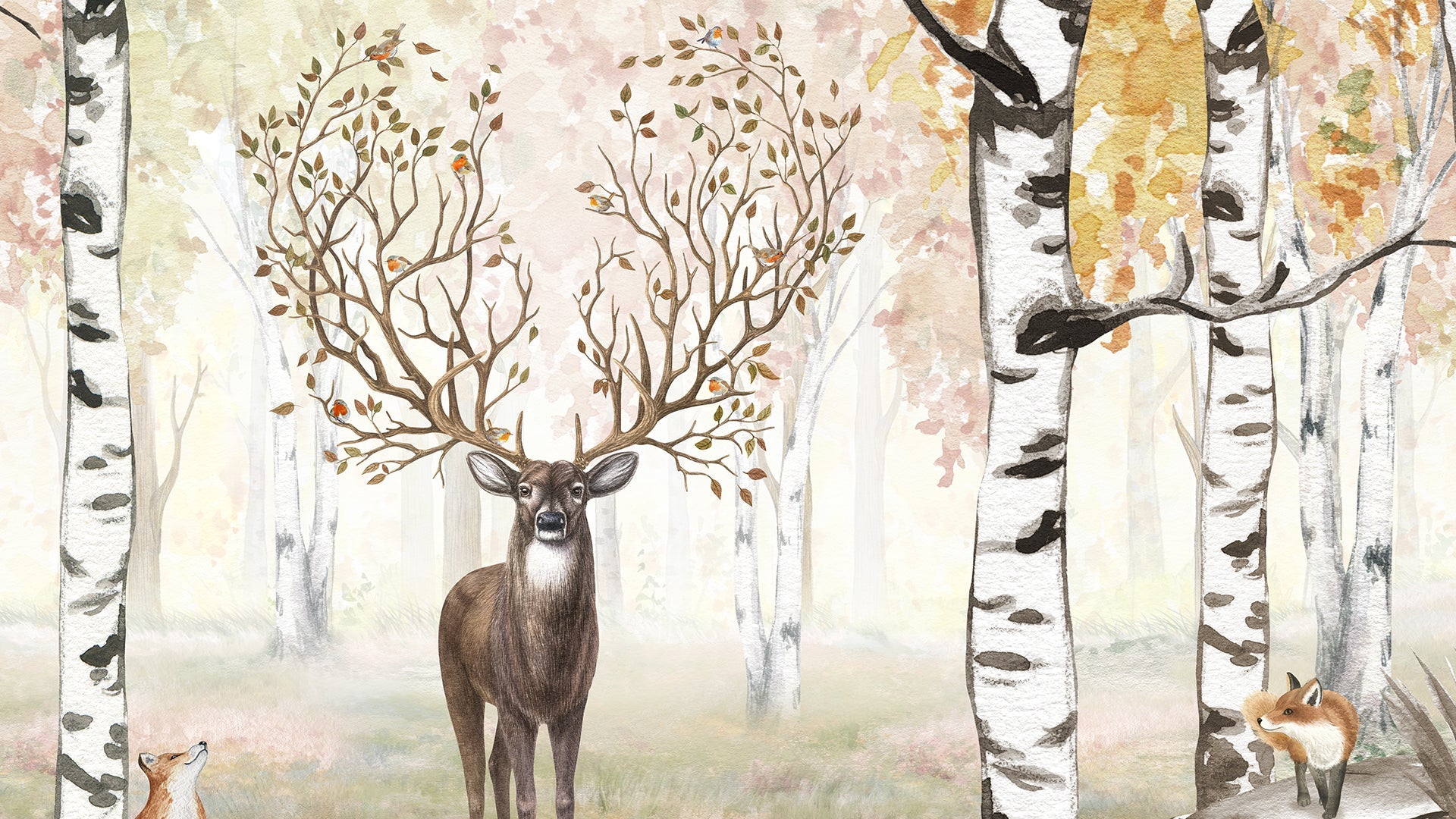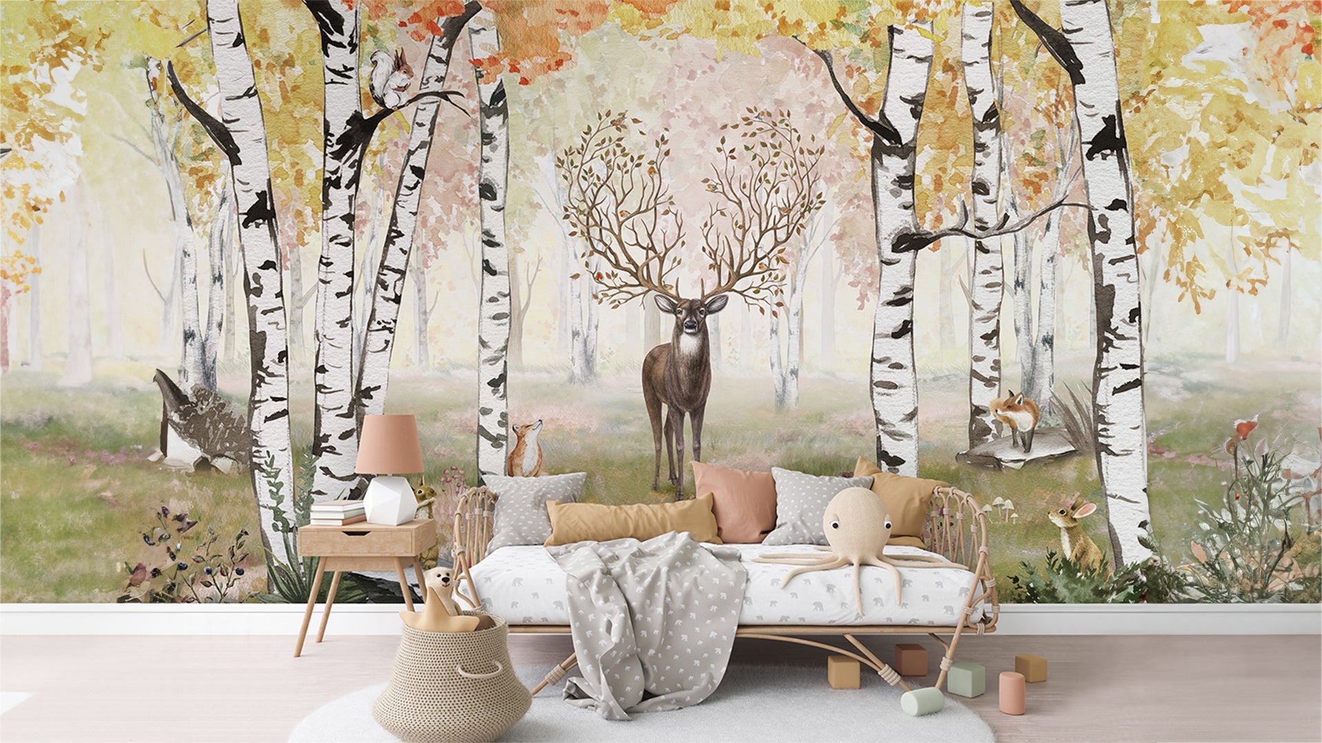 Stag in forest Wallpaper for walls featuring deer, fox, and rabbit for a nature-inspired, calming atmosphere.