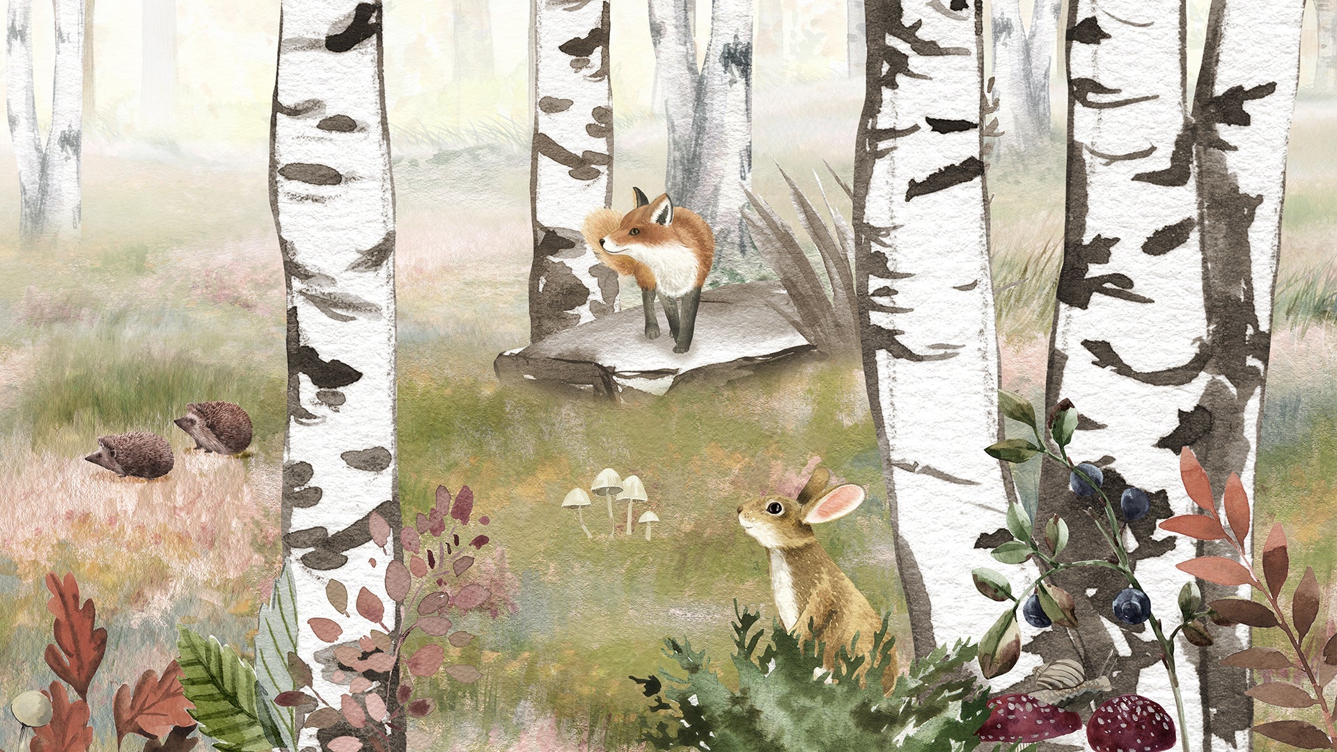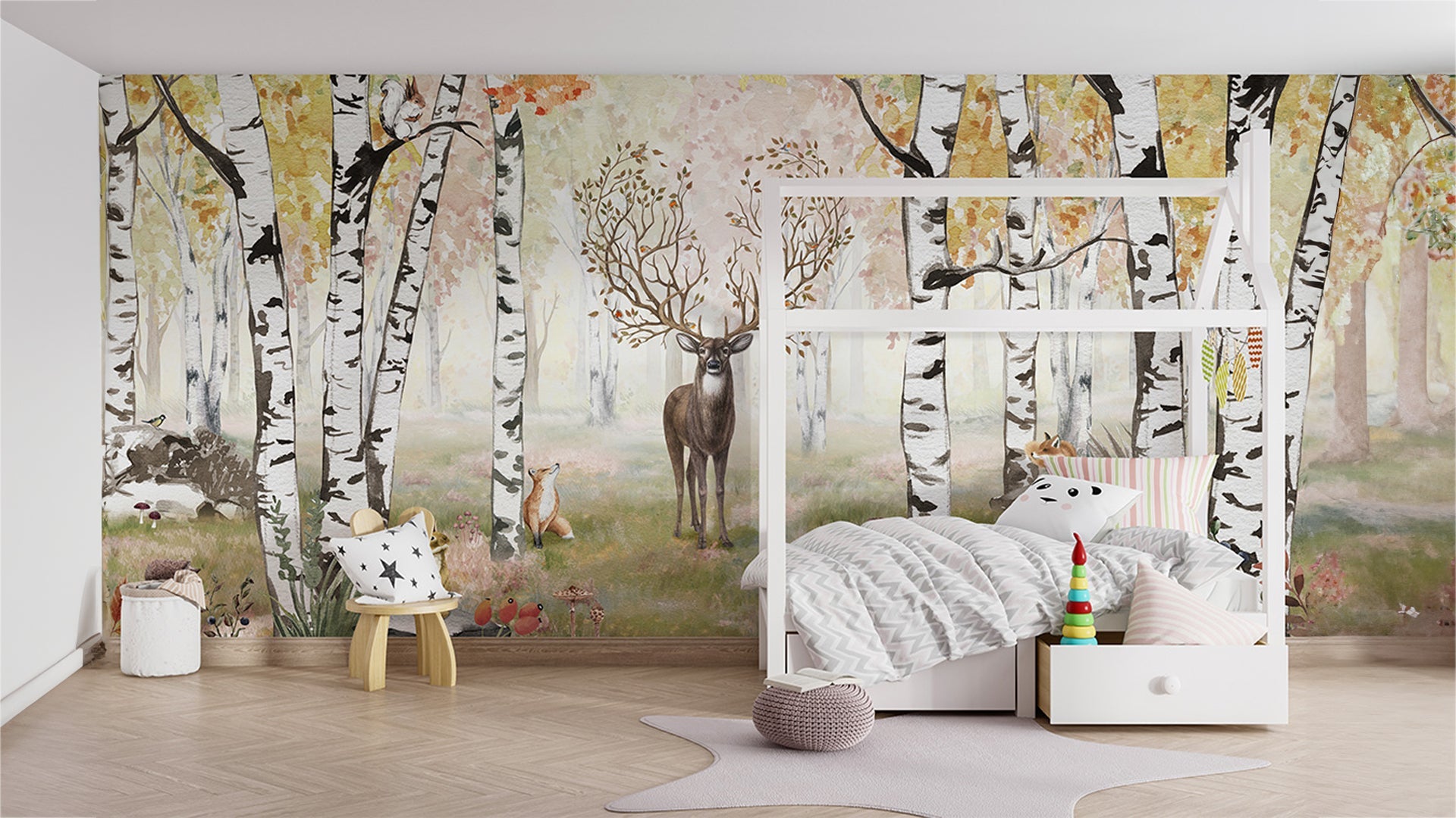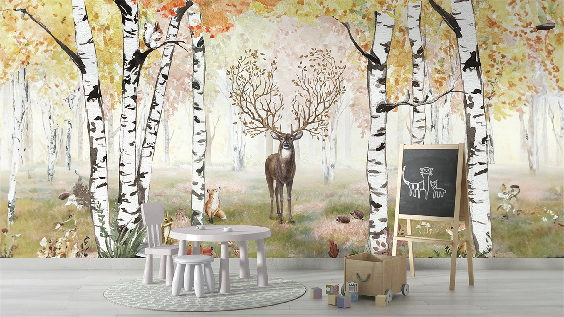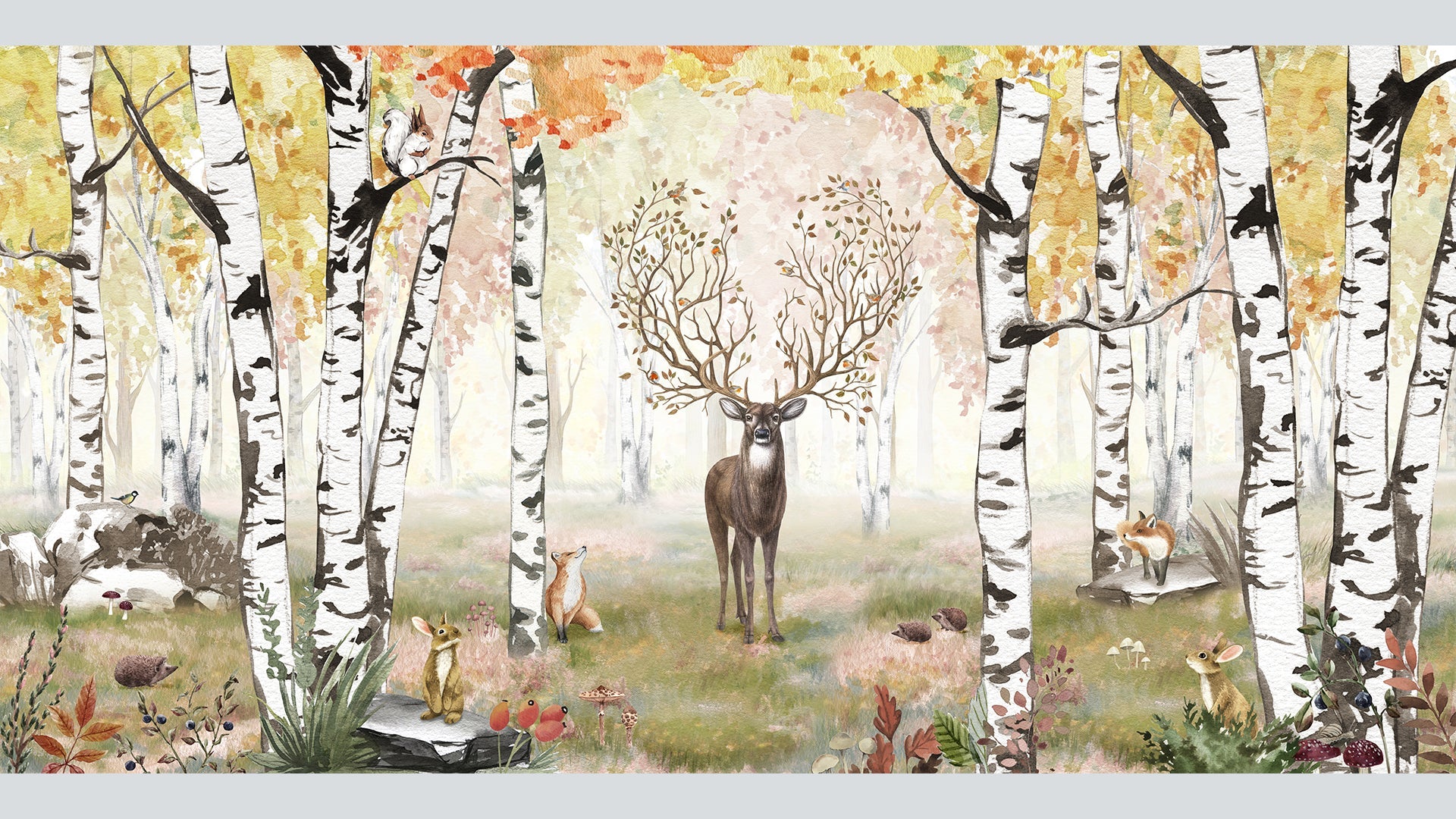 Stag in forest Wallpaper for walls featuring deer, fox, and rabbit for a nature-inspired, calming atmosphere.