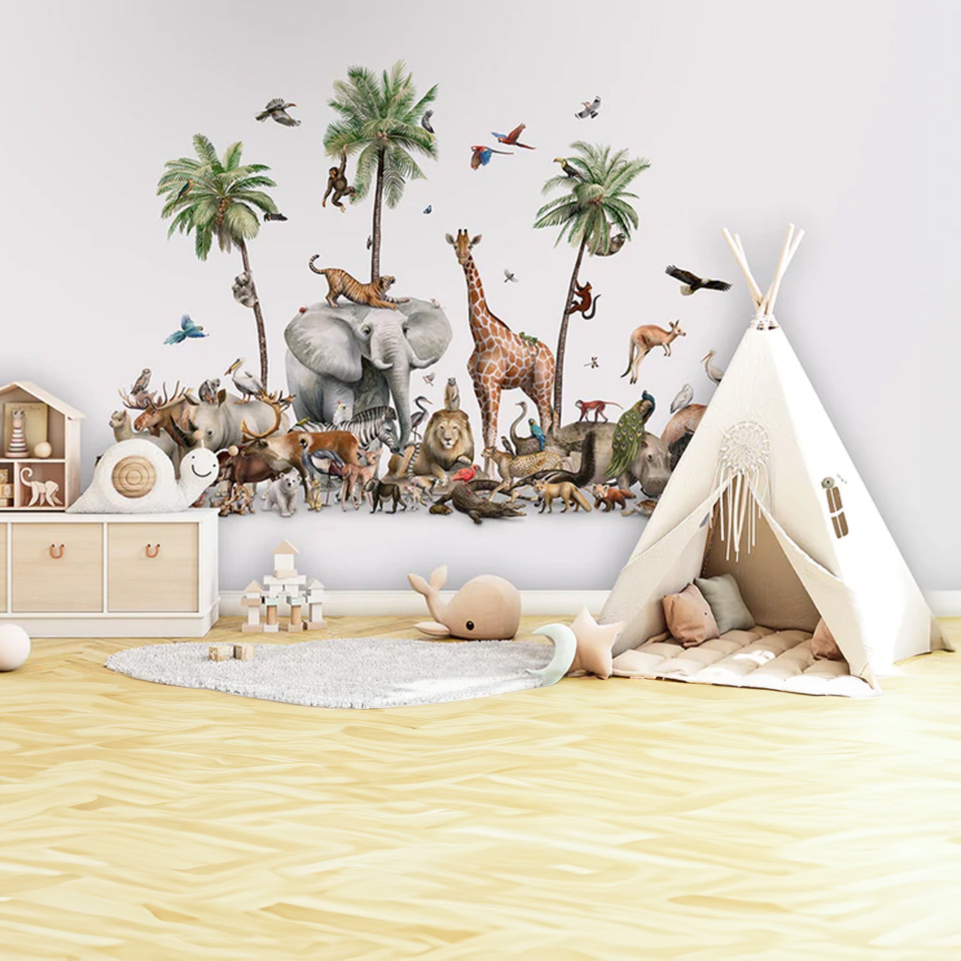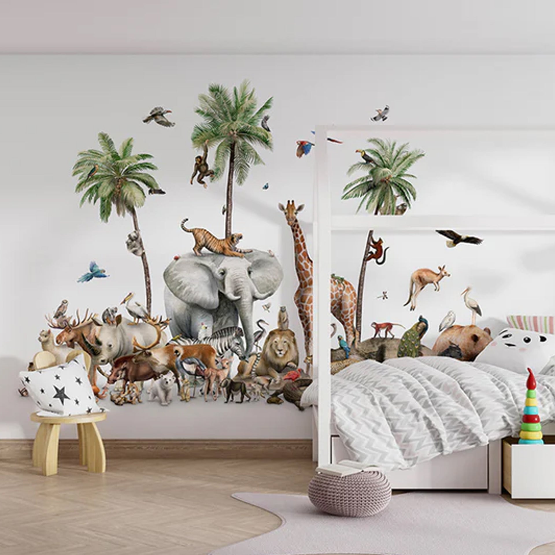 A lively, colorful scene featuring a variety of wildlife in a jungle setting. Elephants, giraffes, lions, tigers, and a swarm of birds create a rich, family-friendly panorama of nature’s diversity.