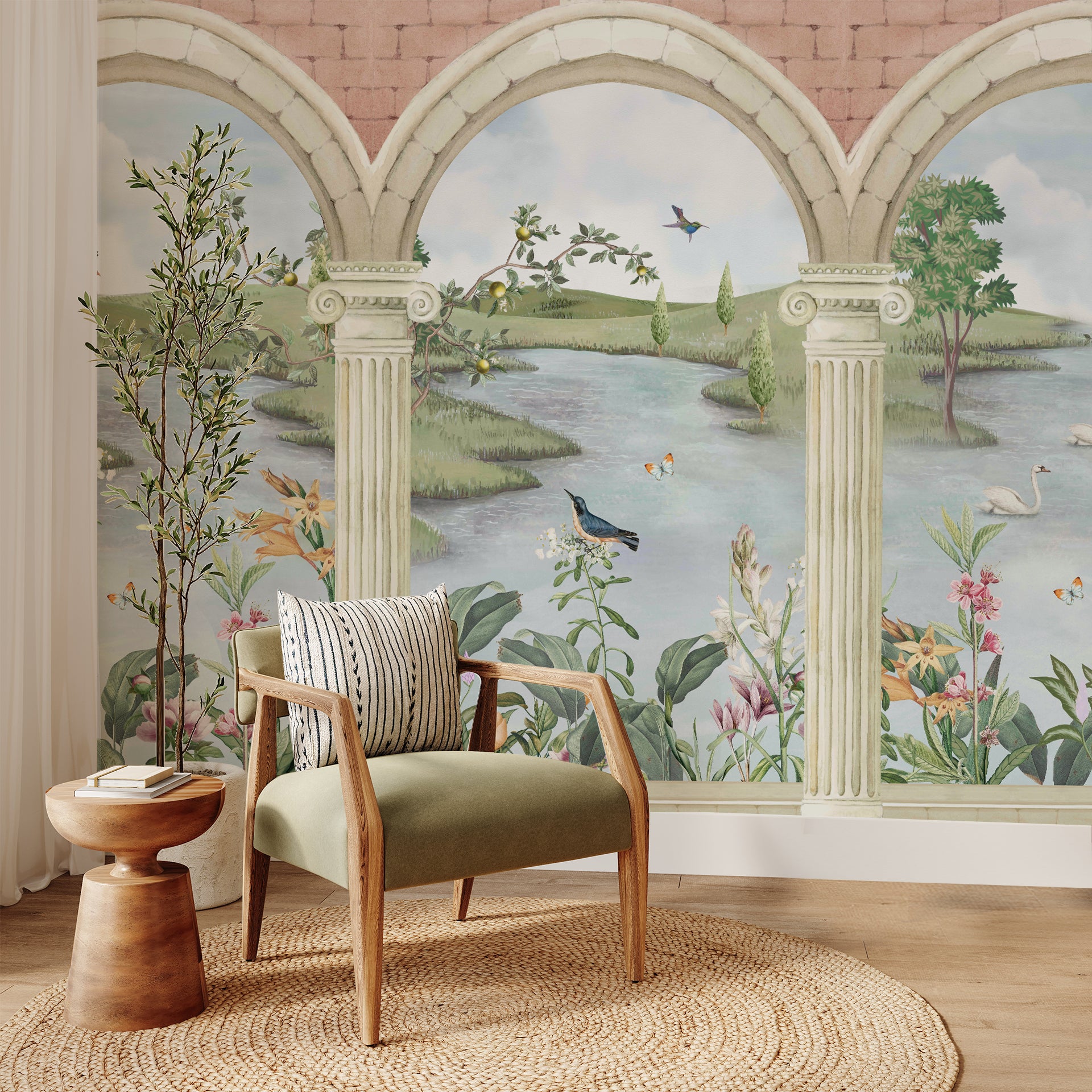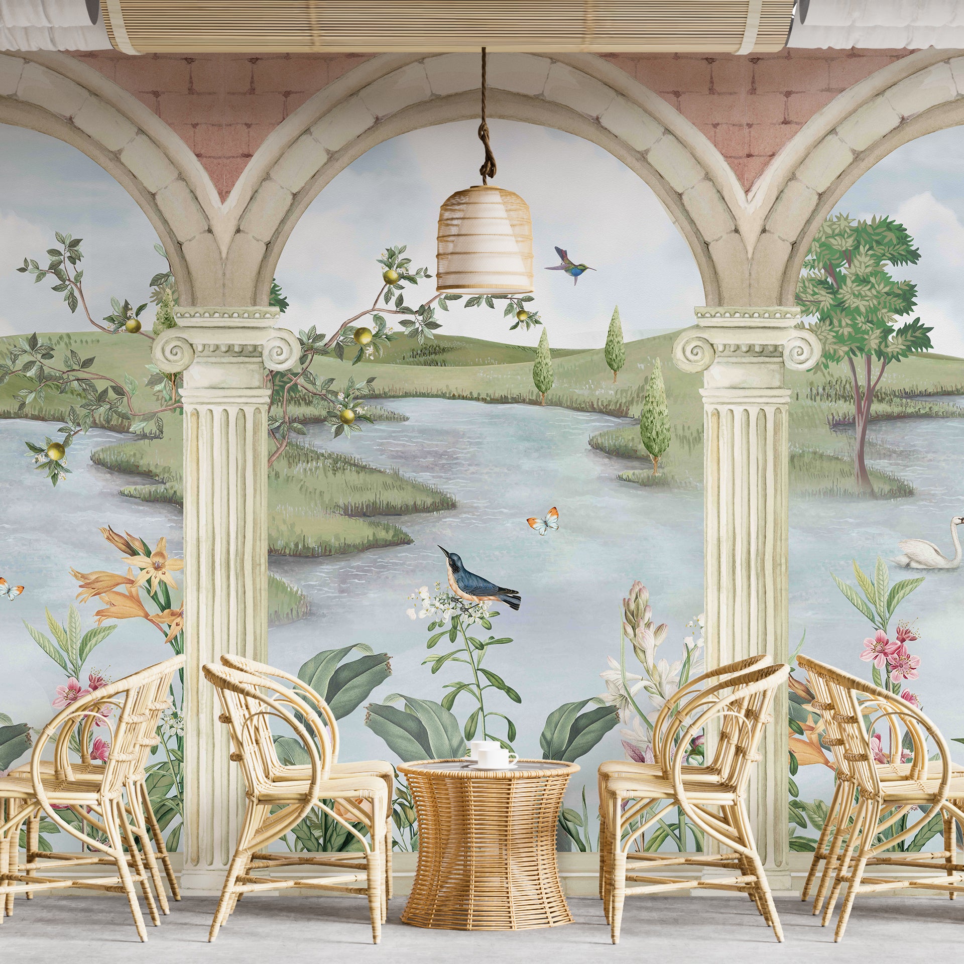 Serene scenery featuring a tranquil river, green landscape, and vibrant flowers framed by classical arches, creating a peaceful and idyllic view.